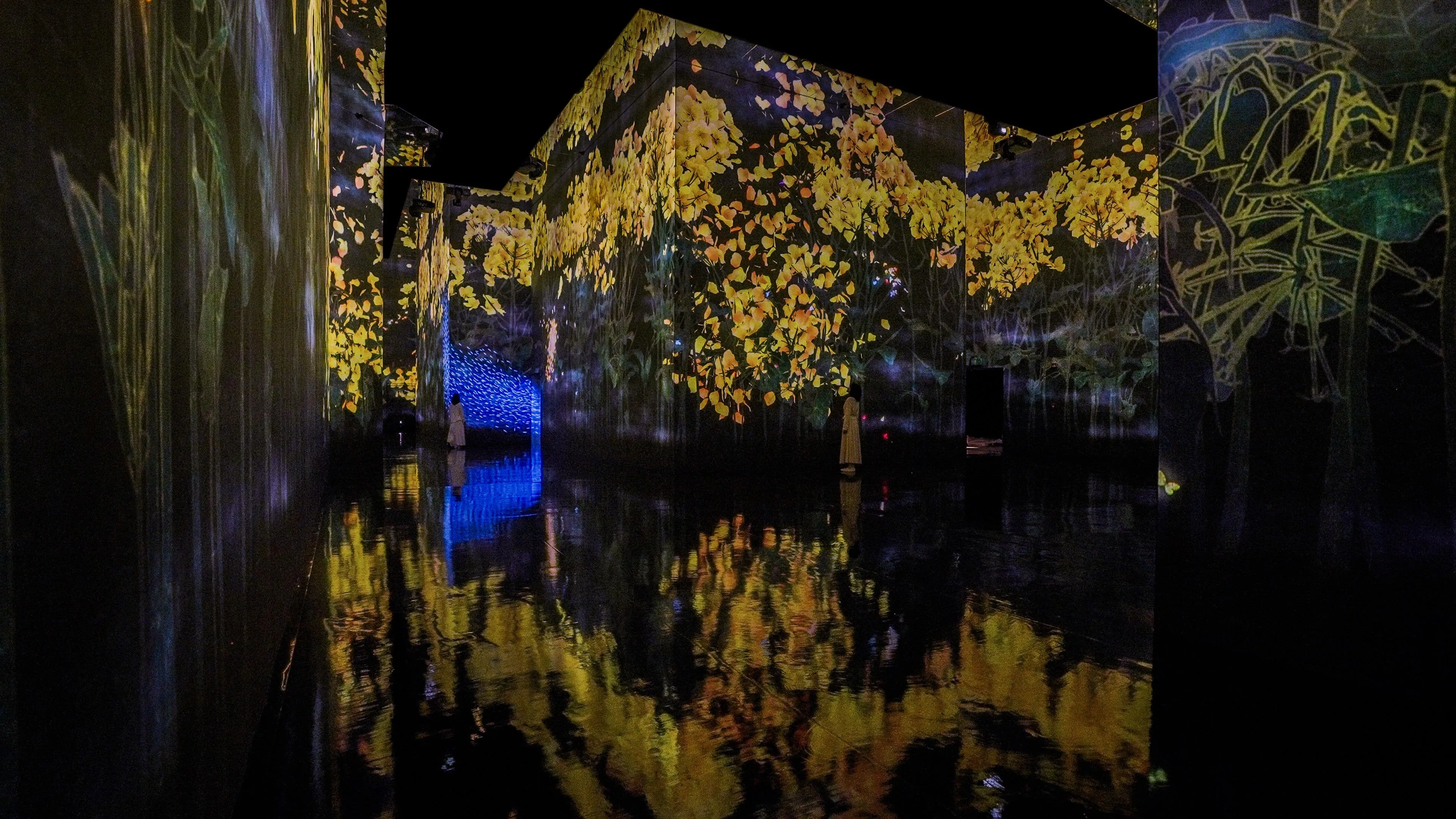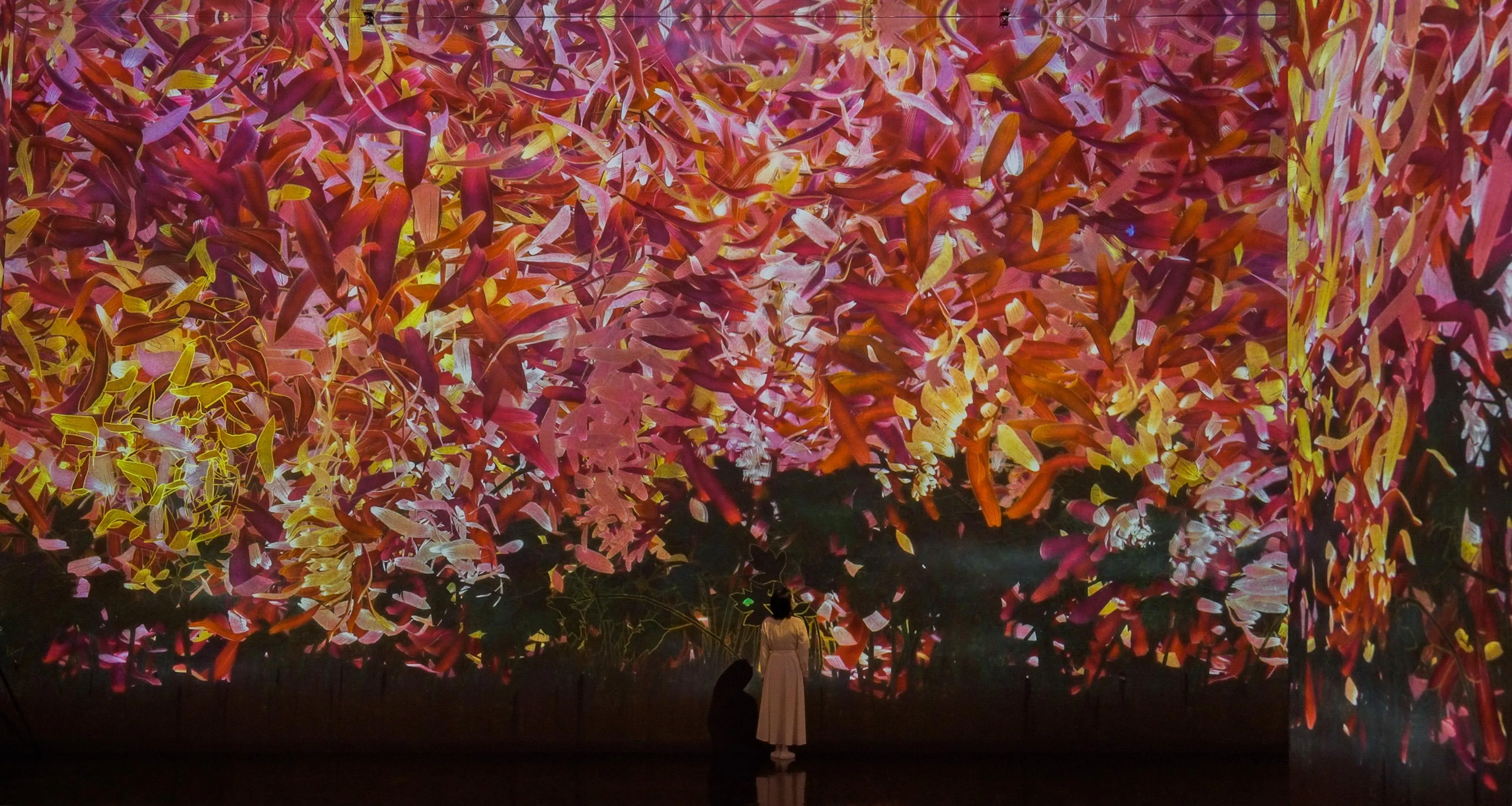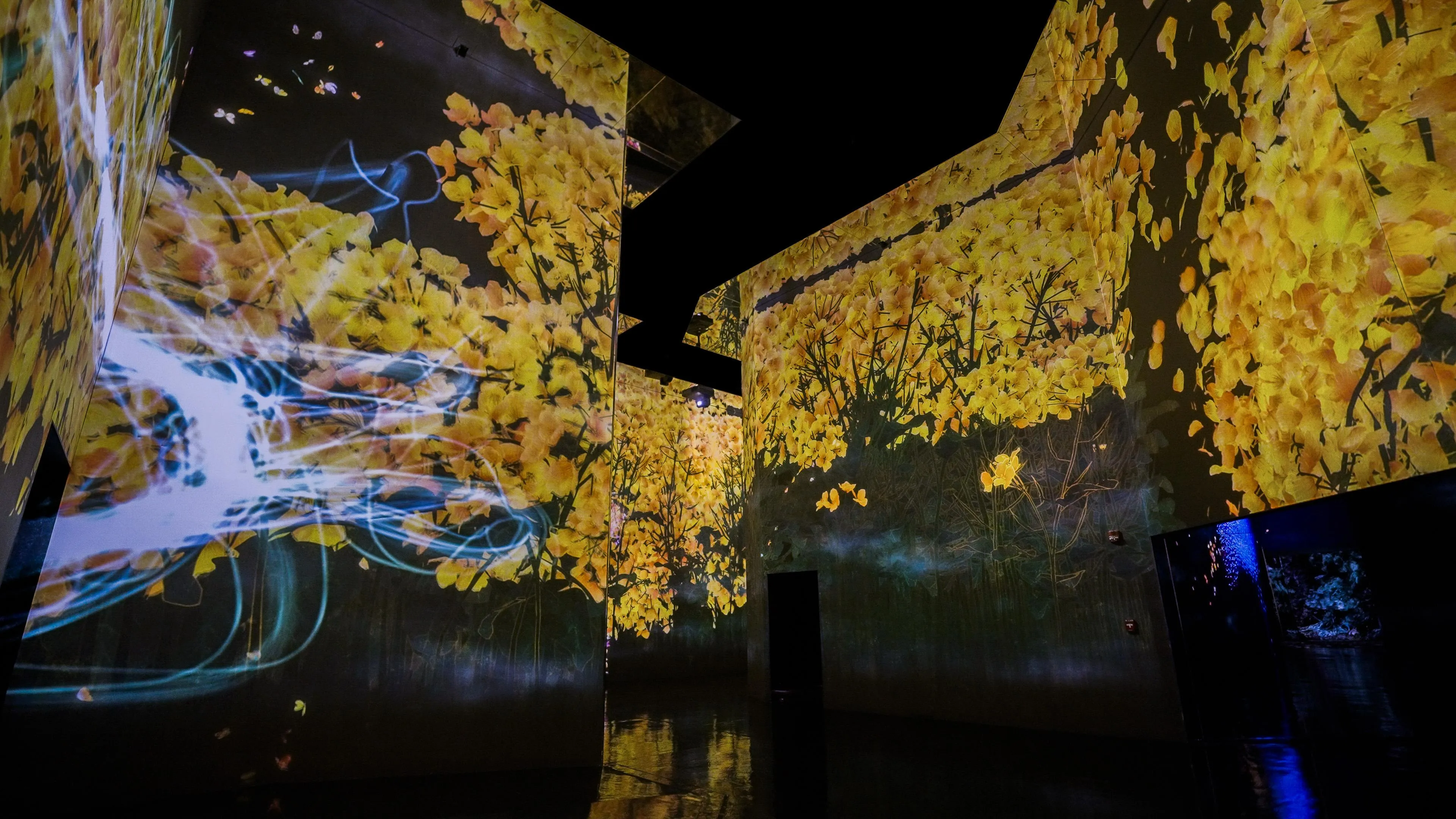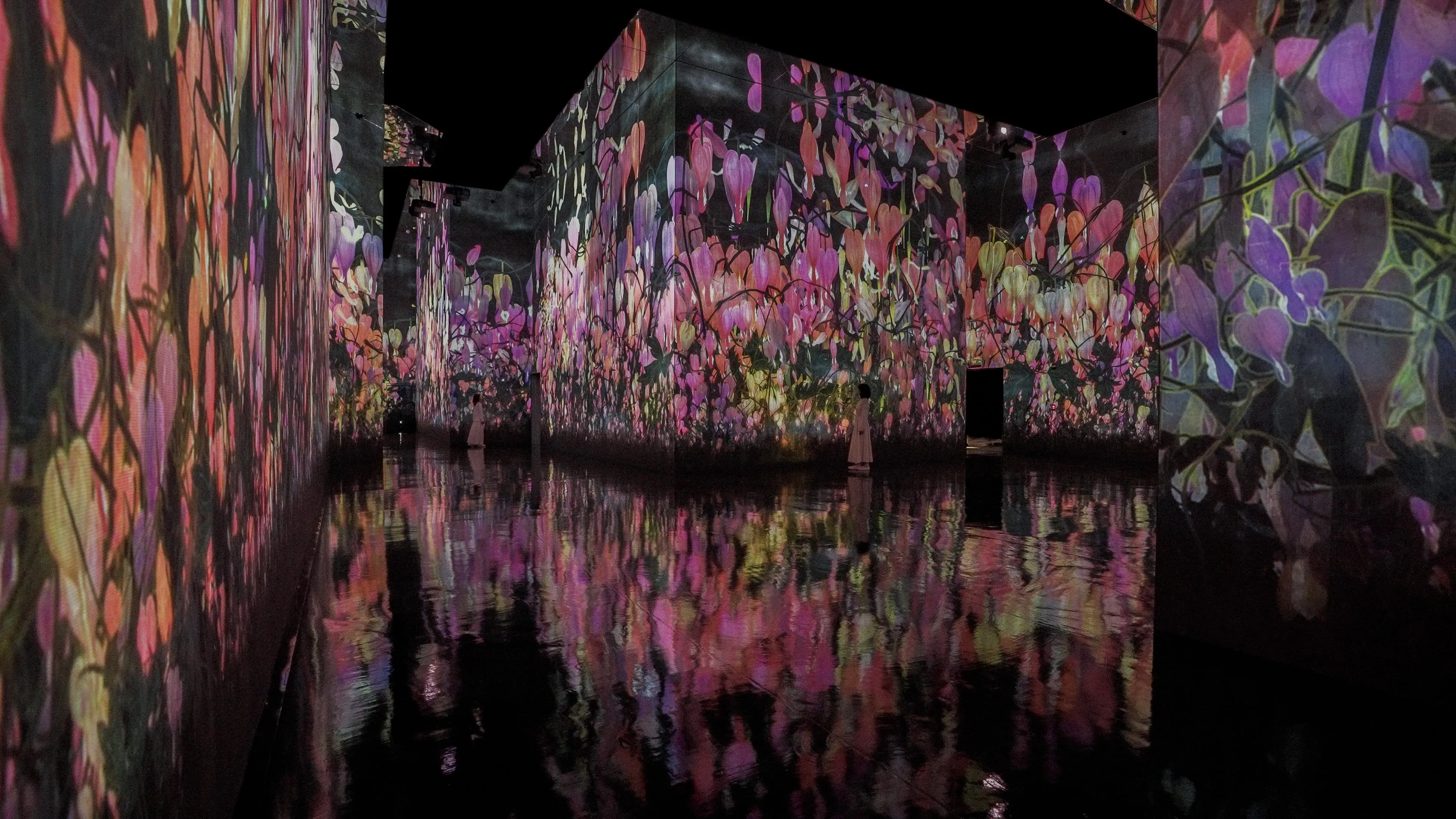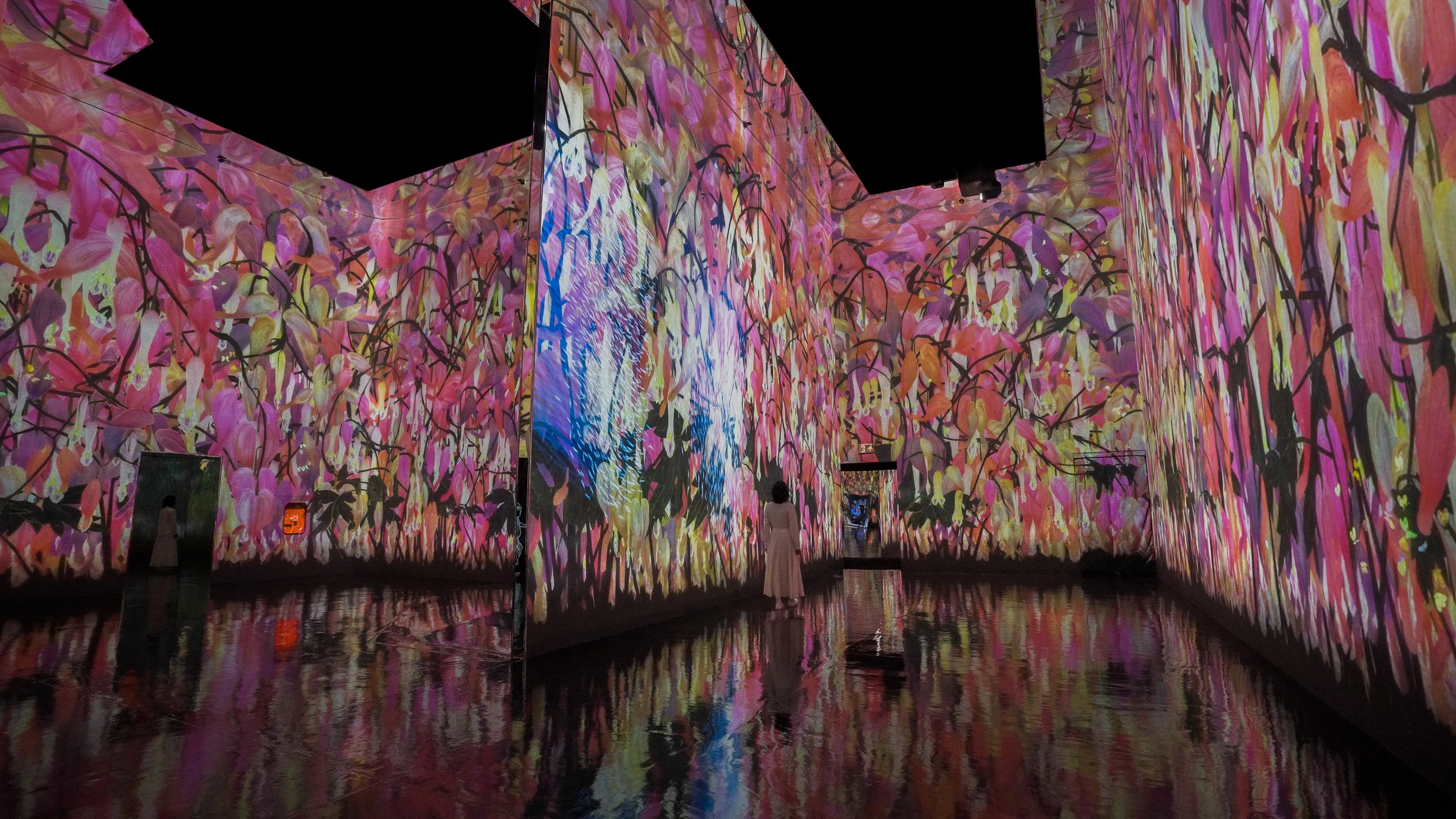 作品的世界,是基于teamLab所发想的「超主观空间」理论平面化而来的,因此不同于由镜头或透视法平面化而来的空间,观赏者的视角不会被固定,身体也会变得自由可动。映出作品世界的墙壁不会成为我们与作品的界线,花与作品的边界面变得模糊,作品世界与人们身体所在的空间互相连续。