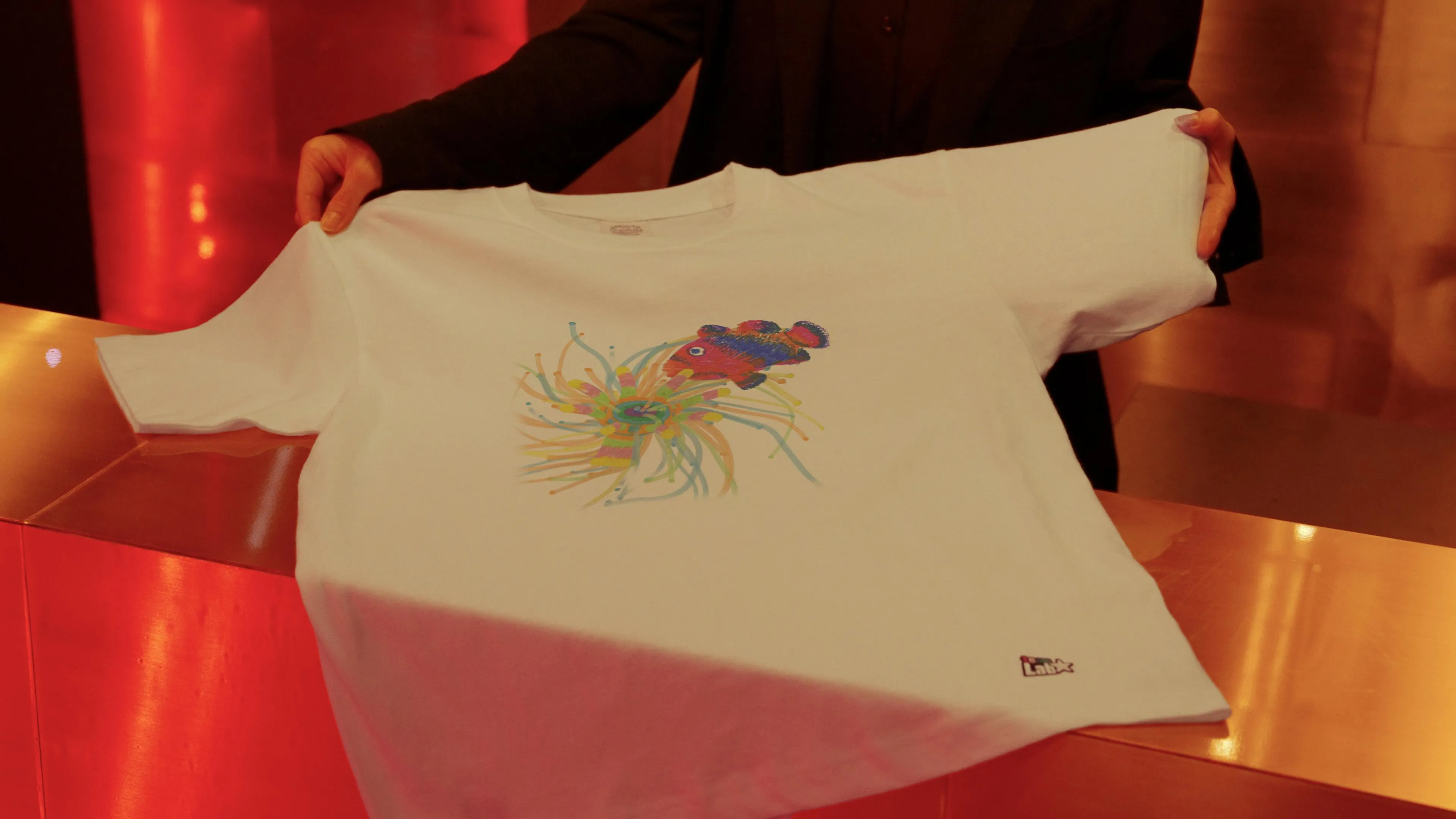 您可以在《彩绘海洋》的作品中选择图案,然后在《彩绘工厂》下订单。接着,您所绘制的鱼将在《彩绘工厂》内现身。当纪念品接近完成时,这些鱼将逐渐消失并进入打印机,最终制成徽章、手巾、T恤、和单肩包。