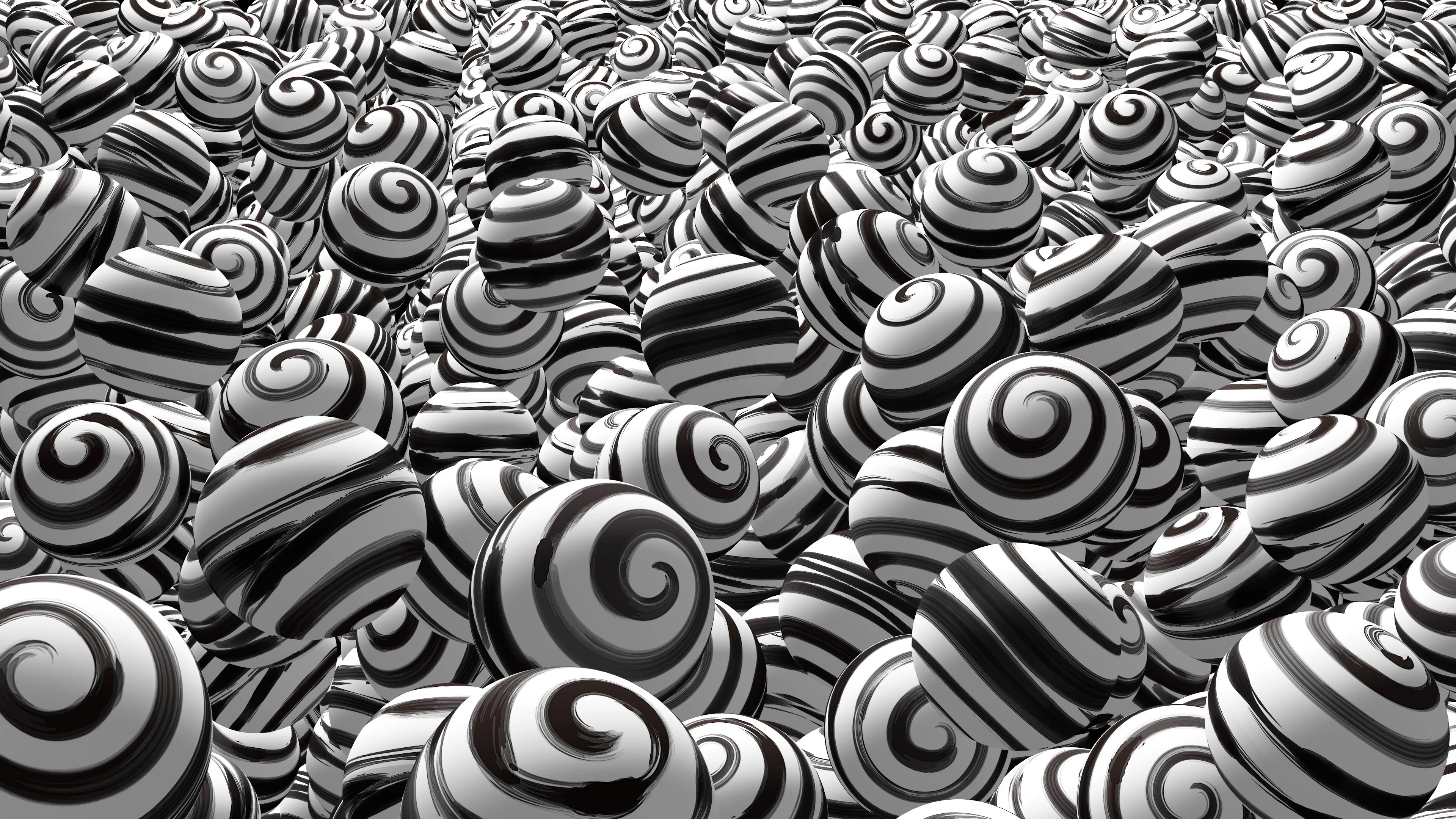 We reinterpreted the blue ocean waves in three dimensions and drew whirlpools on a sphere so that the blue ocean waves are seen from the side and the whirlpools are seen from above. The spheres in free rotation are arranged in an orderly fashion. (Image: Perspective)