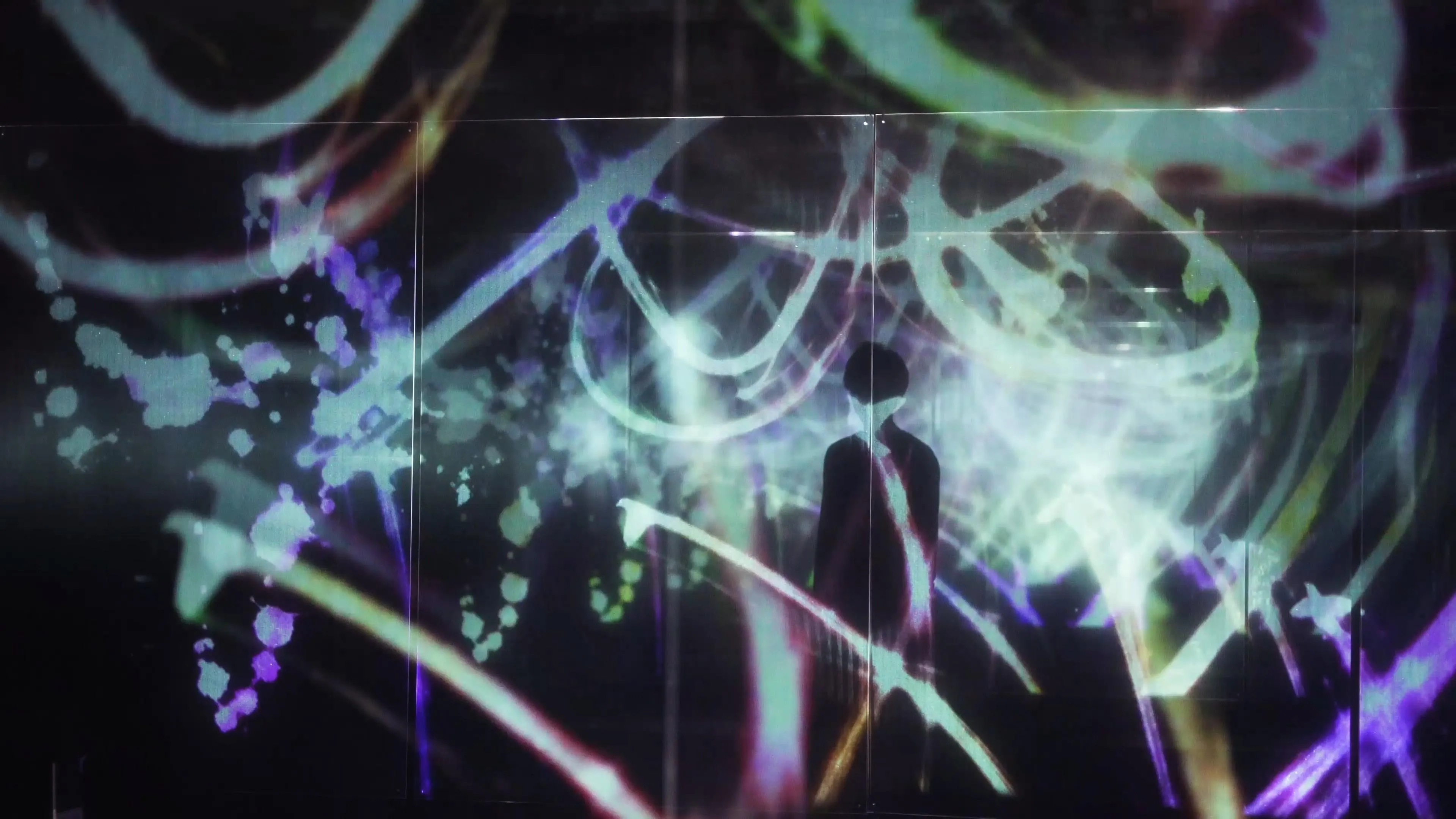 Flocks of mythical crows (Yatagarasu) rendered in light fly around the space leaving trails in their wake and forming Spatial Calligraphy. The chasing crows are eventually chased themselves, and form flowers when they crash into each other, scattering their petals.