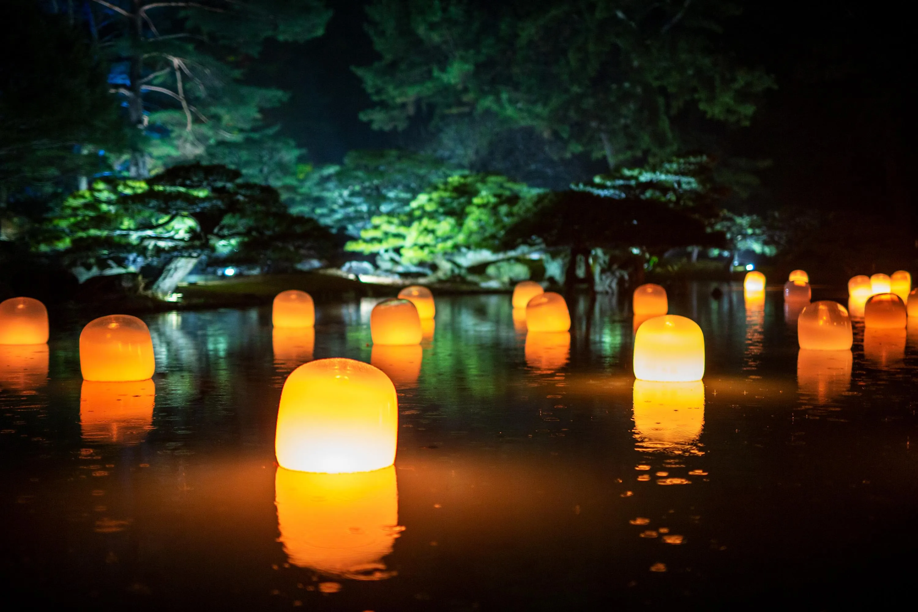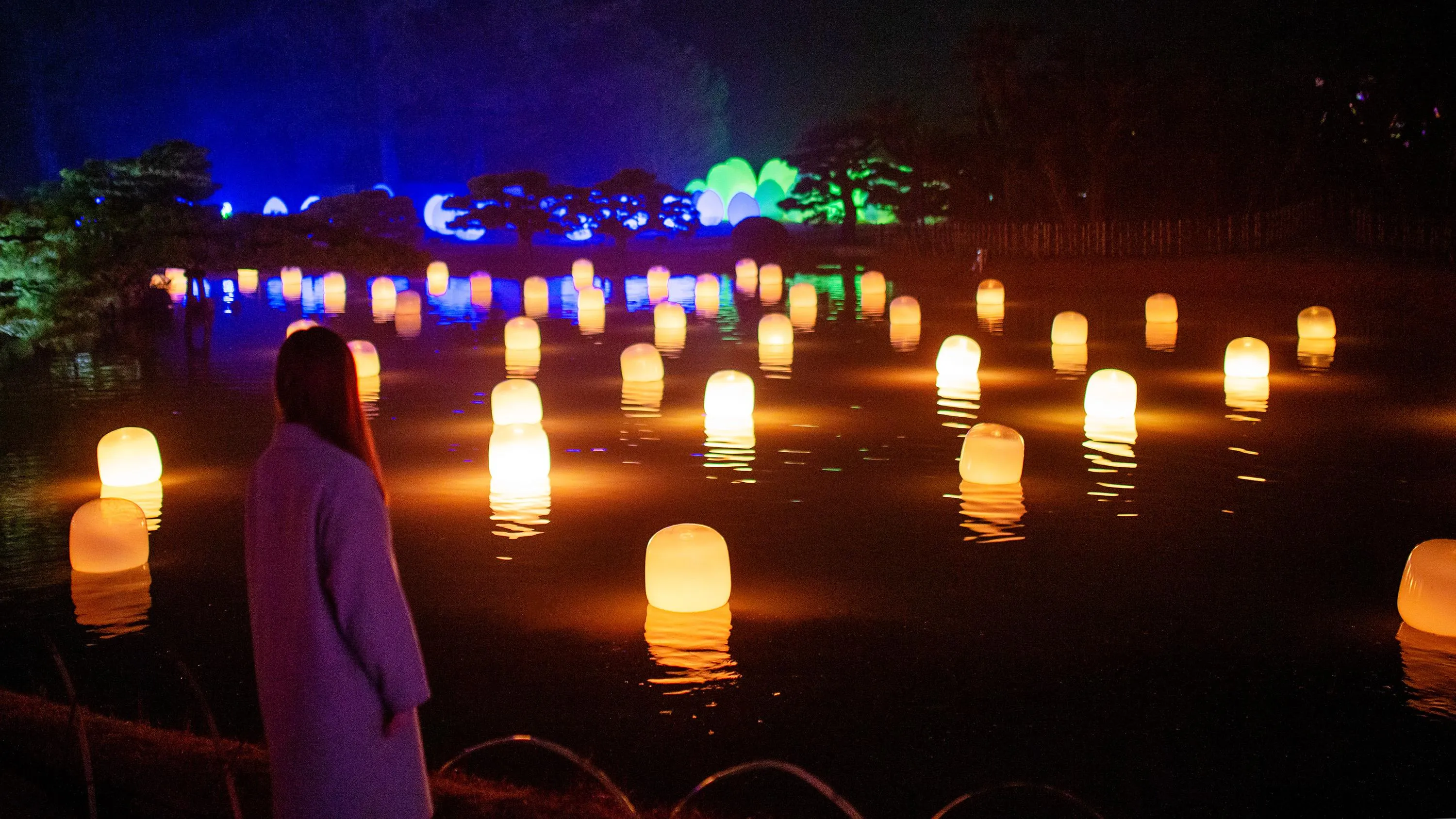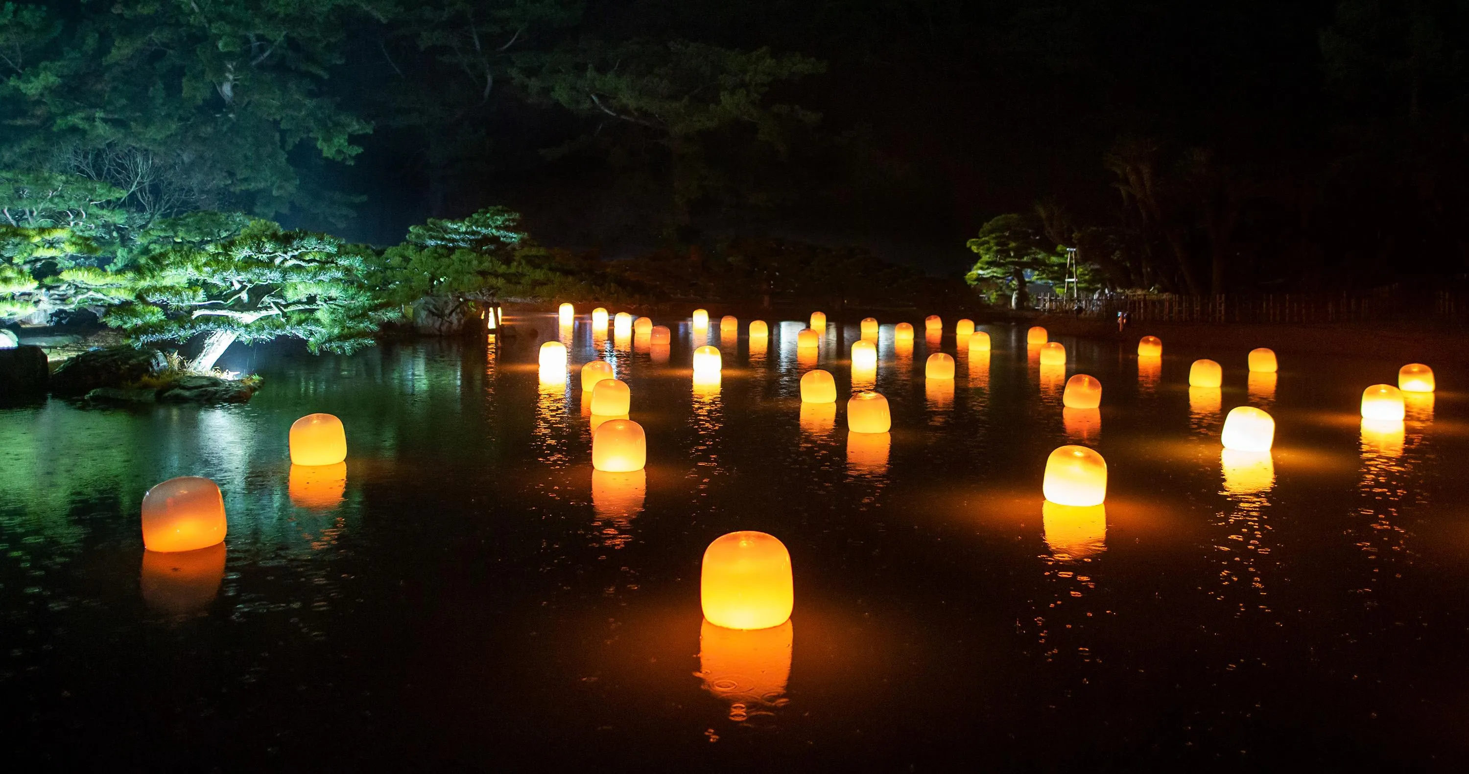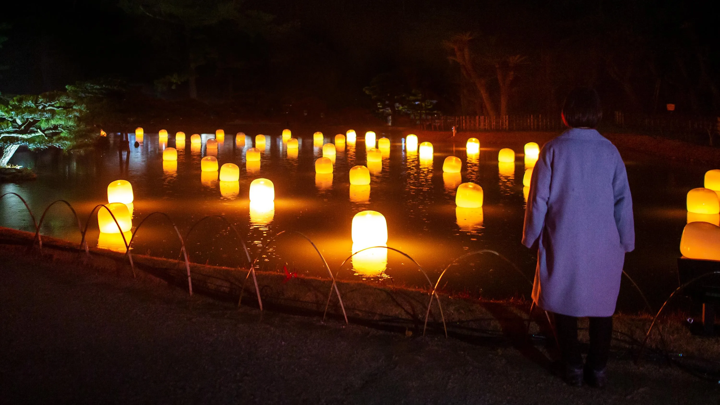 Each of the lamps on the water’s surface floats autonomously. When a person stands still near a lamp, or when the wind blows a lamp, it shines brightly and emits a sound. The light of that lamp is transmitted to nearby lamps one by one, as the sound is continuously emitted. The transmitted light always travels through each of the lamps only once, shining brightly, as it propagates through all of the lamps, continuing on to Life is Continuous Light on the island in the center of the pond. People become aware of the presence of others in the same space.