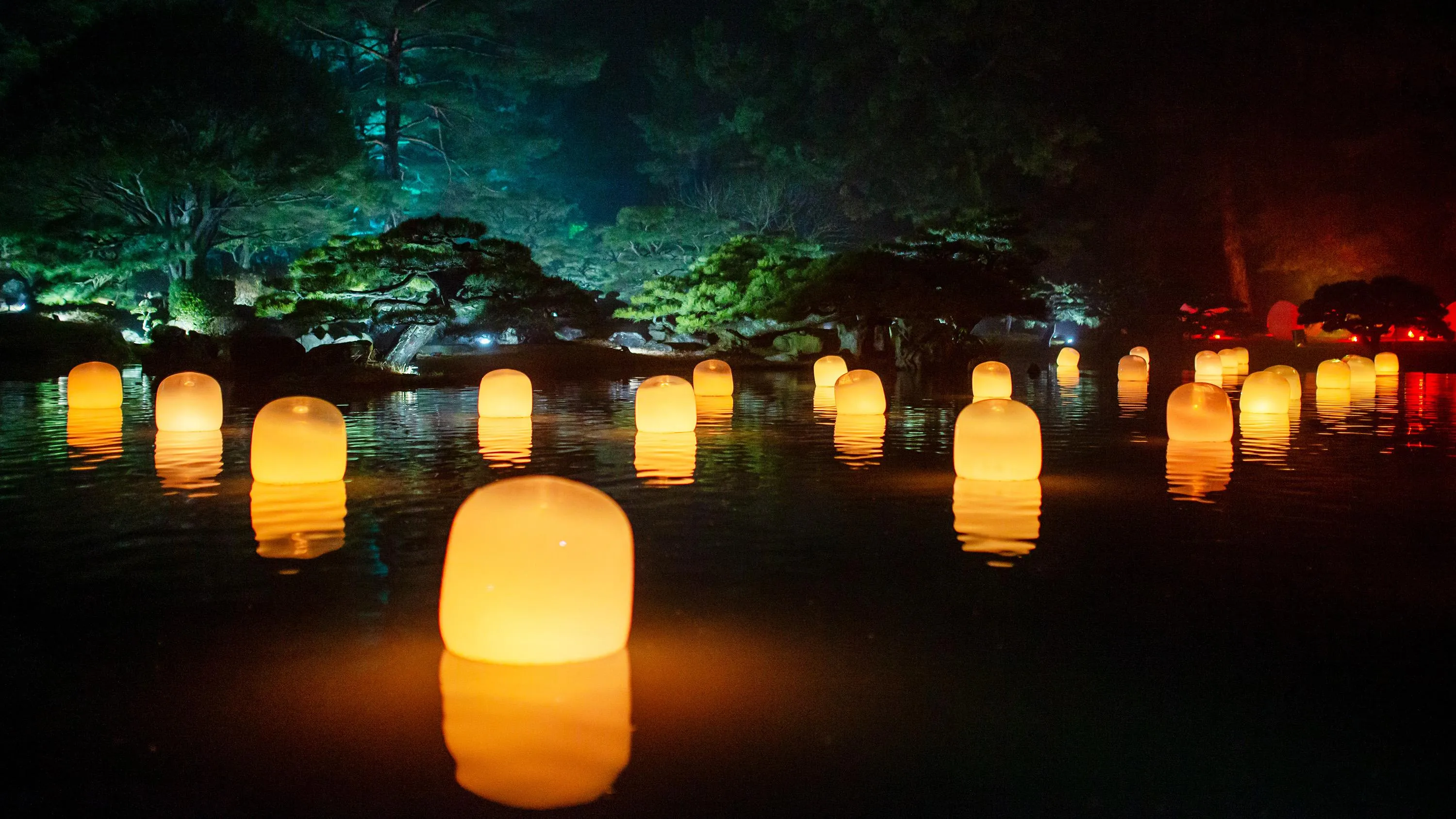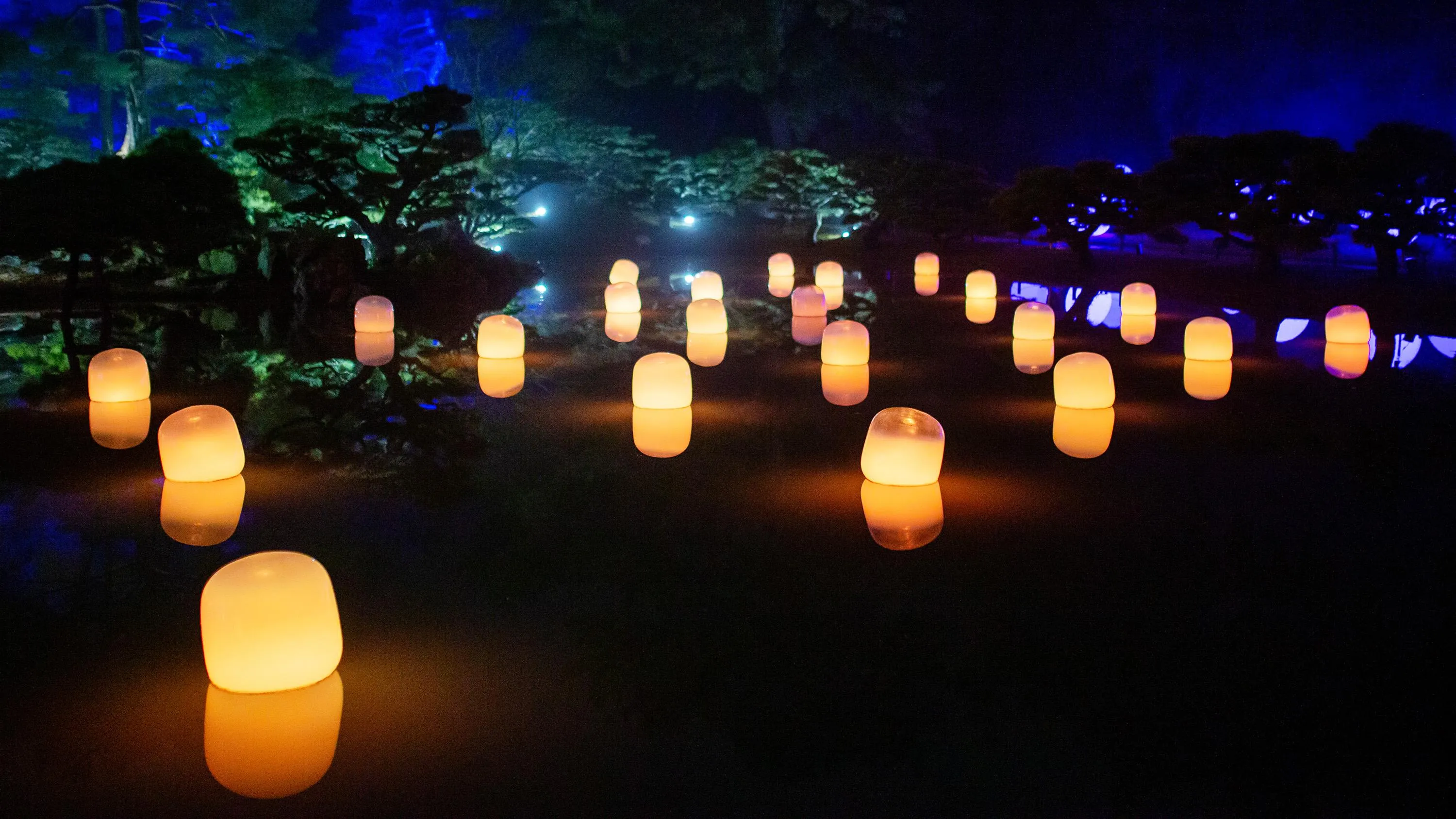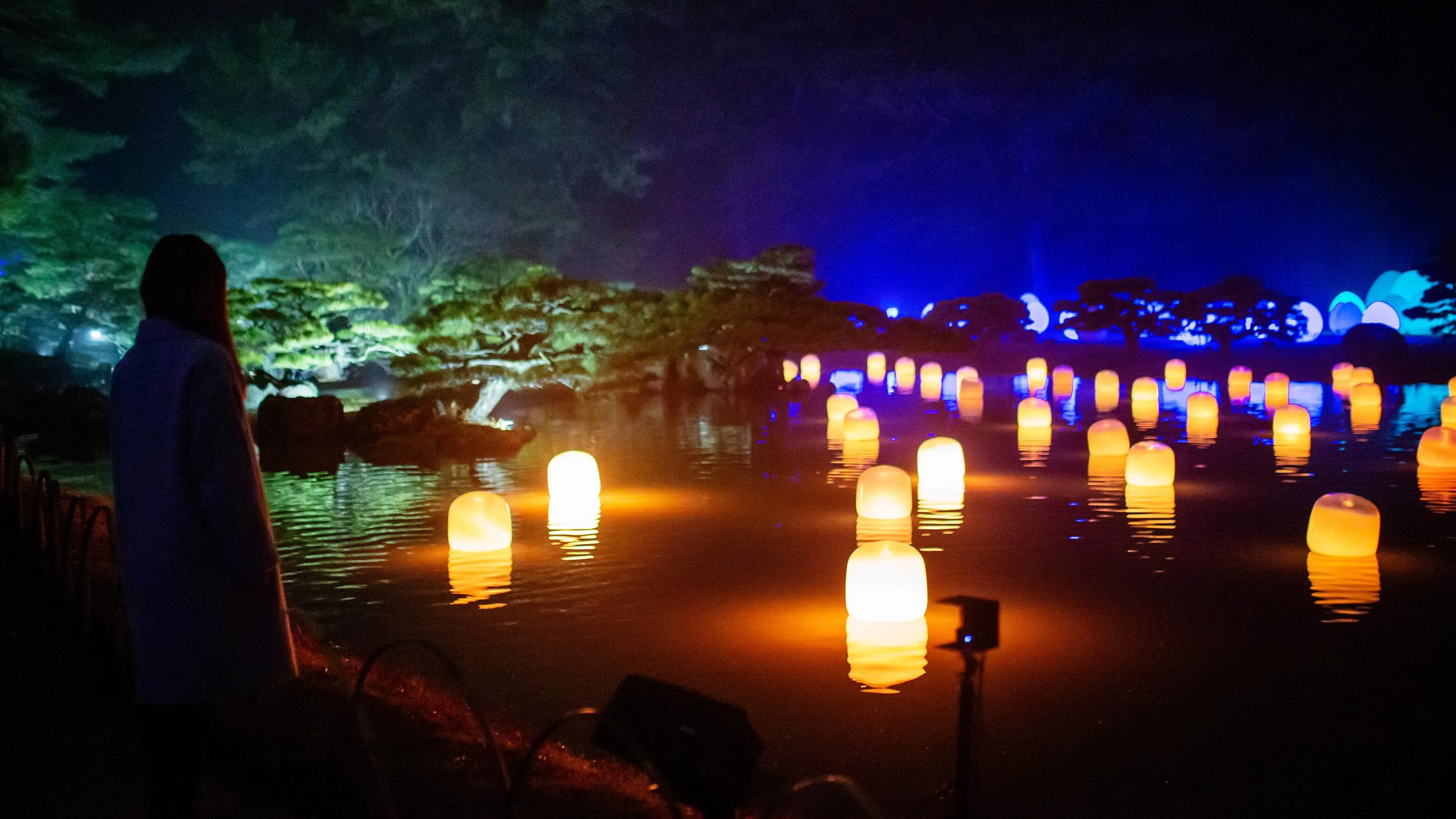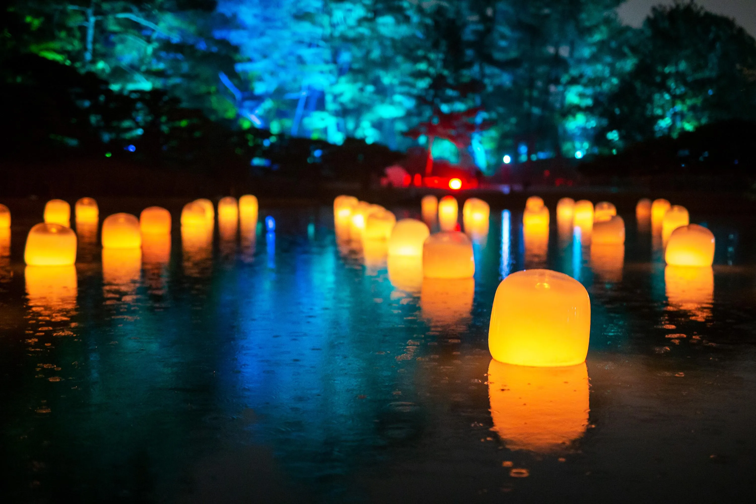 Each of the lamps on the water’s surface floats autonomously. When a person stands still near a lamp, or when the wind blows a lamp, it shines brightly and emits a sound. The light of that lamp is transmitted to nearby lamps one by one, as the sound is continuously emitted. The transmitted light always travels through each of the lamps only once, shining brightly, as it propagates through all of the lamps, continuing on to Life is Continuous Light on the island in the center of the pond. People become aware of the presence of others in the same space.