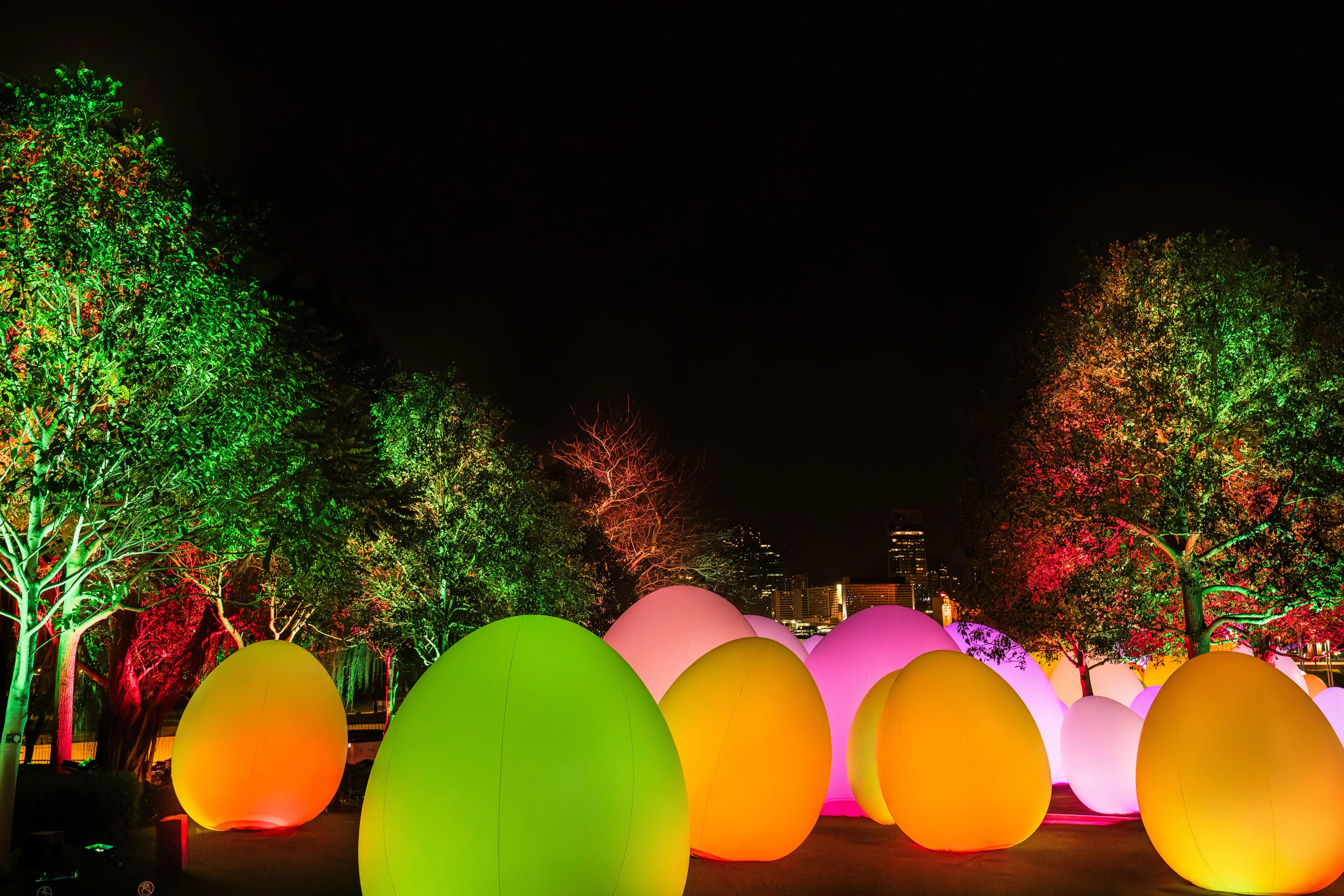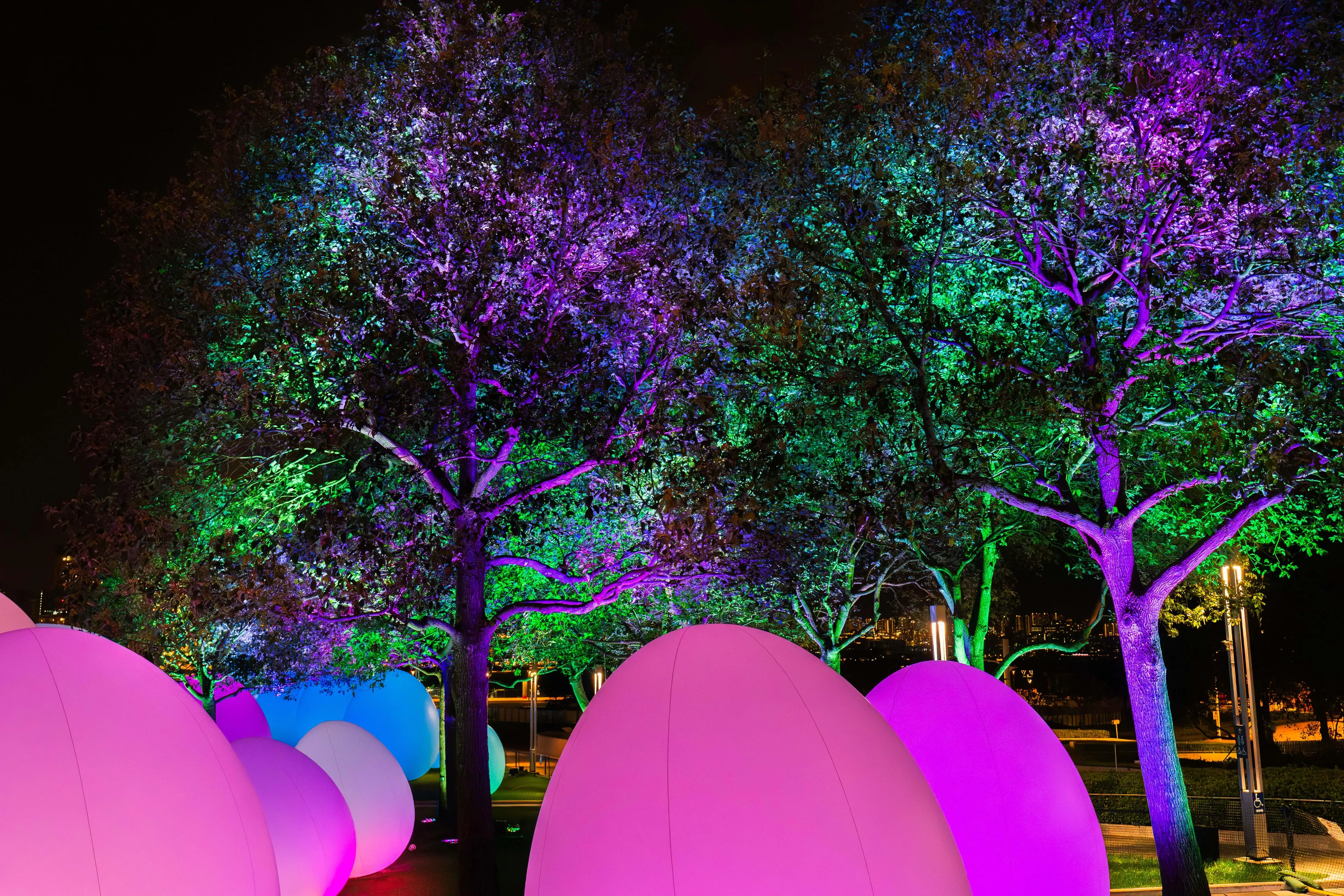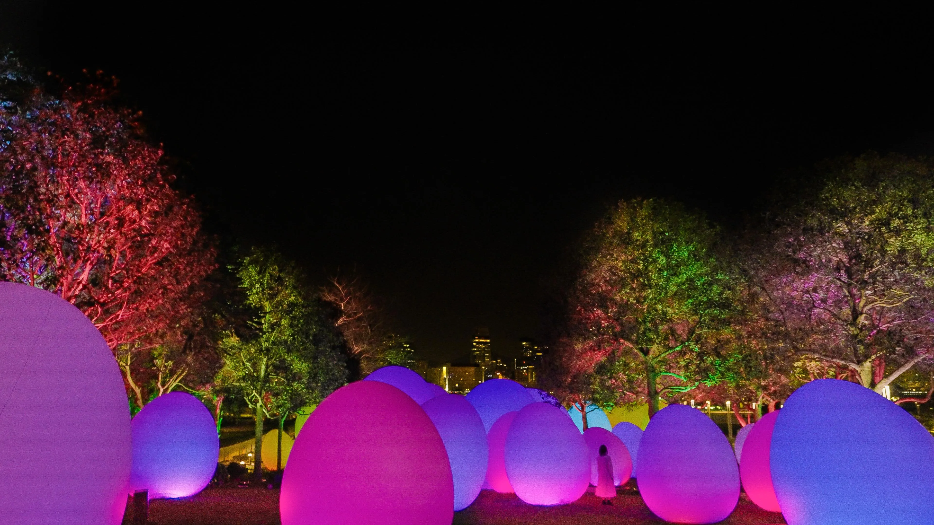 The light of the trees in this artwork responds to the continuous light from the artwork Resonating Life which Continues to Stand, producing a tone and changing color. That light and tone then spreads continuously, one by one, to the surrounding trees.