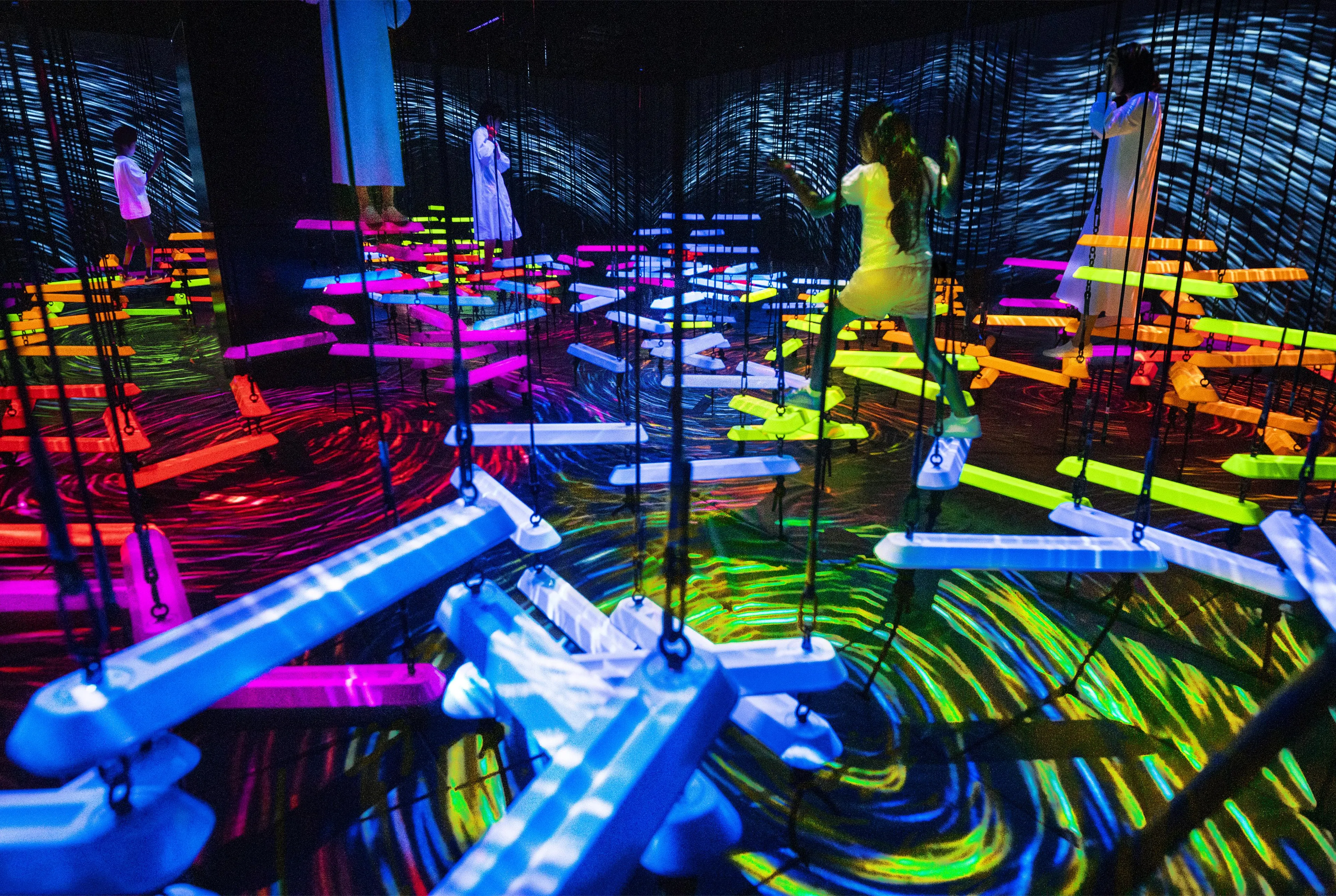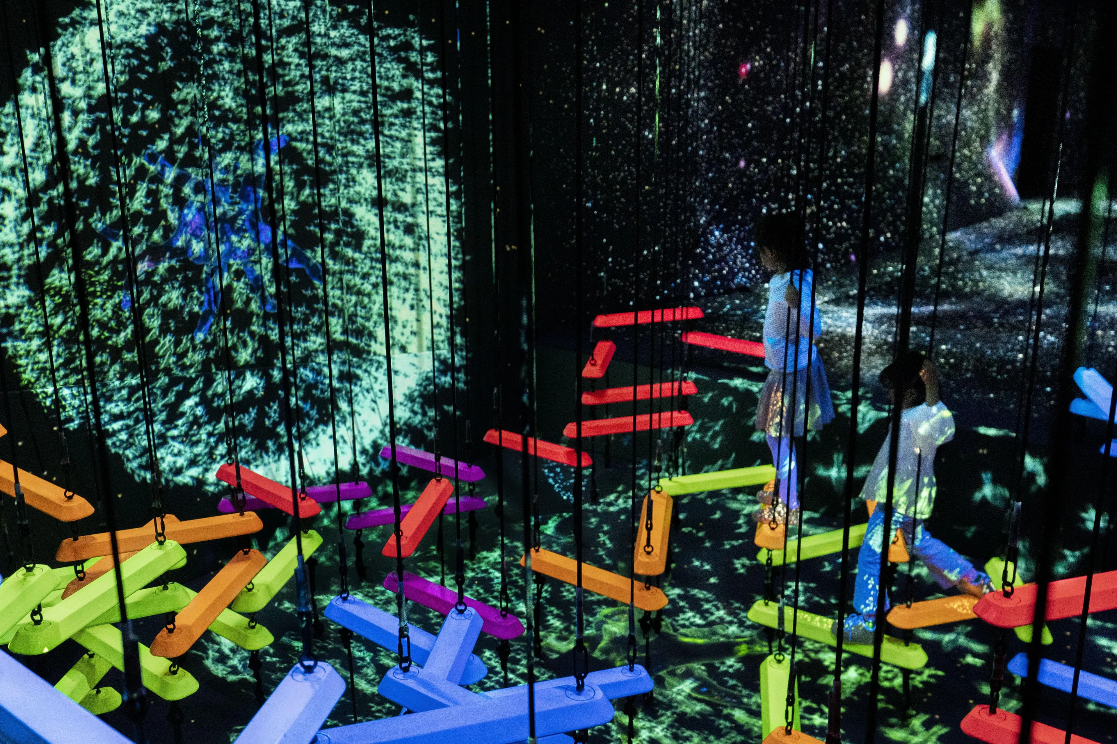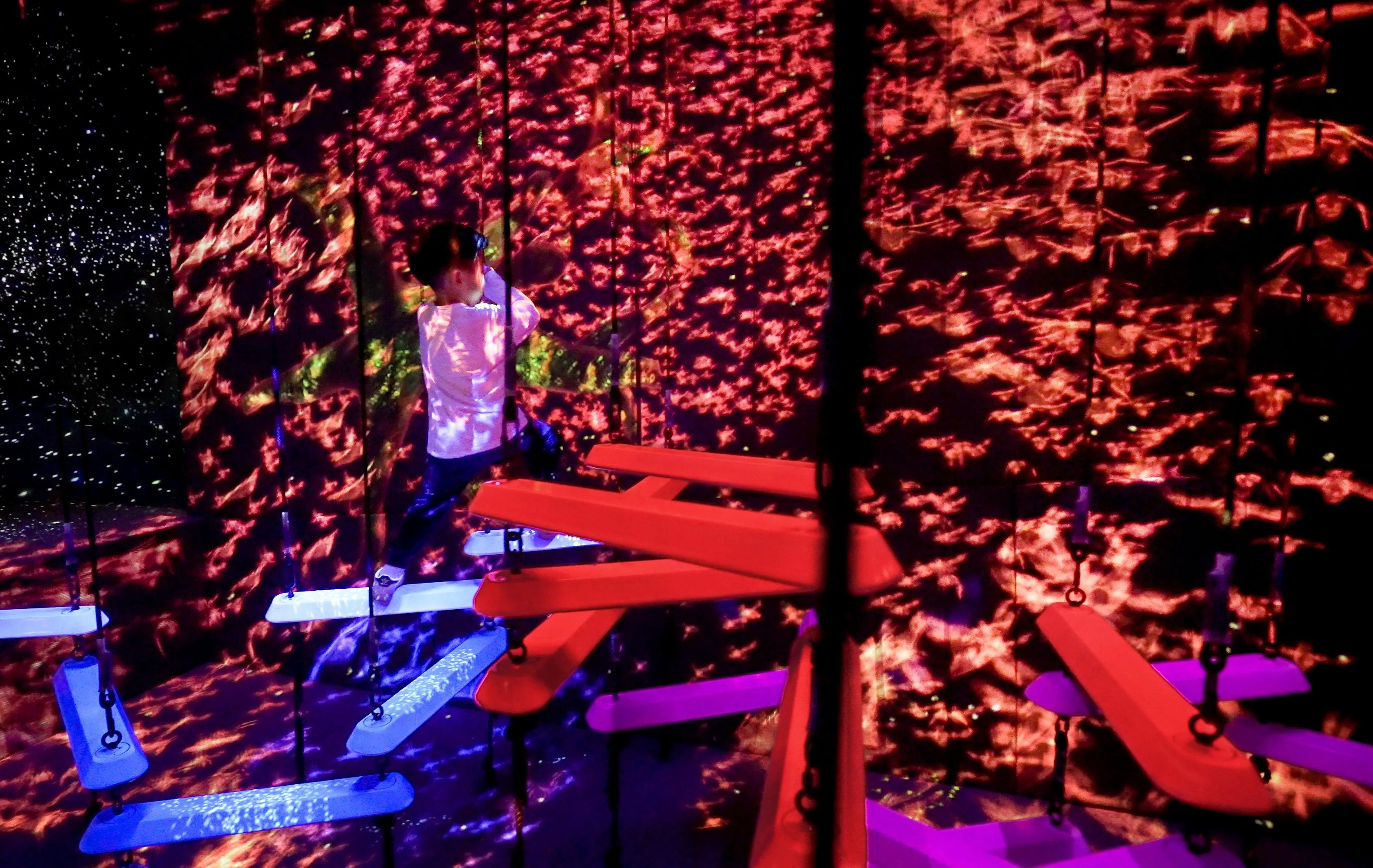 Aerial Climbing is a space where bars are suspended by ropes and float three-dimensionally in the air. When a person climbs on one of the bars, it affects the other bars because they are connected to each other. When a person crosses the bars, they affect the space.