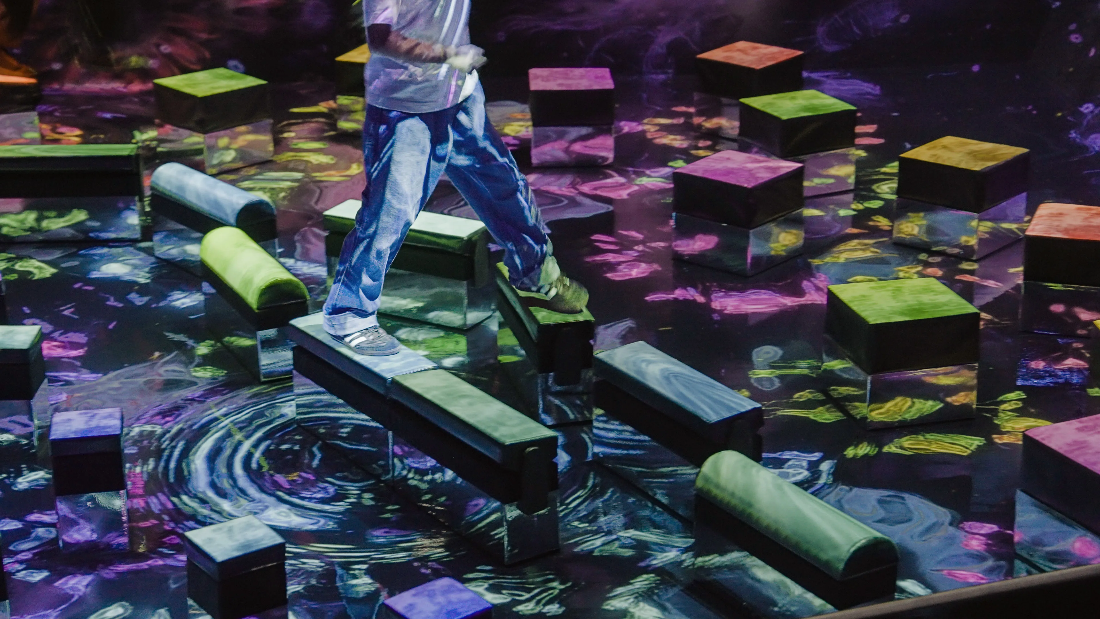 The variously-shaped Balance Stepping Stones were developed by teamLab. When a person steps on the stones, they change interactively, emitting a color tone that affects the space. And when a person steps on the stones, they wobble in various ways, so it is necessary to maintain balance to keep from falling.