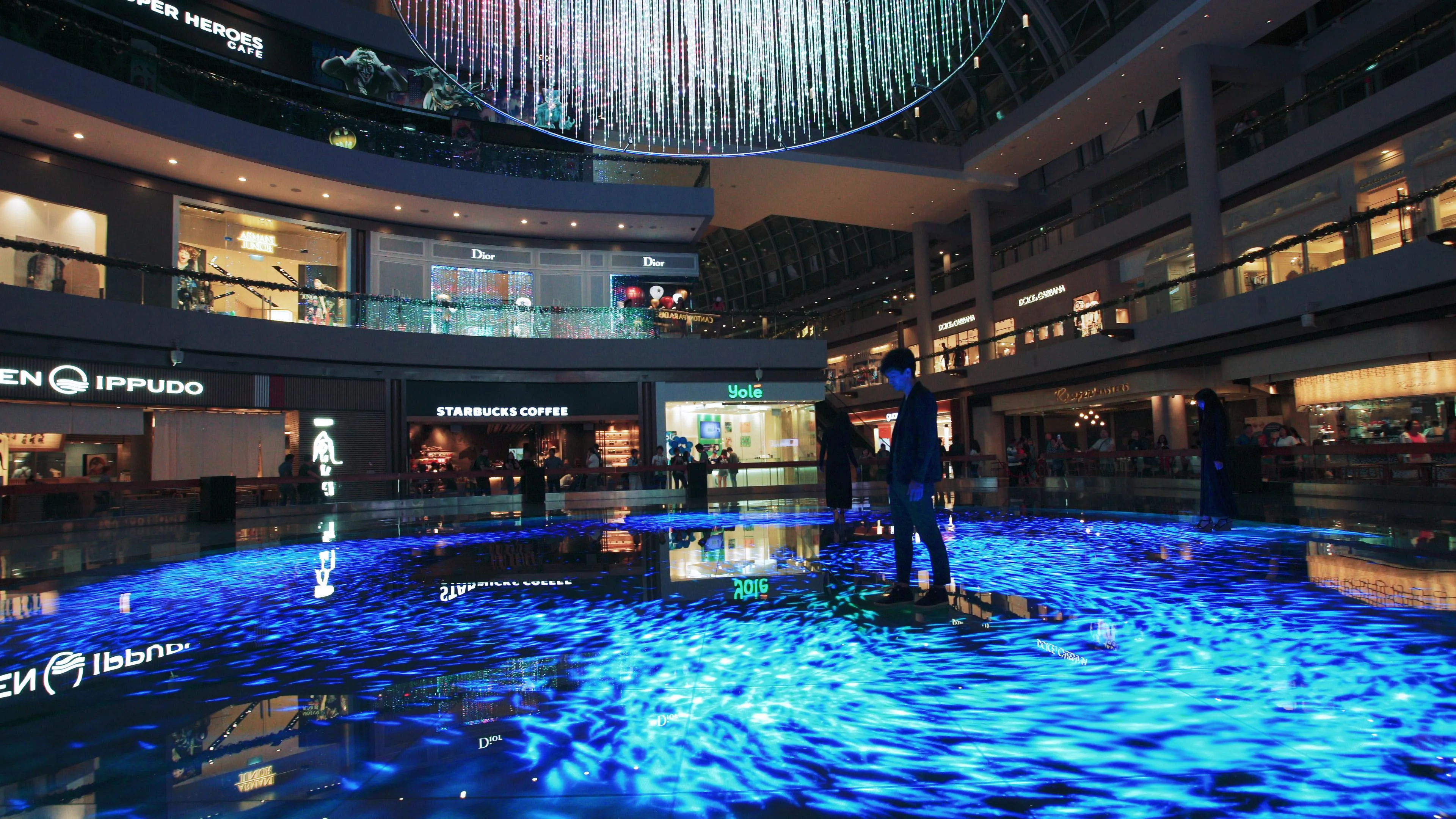 人々が自身のスマートフォンから、好きなオーナメントを投げ込むことで、光の点の集合でできた巨大な立体のオーナメントが出現する。設置されたタブレットに触って、実際のツリーを動かすこともできる。