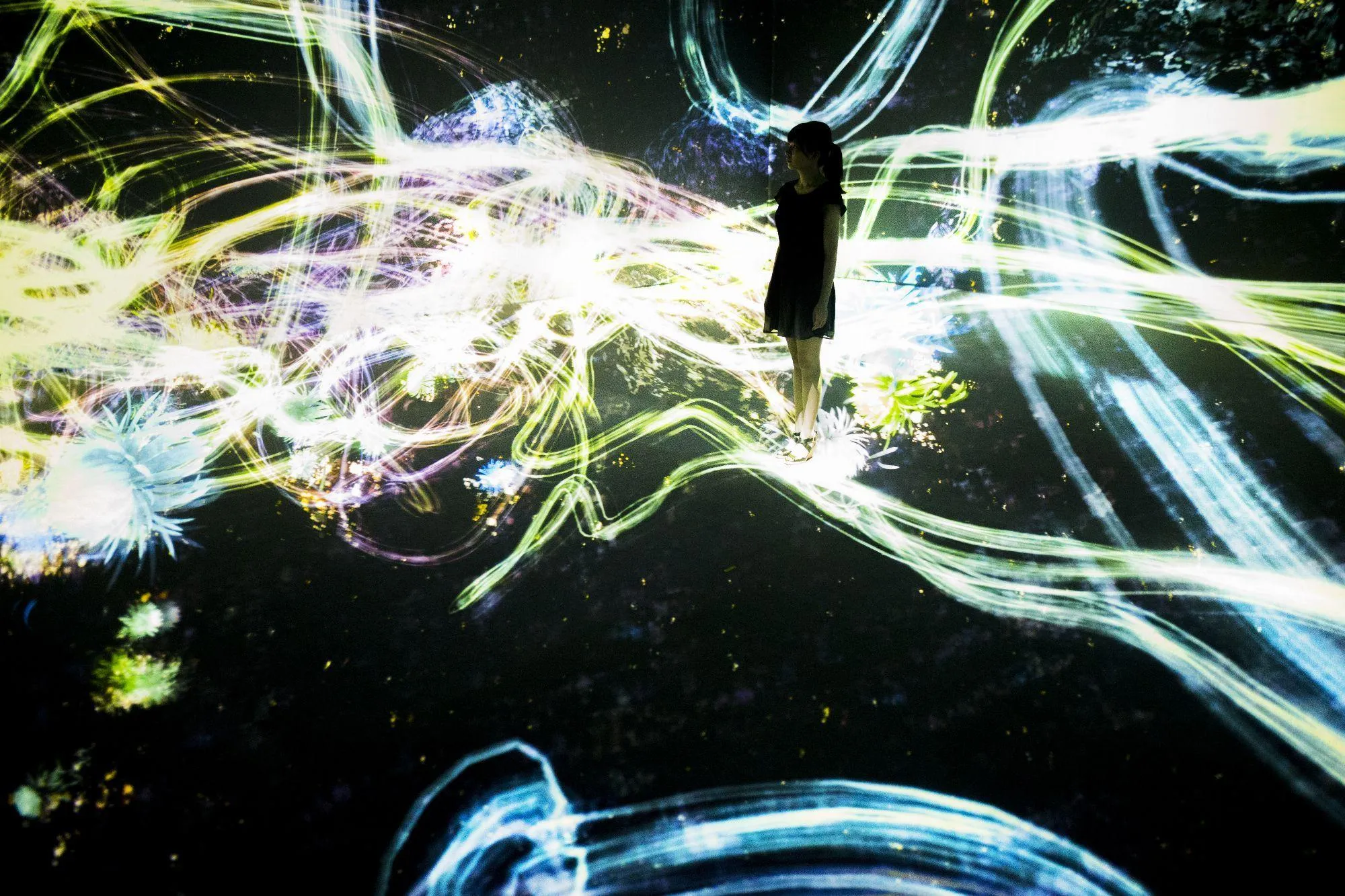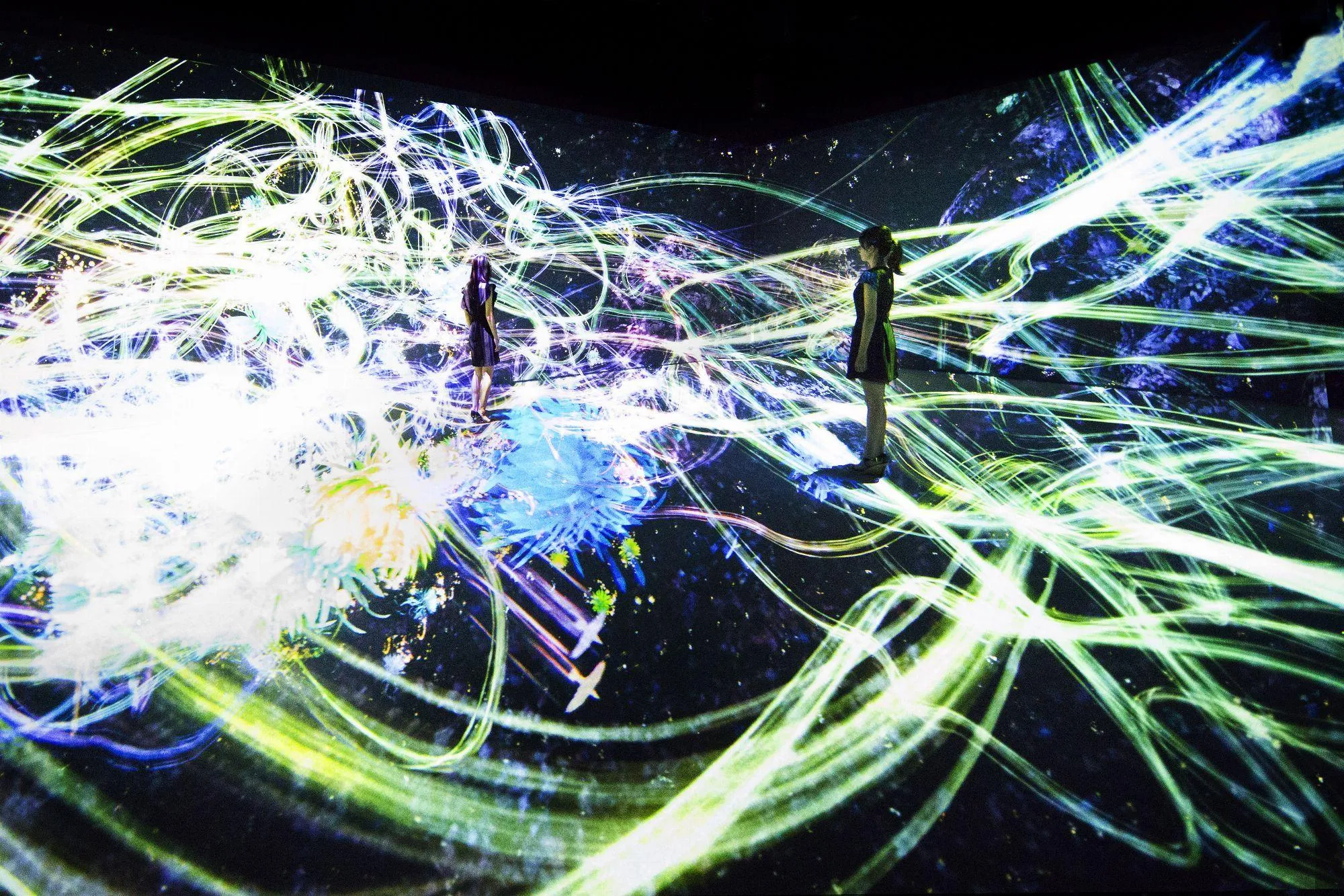 四方と下方が全て映像に囲われたインタラクティブデジタルインスタレーション作品。