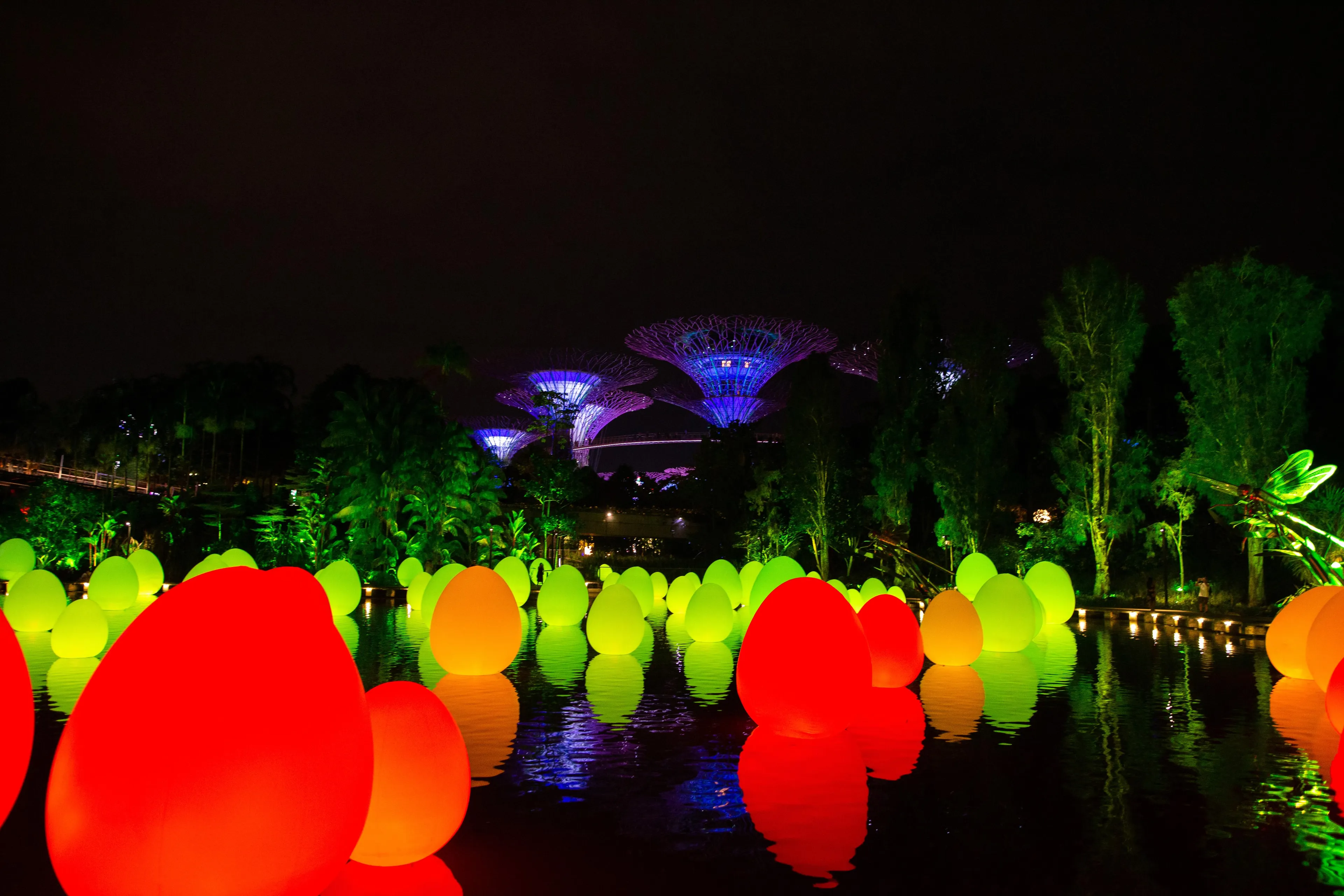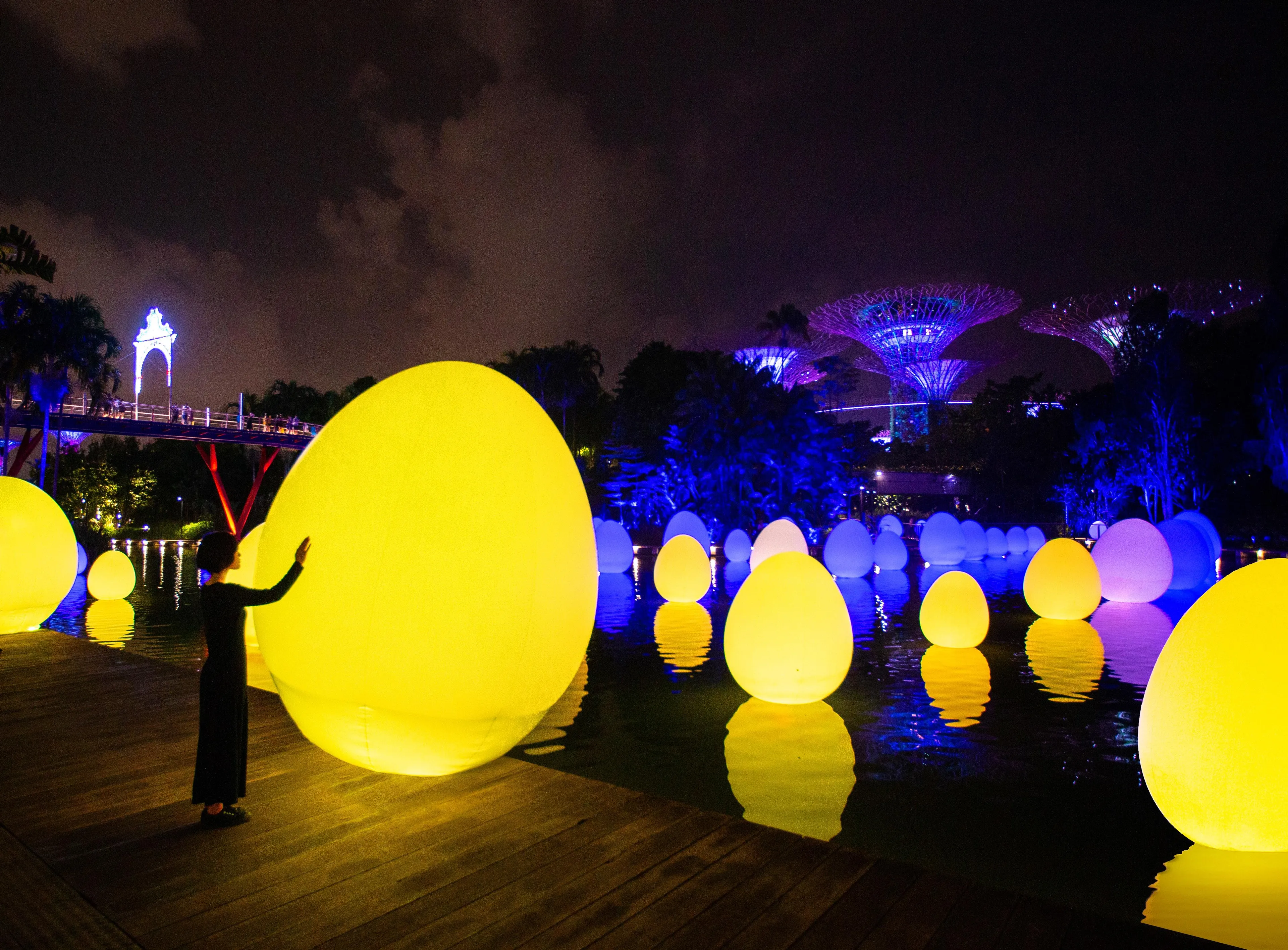 ドラゴンフライレイクの湖面に立つ、光のovoid(卵形体)と、湖畔の木々が光り輝く。