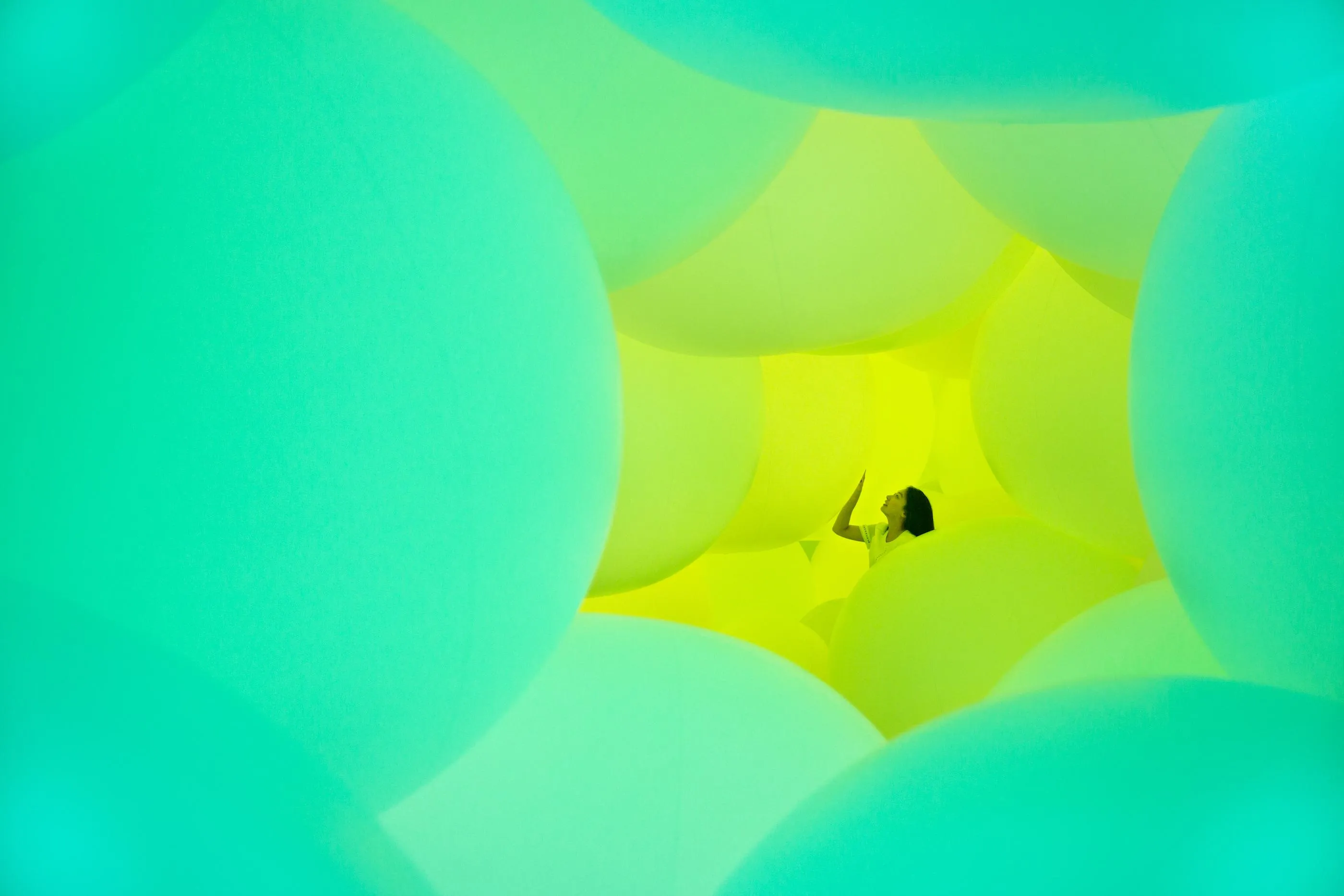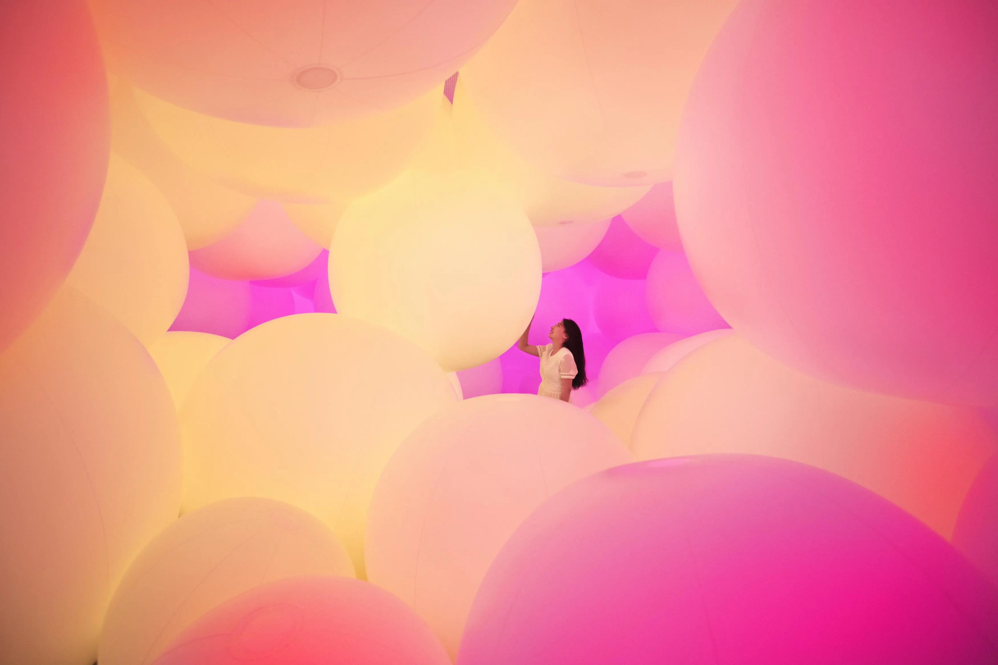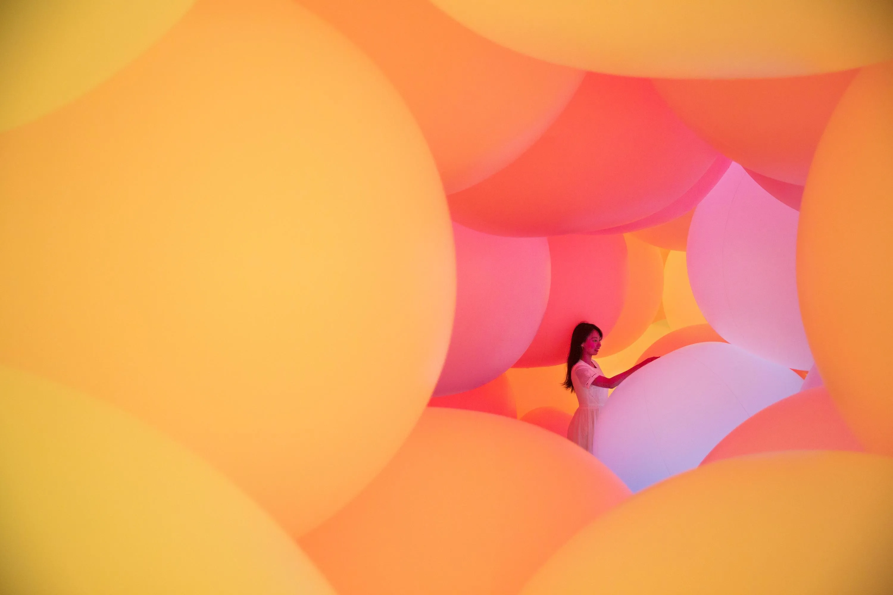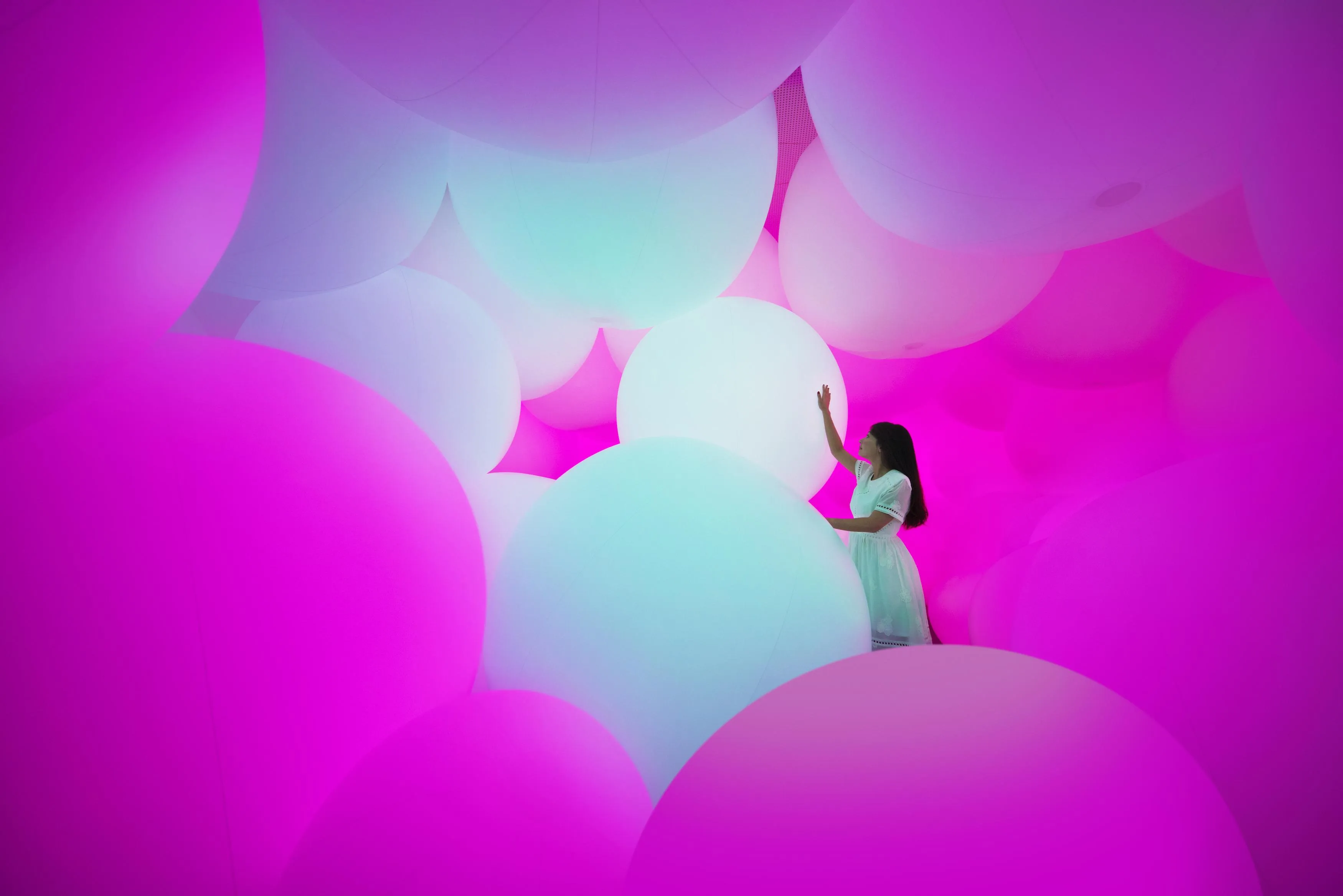 teamlab's color-changing floating spheres in singapore respond to human touch
