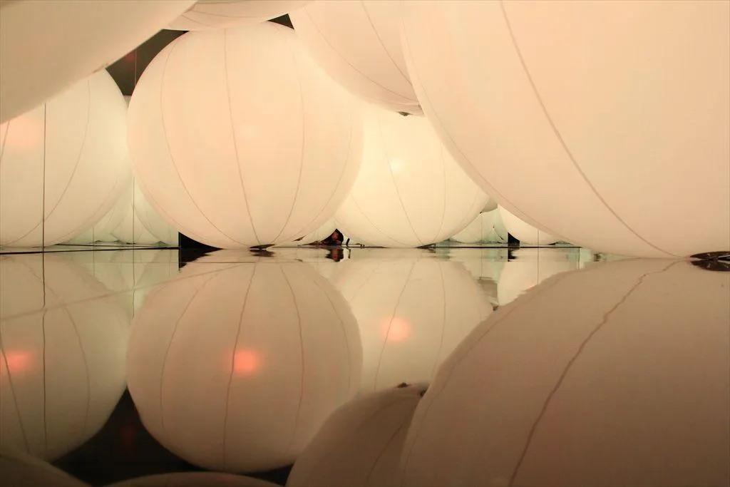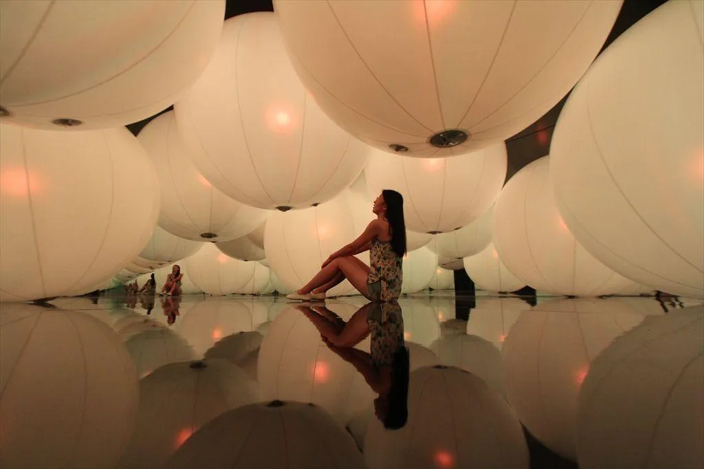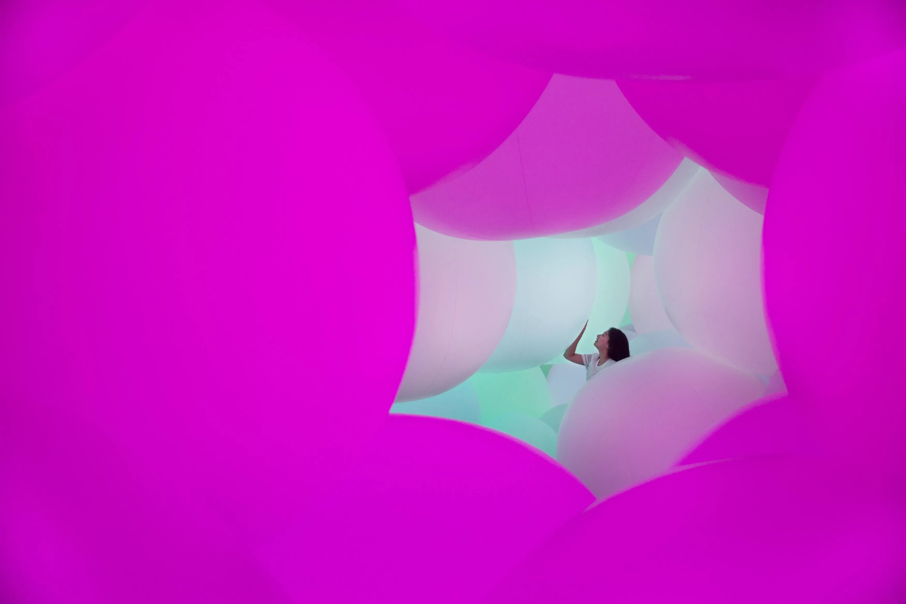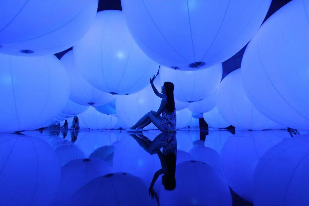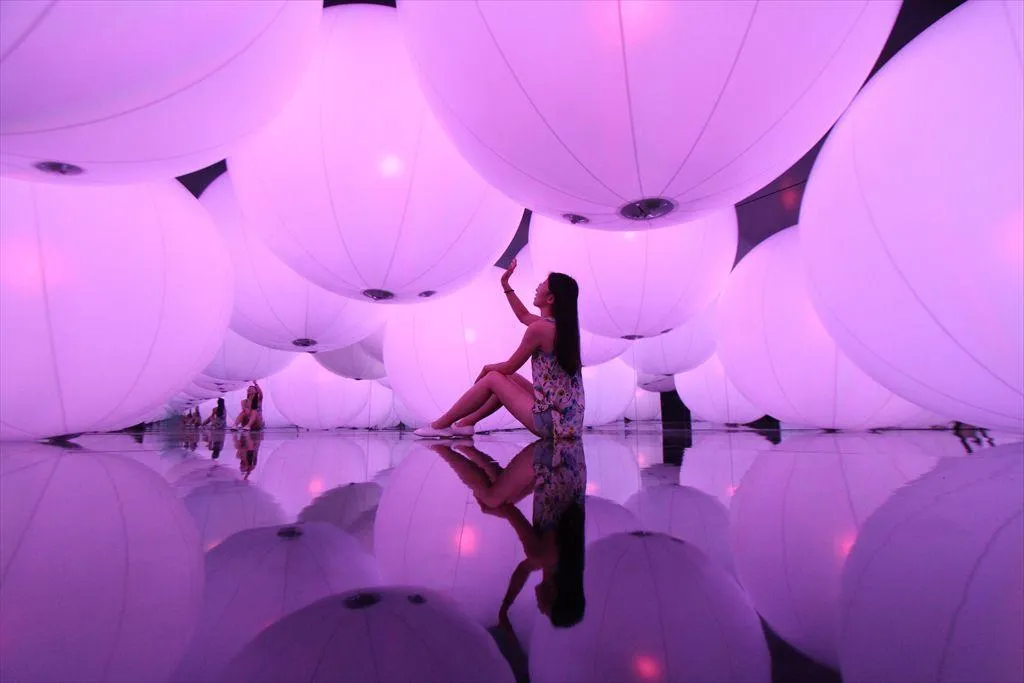 teamlab's color-changing floating spheres in singapore respond to human touch