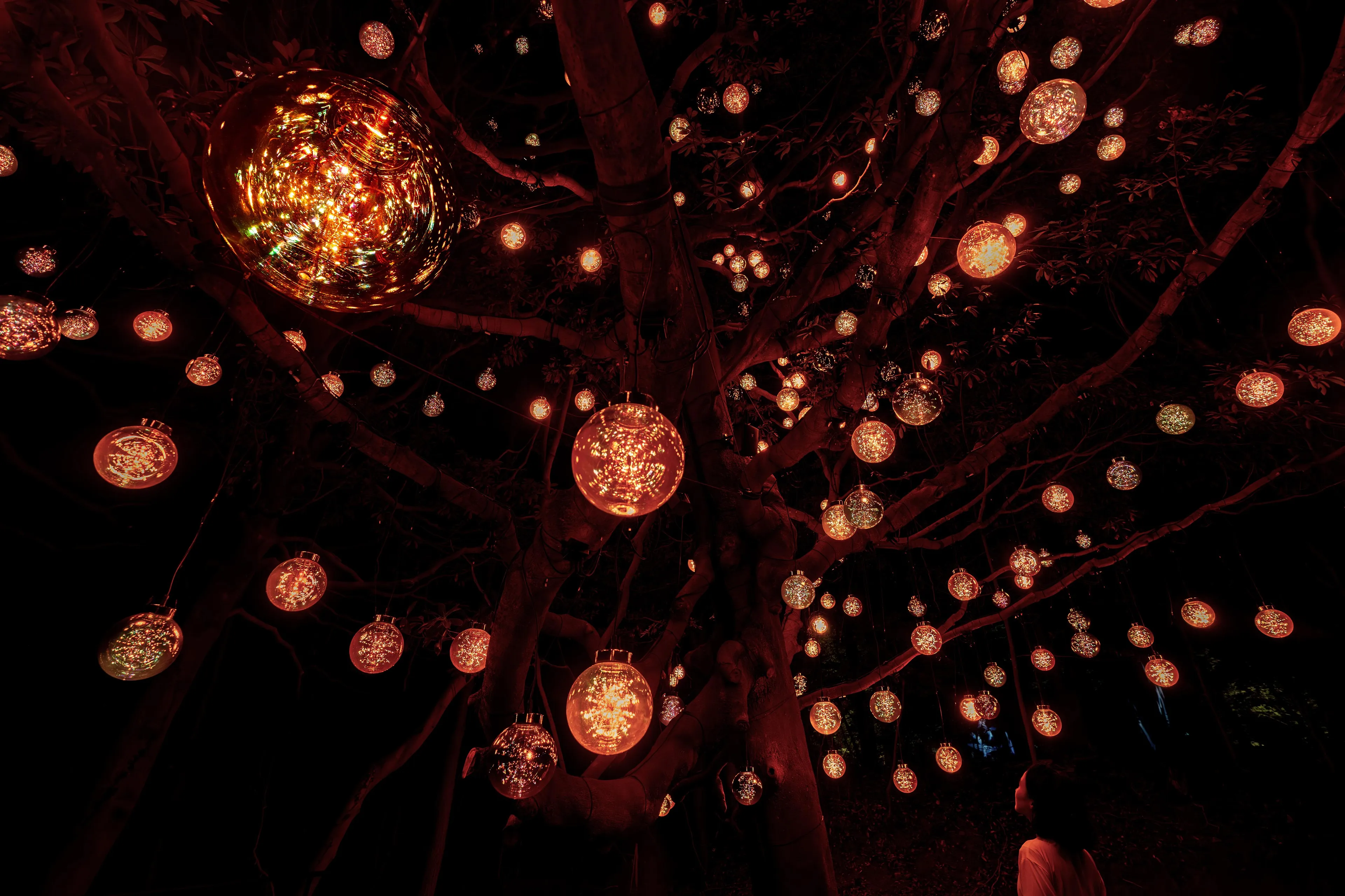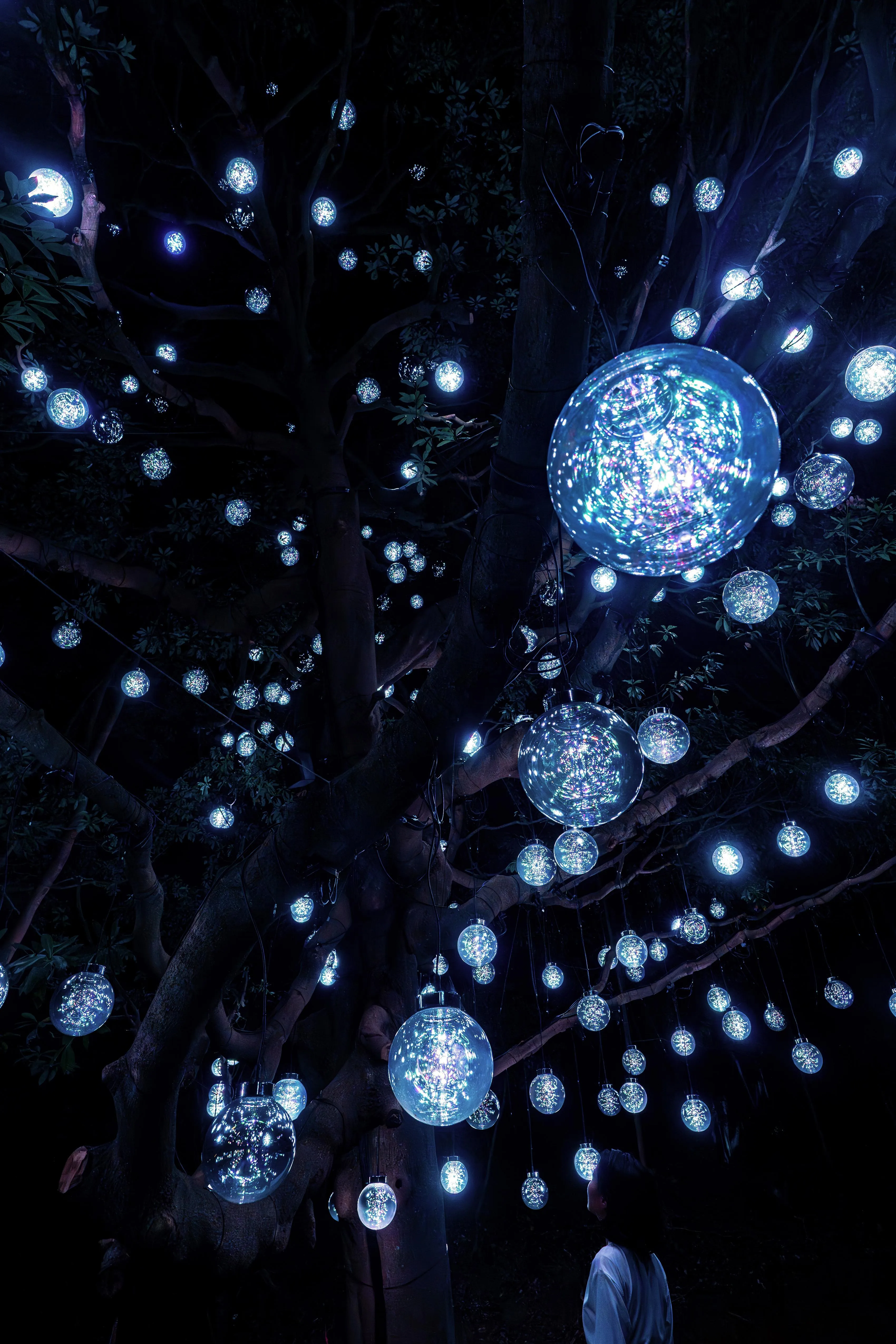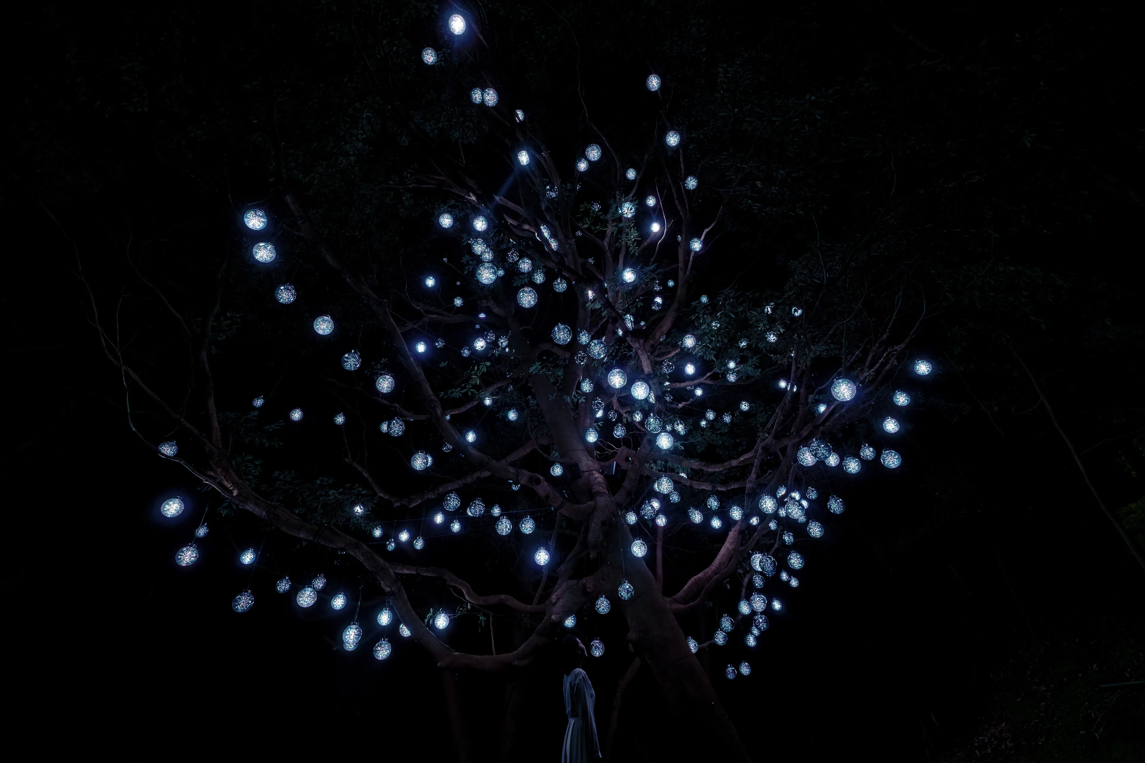 人が木に近づくと、最も近い球体が強く輝き音色を響かせる。周辺の球体も次々に呼応し、光を輝かせ音色を響かせ連続していく。