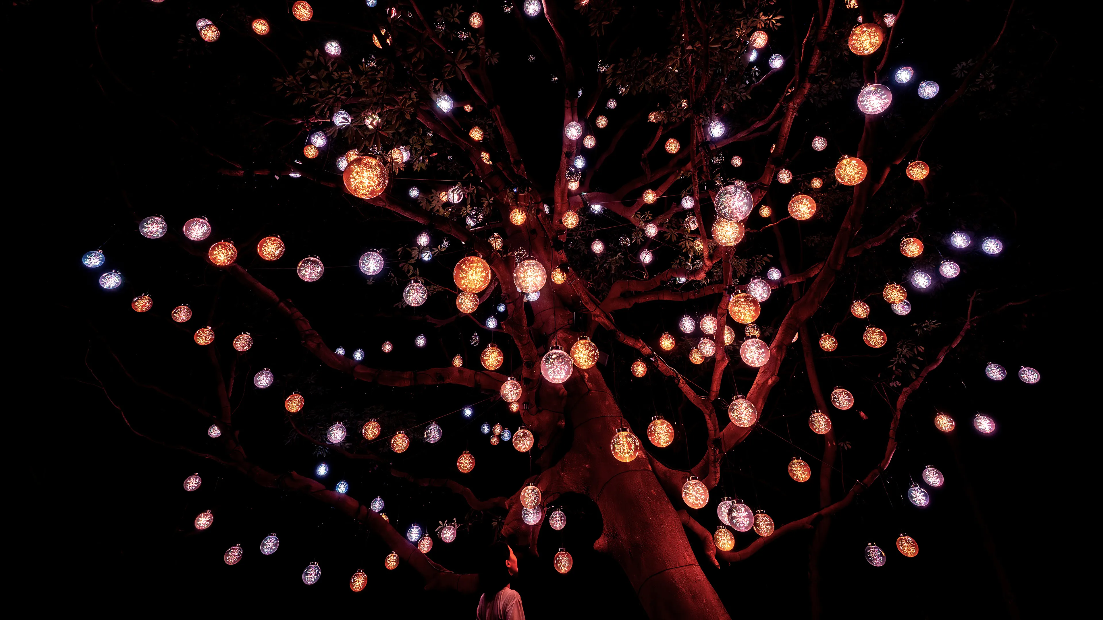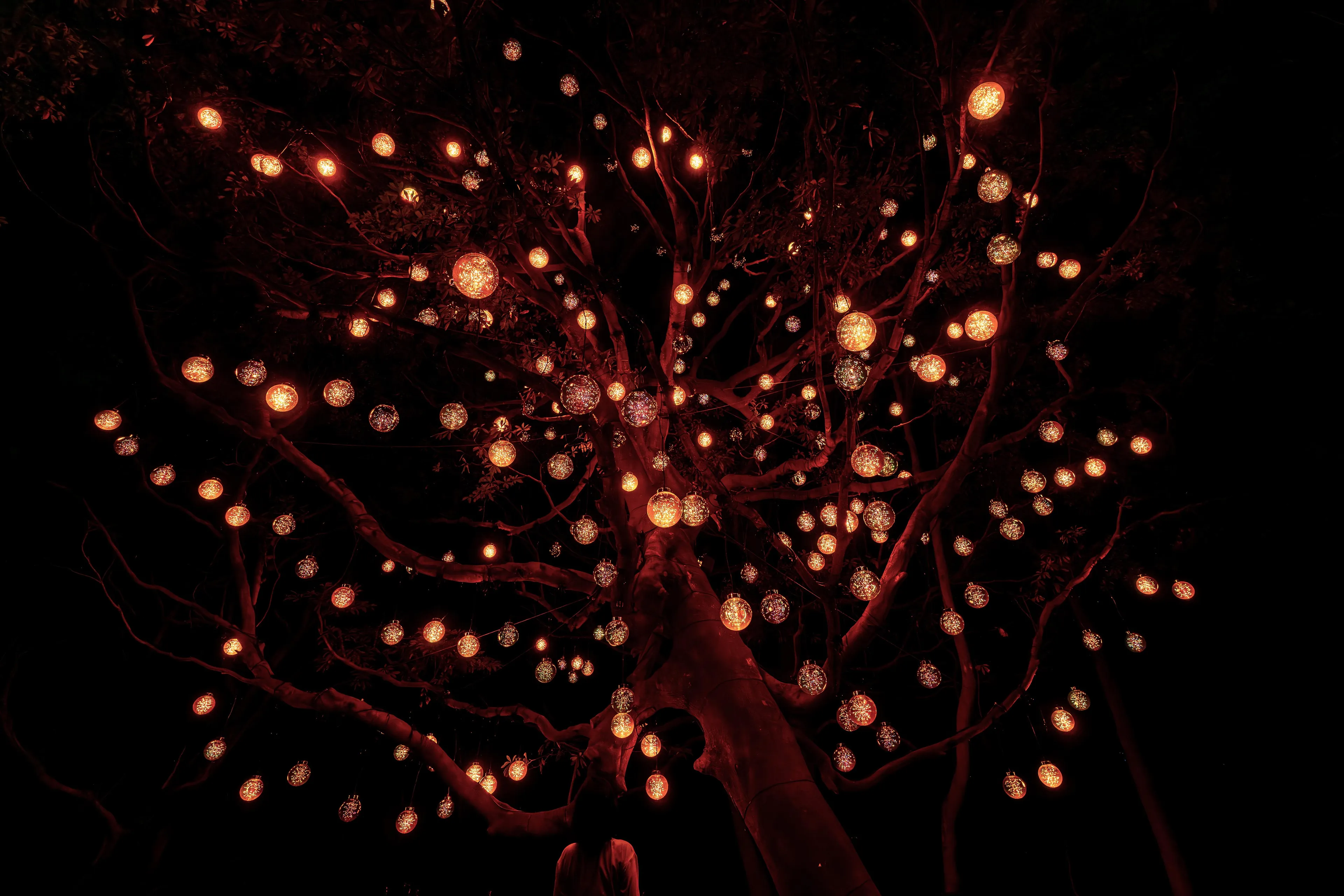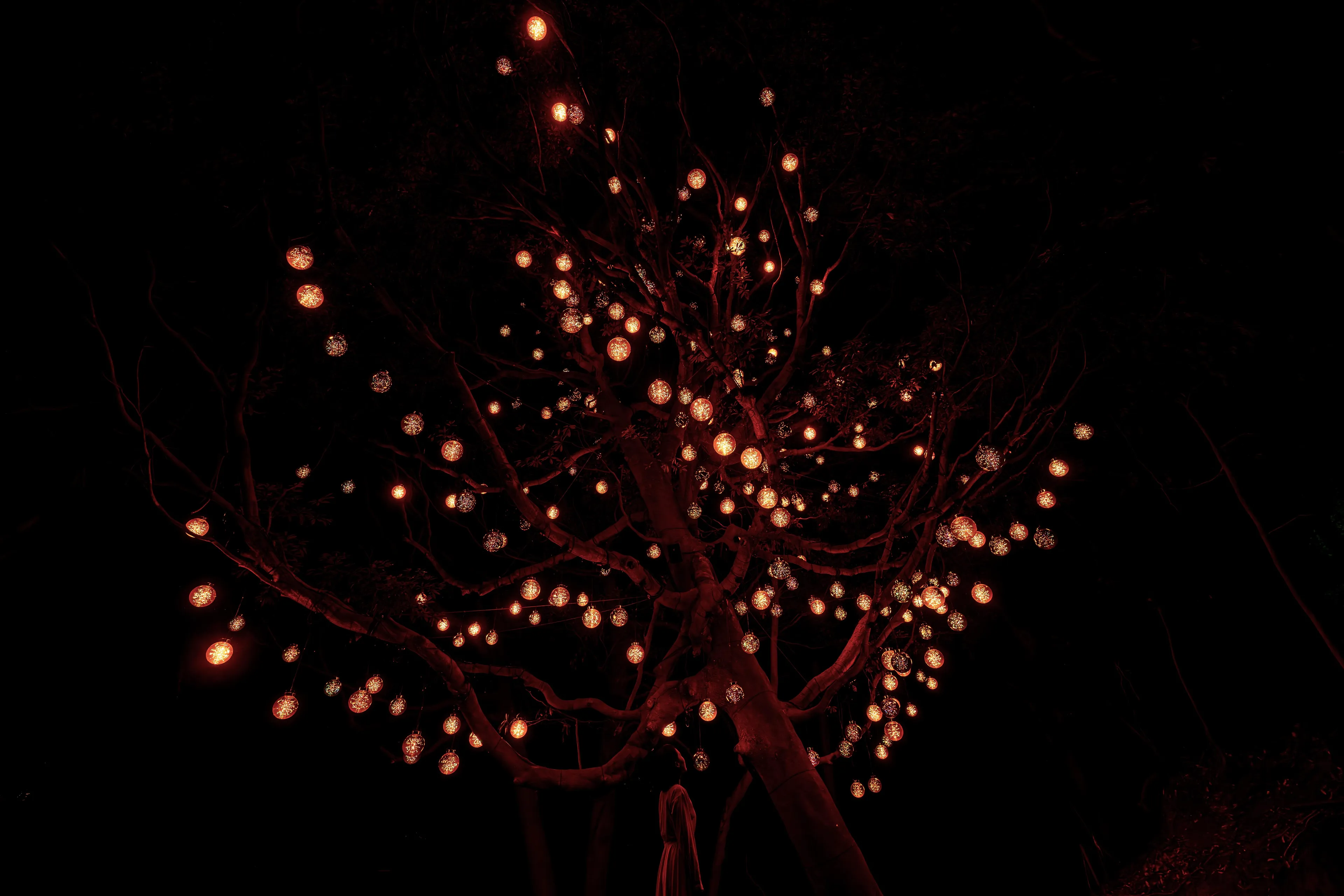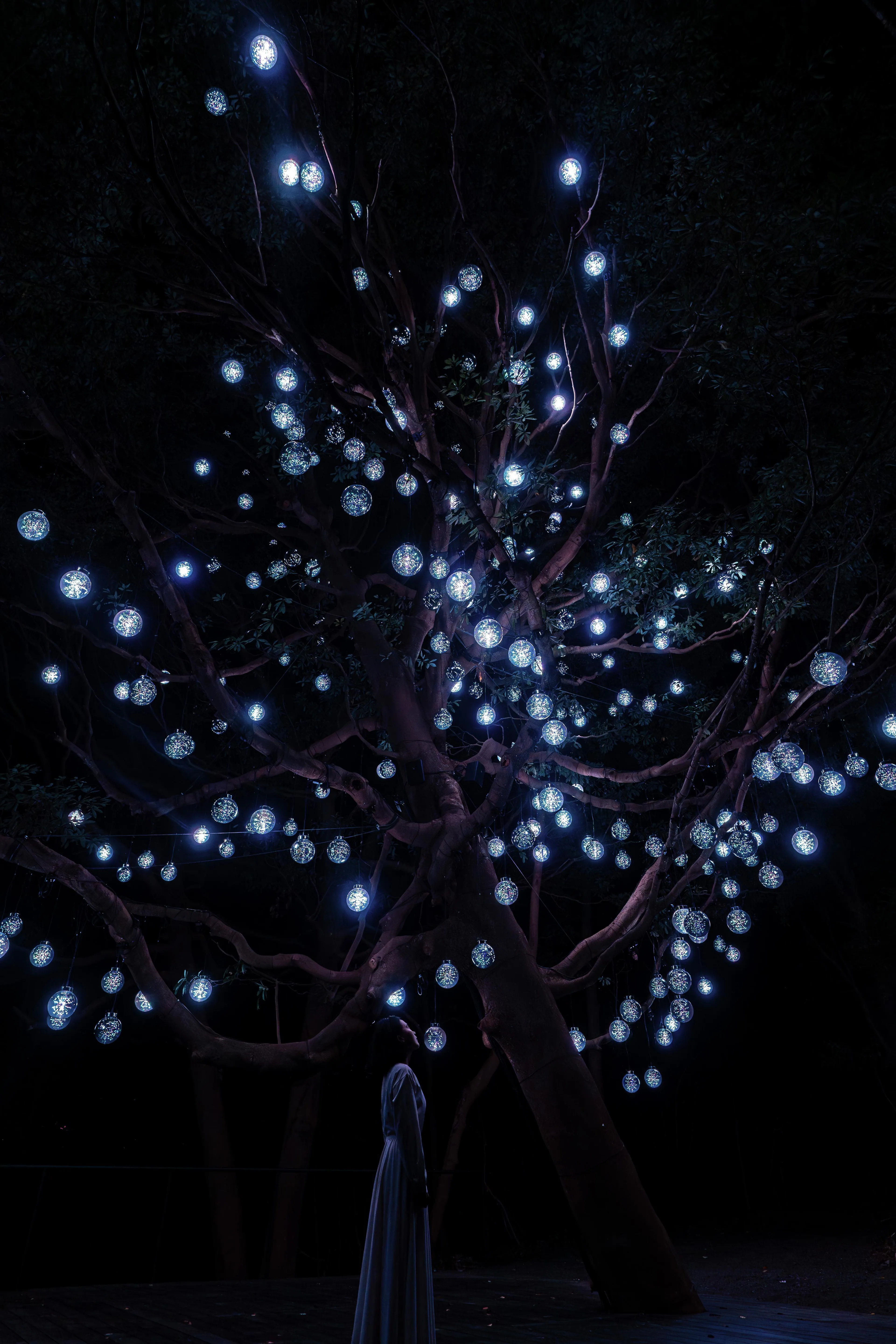人が木に近づくと、最も近い球体が強く輝き音色を響かせる。周辺の球体も次々に呼応し、光を輝かせ音色を響かせ連続していく。