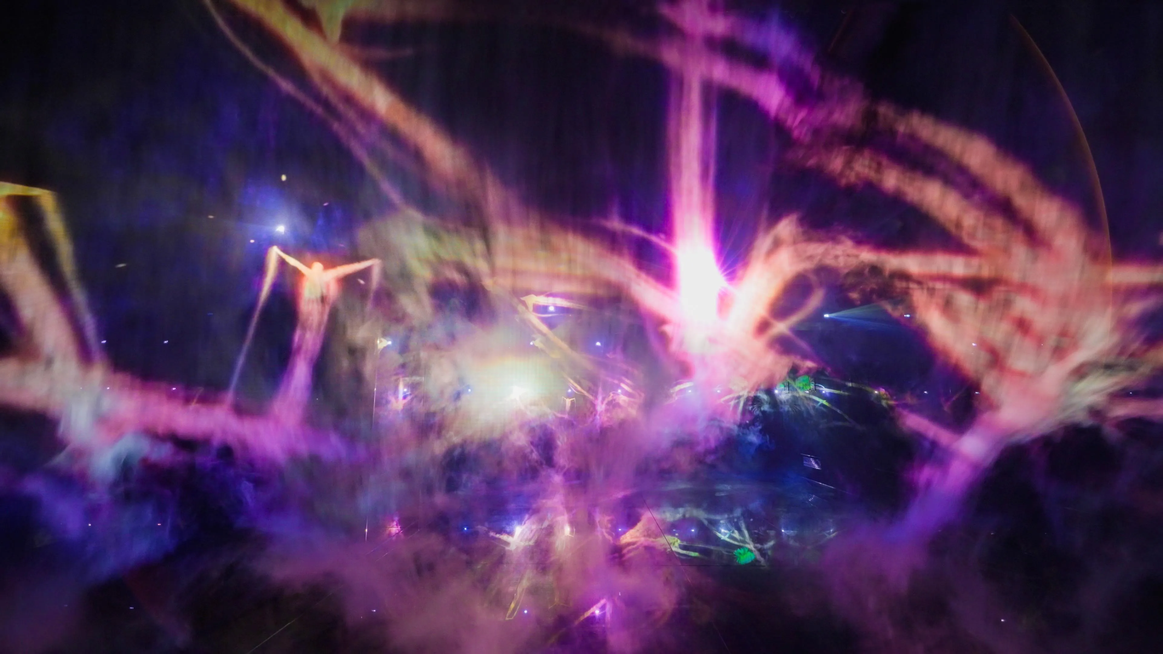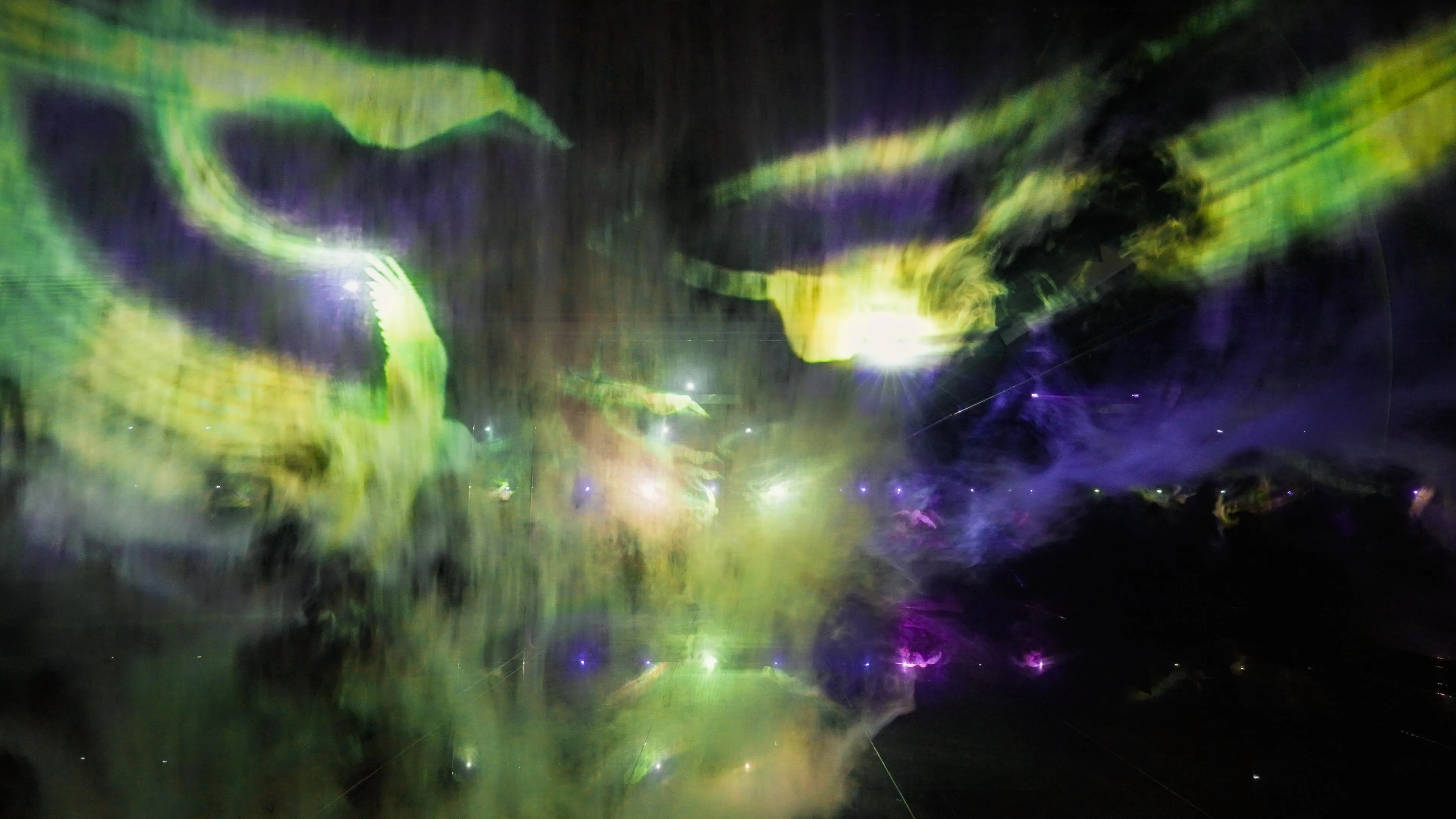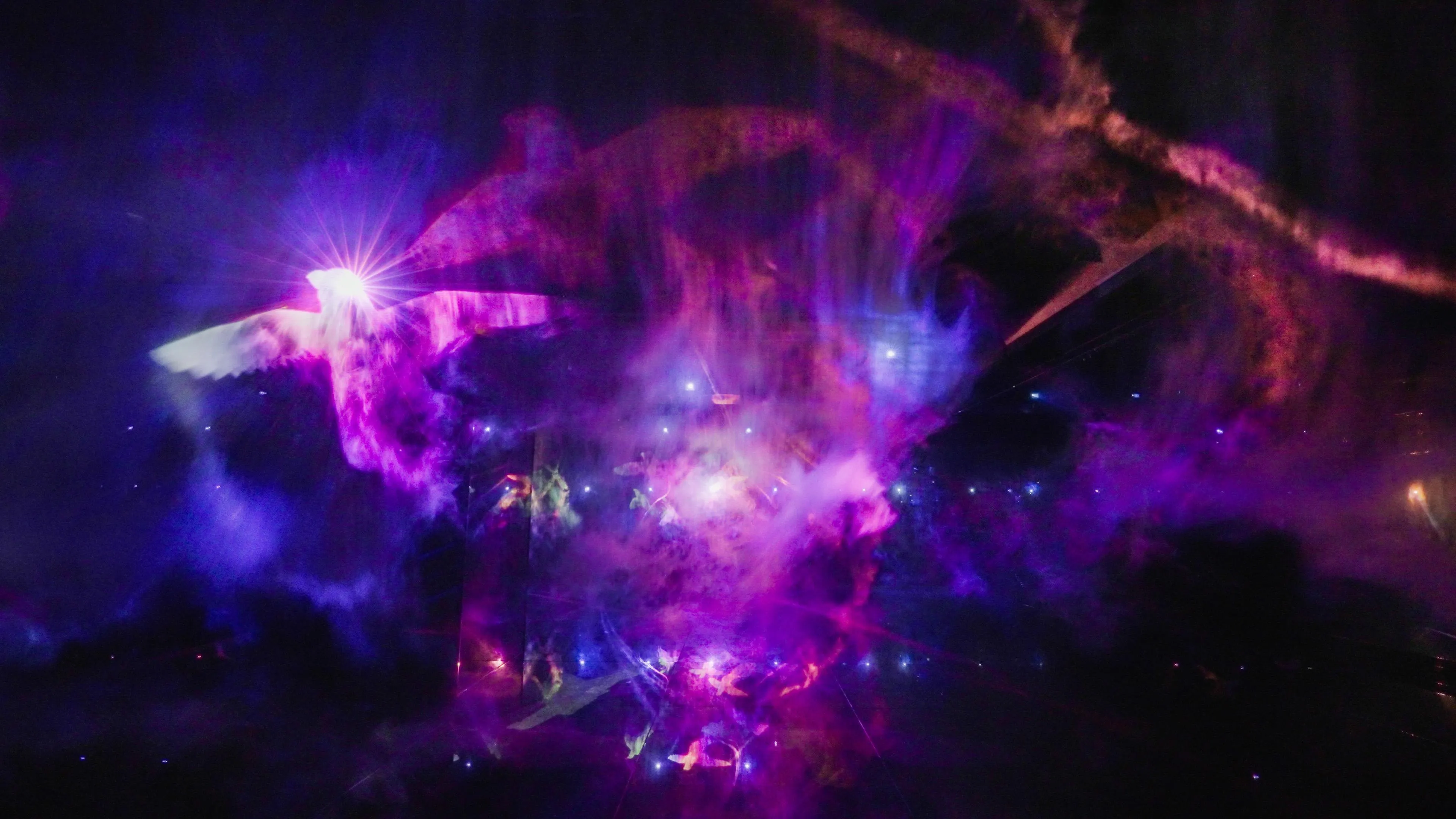 빛으로 그려진 야타가라스(八咫烏) 가 하늘을 날아다니며, 그 궤적이 빛의 흔적이 되어 ‘공서(空書)’ 를 그린다.