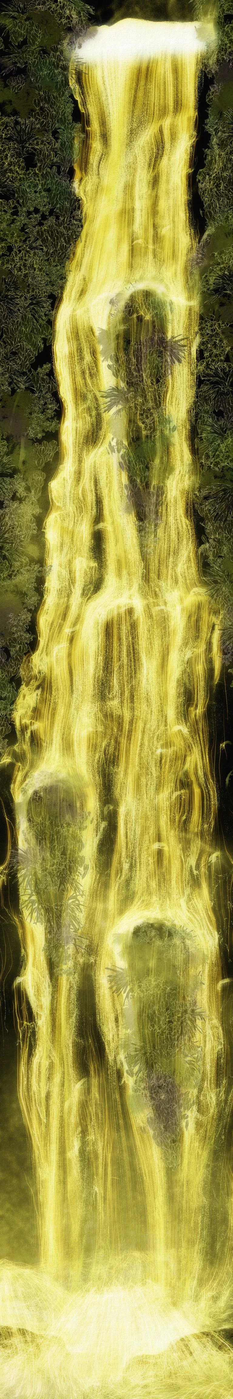 Computer-generated water consisting of hundreds of thousands of water particles is virtually poured onto a virtually sculpted rock. The computer calculates the movement of the particles to produce a simulation of water that flows in accordance with the laws of physics. Lines are drawn in relation to a selection of 0.1% of the particles. The sinuousness of the lines depends on the overall interaction of the water particles.