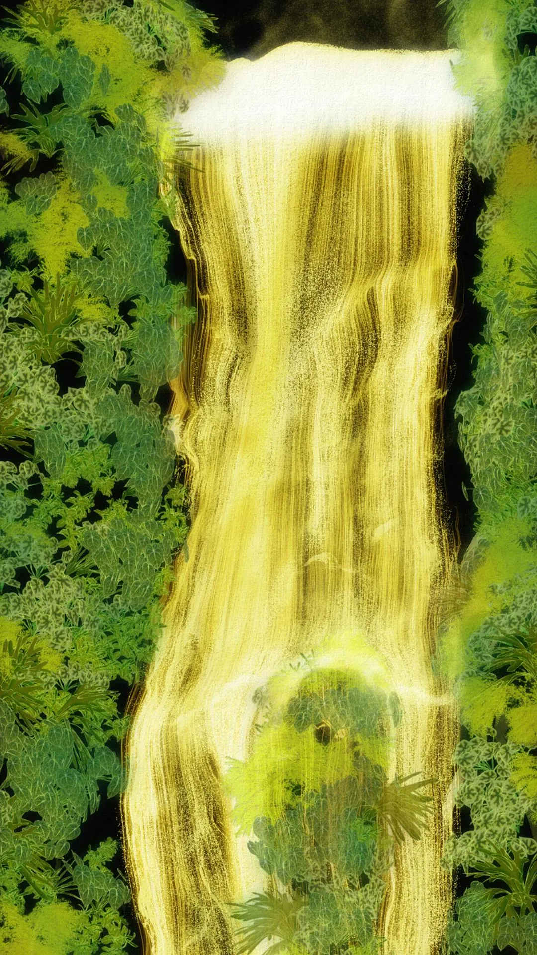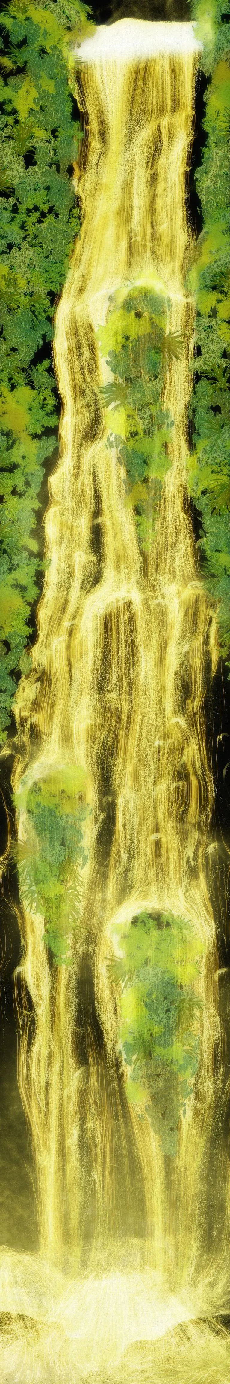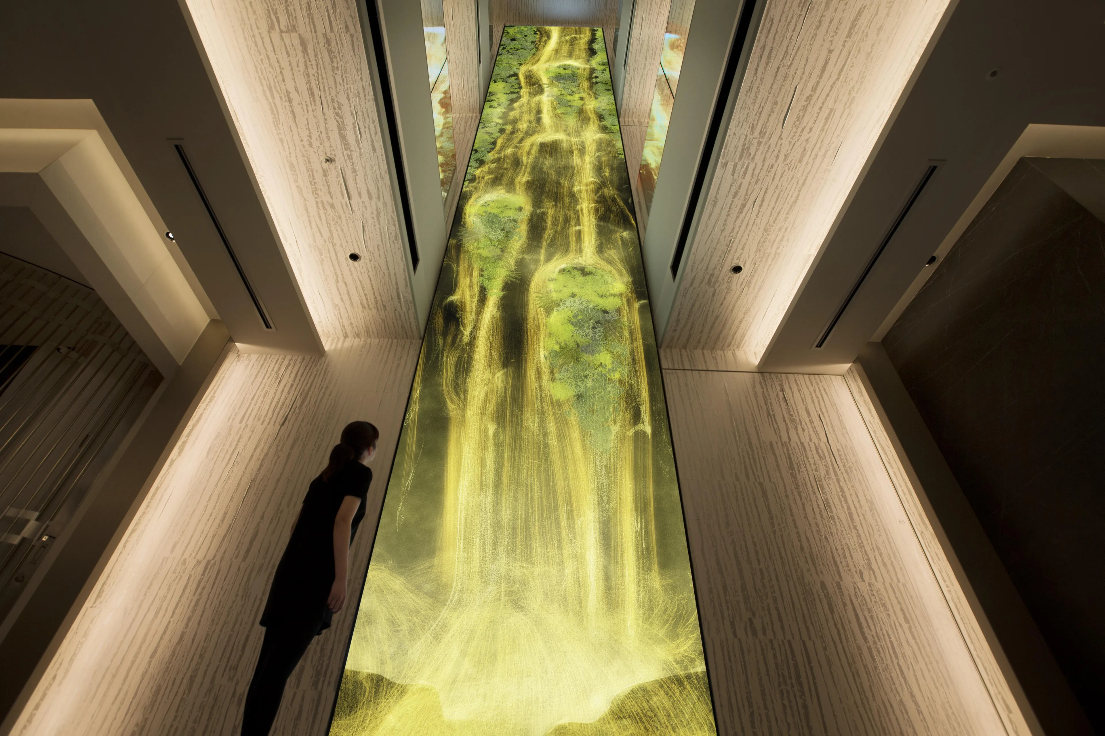 Universe of Water Particles is a virtual waterfall created in a virtual 3-D space using teamLab’s concept of ultrasubjective space, a term that refers to the depiction of space found in premodern Japanese painting.