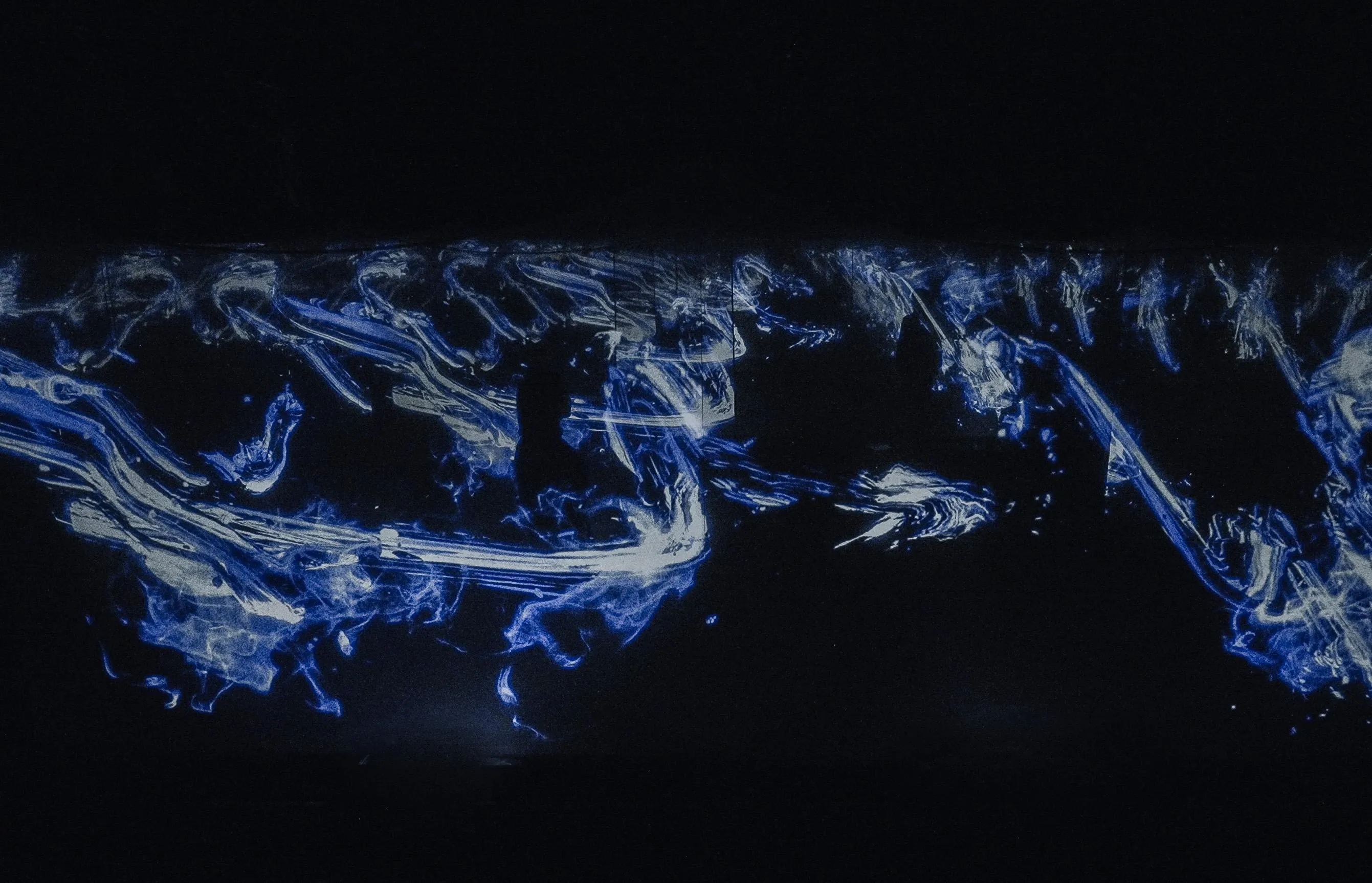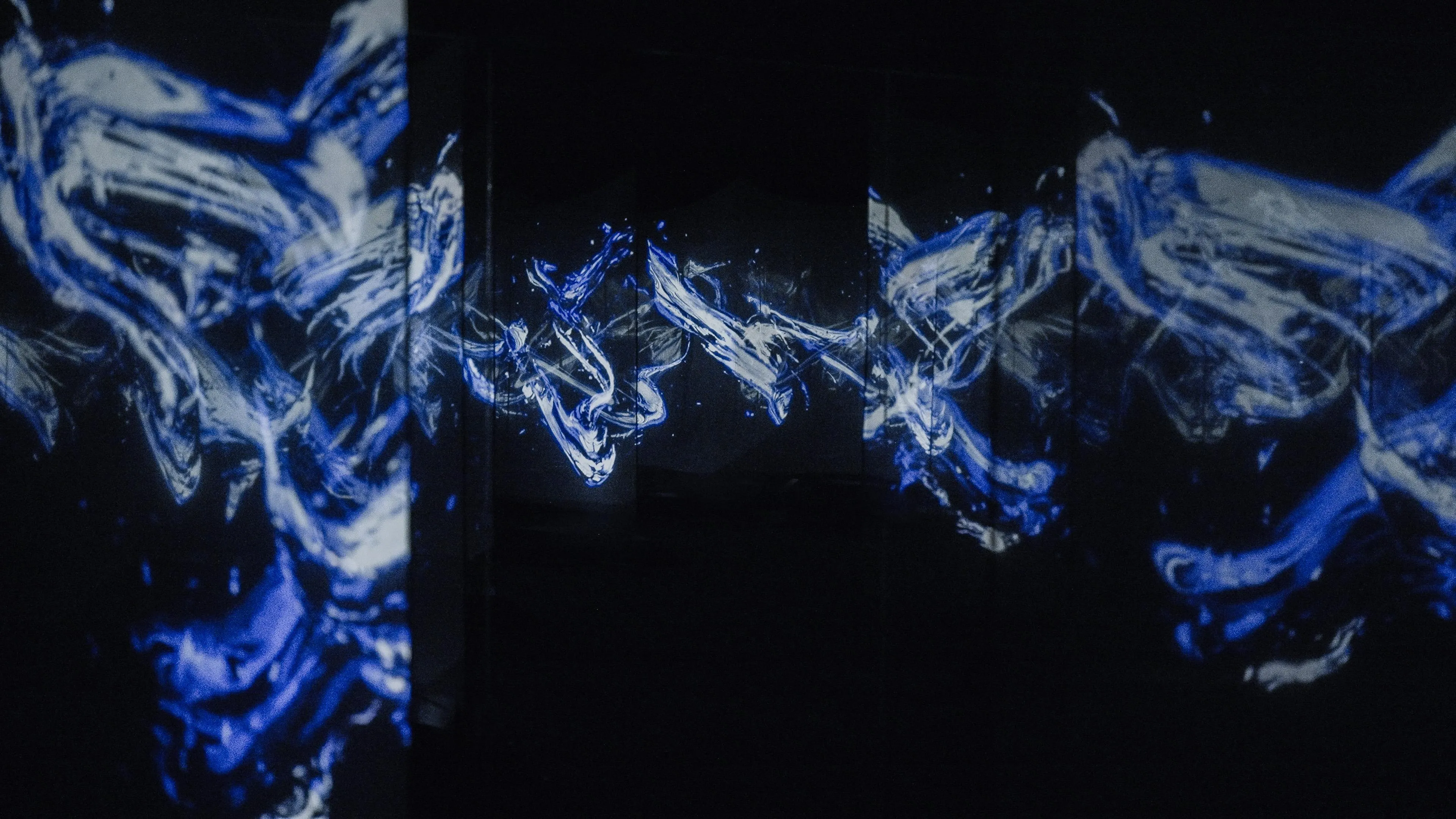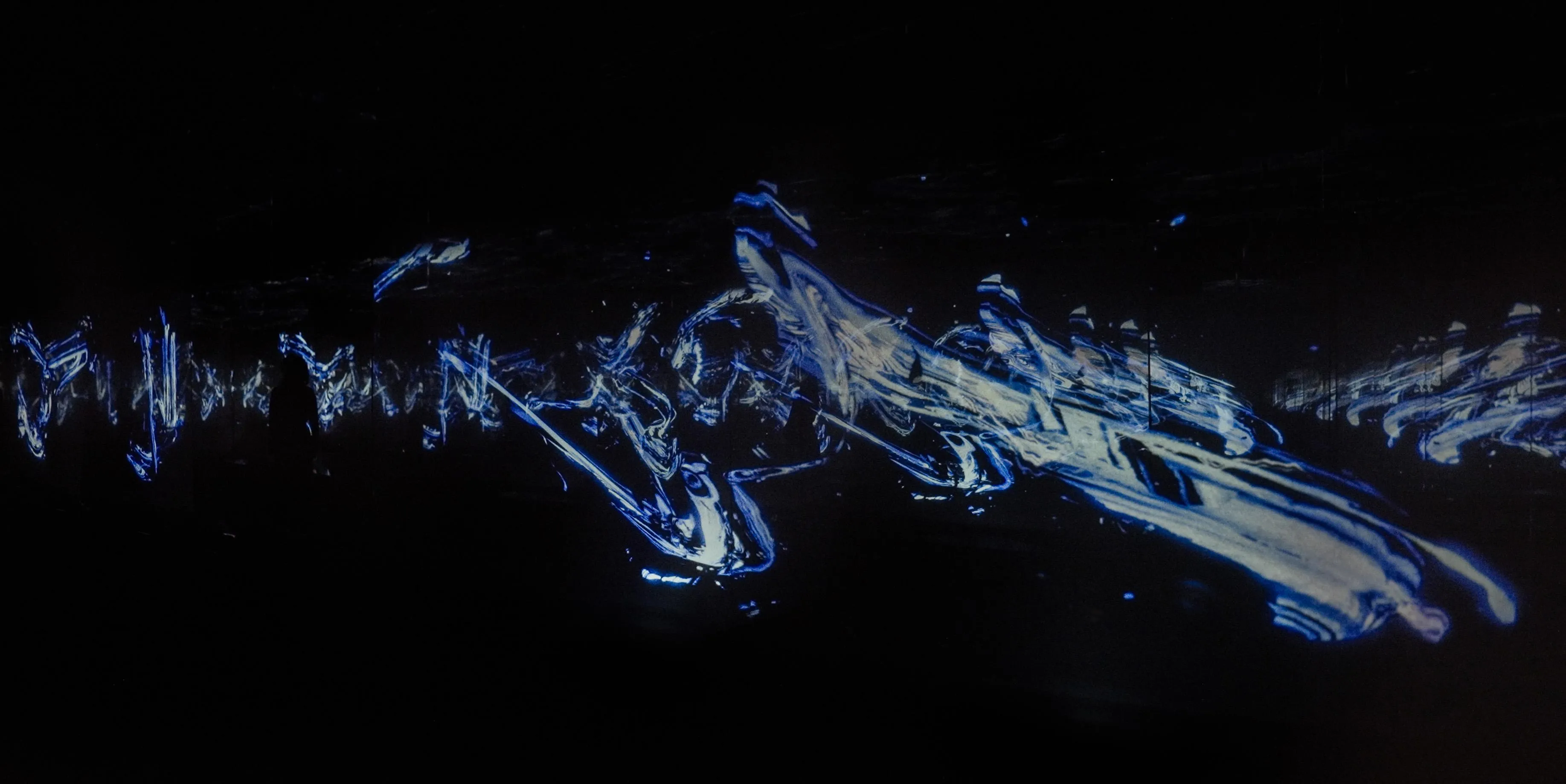 Spatial Calligraphy is a form of calligraphy drawn in space that teamLab has been exploring since it was founded. The artwork reconstructs calligraphy in three-dimensional space to express the depth, speed, and power of the brush stroke, and that calligraphy is then flattened using the logical structure of space that teamLab calls Ultrasubjective Space. The calligraphy shifts between two and three dimensions.