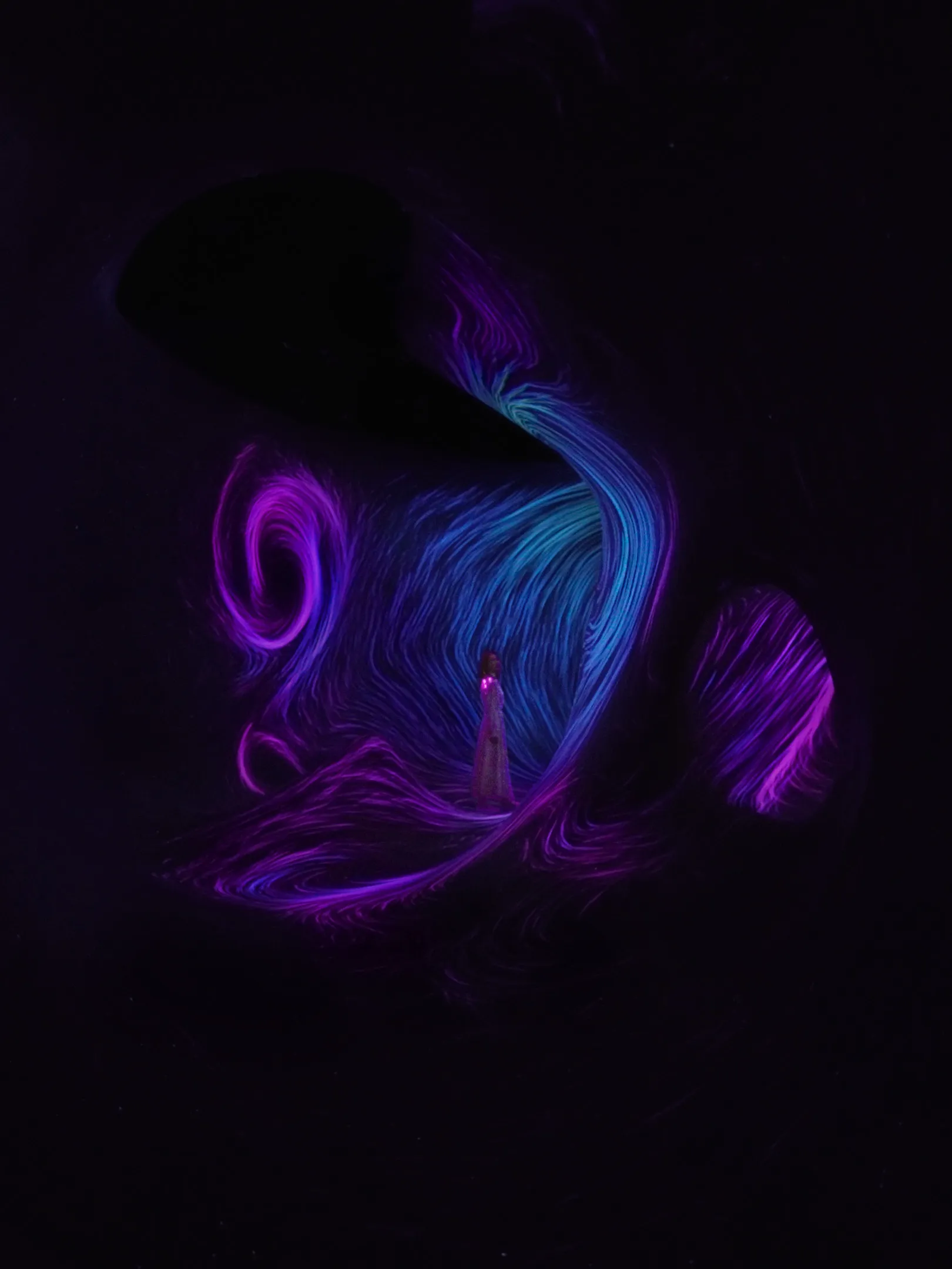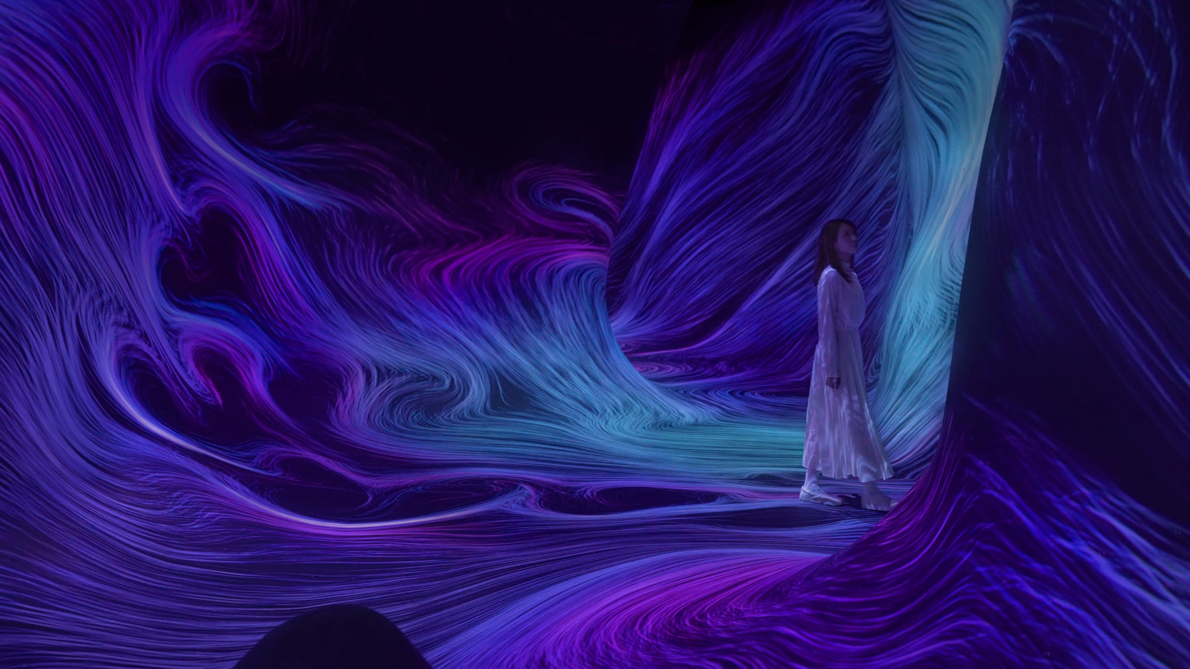 The flow is influenced by the shape of the space and the presence of people, and it continuously interacts with and transforms in relation to all other flows in the artwork space.
