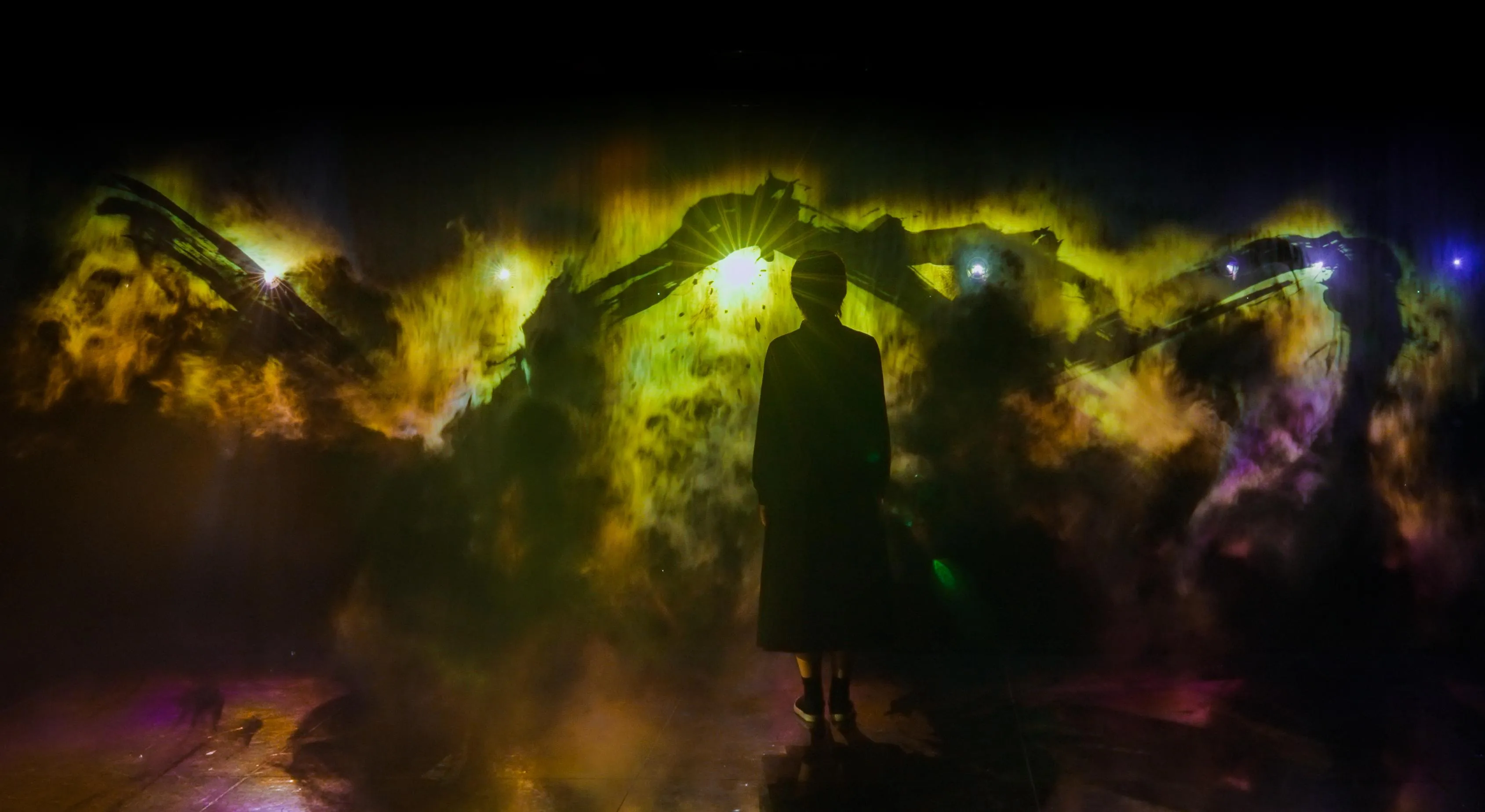 The calligraphy is depicted as one with the space, it begins to dissolve and turns into darkness that blends into the world.