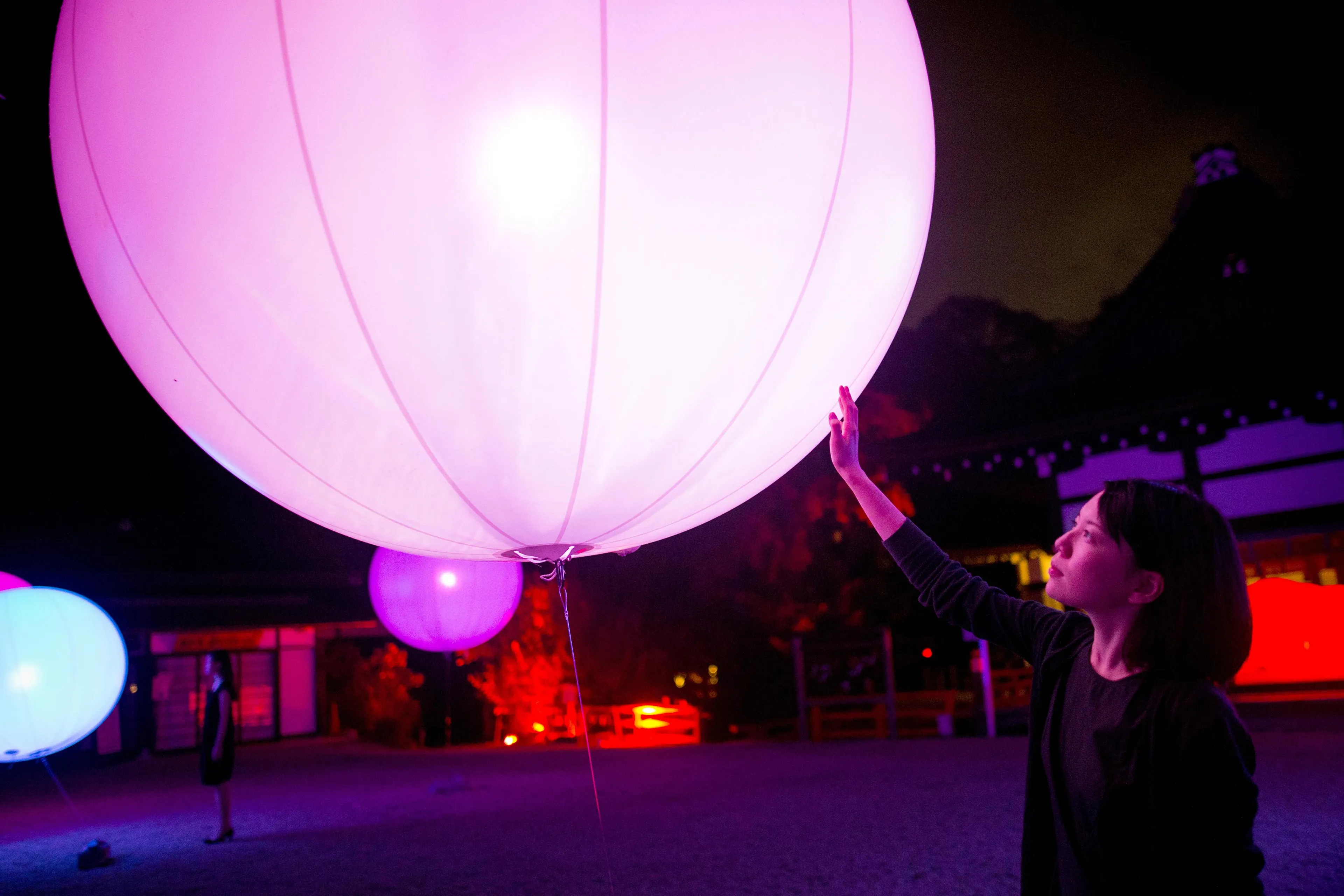 At the World Heritage Site of the Forest of Tadasu at Shimogamo Shrine, teamLab is going to exhibit the art piece "Resonating Trees – Forest of Tadasu at Shimogamo Shrine" by lighting up trees along the road approaching the shrine, as well as the art piece "Resonating Spheres – Forest of Tadasu at Shimogamo Shrine" by illuminating the inside of the tower gate.