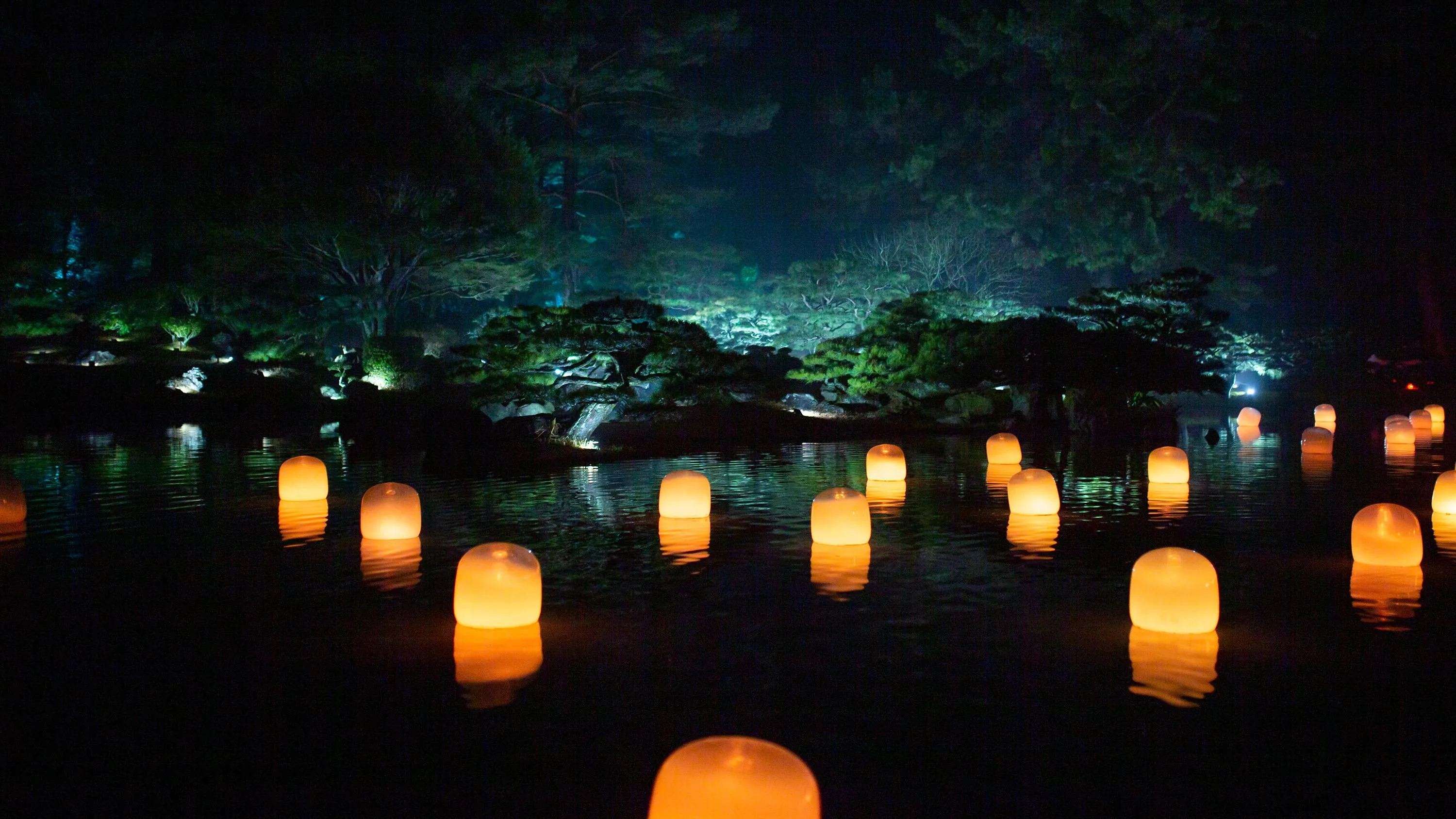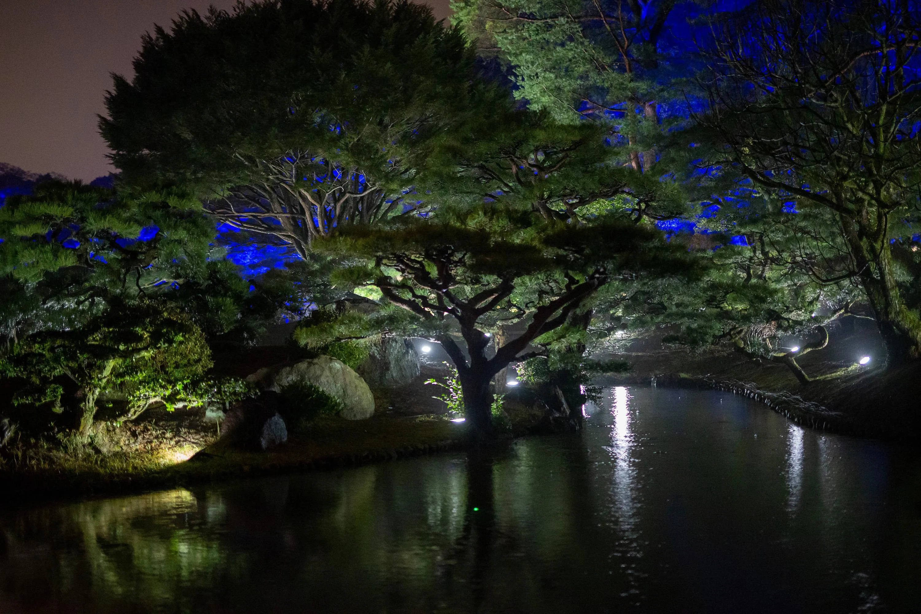 The island, trees, and stones of Kansui Pond shine brightly. The light is autonomous, slowly blinking.