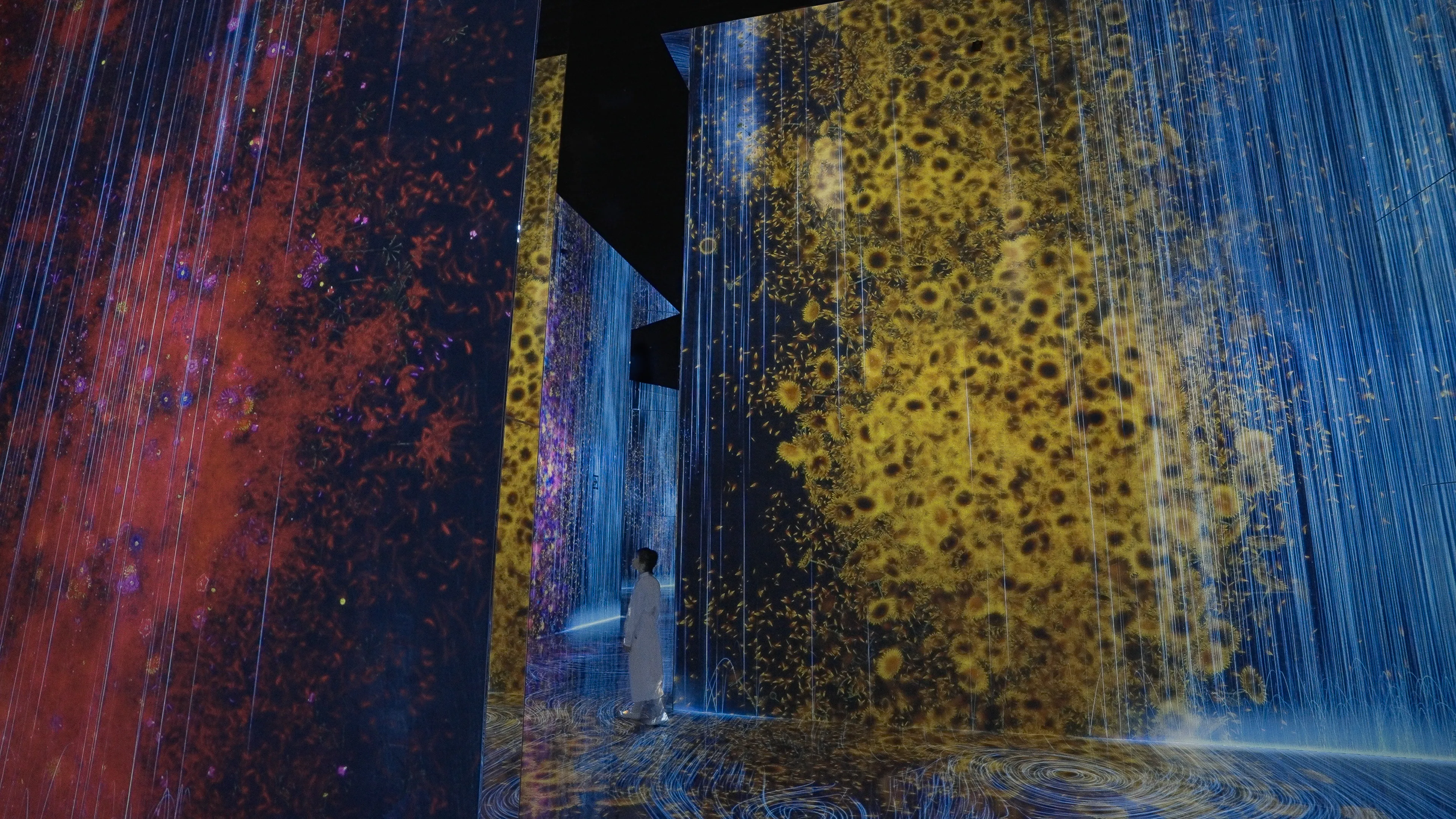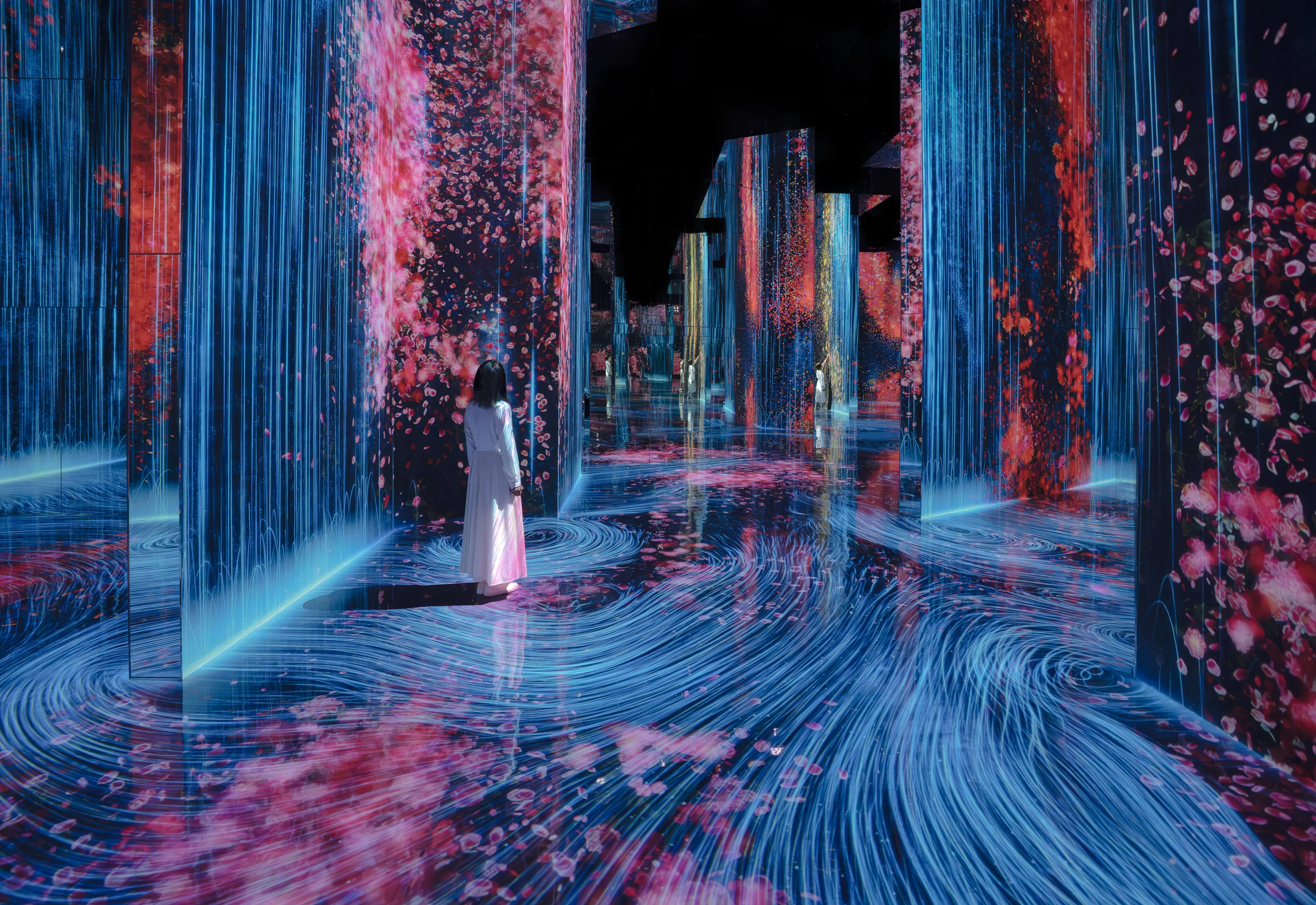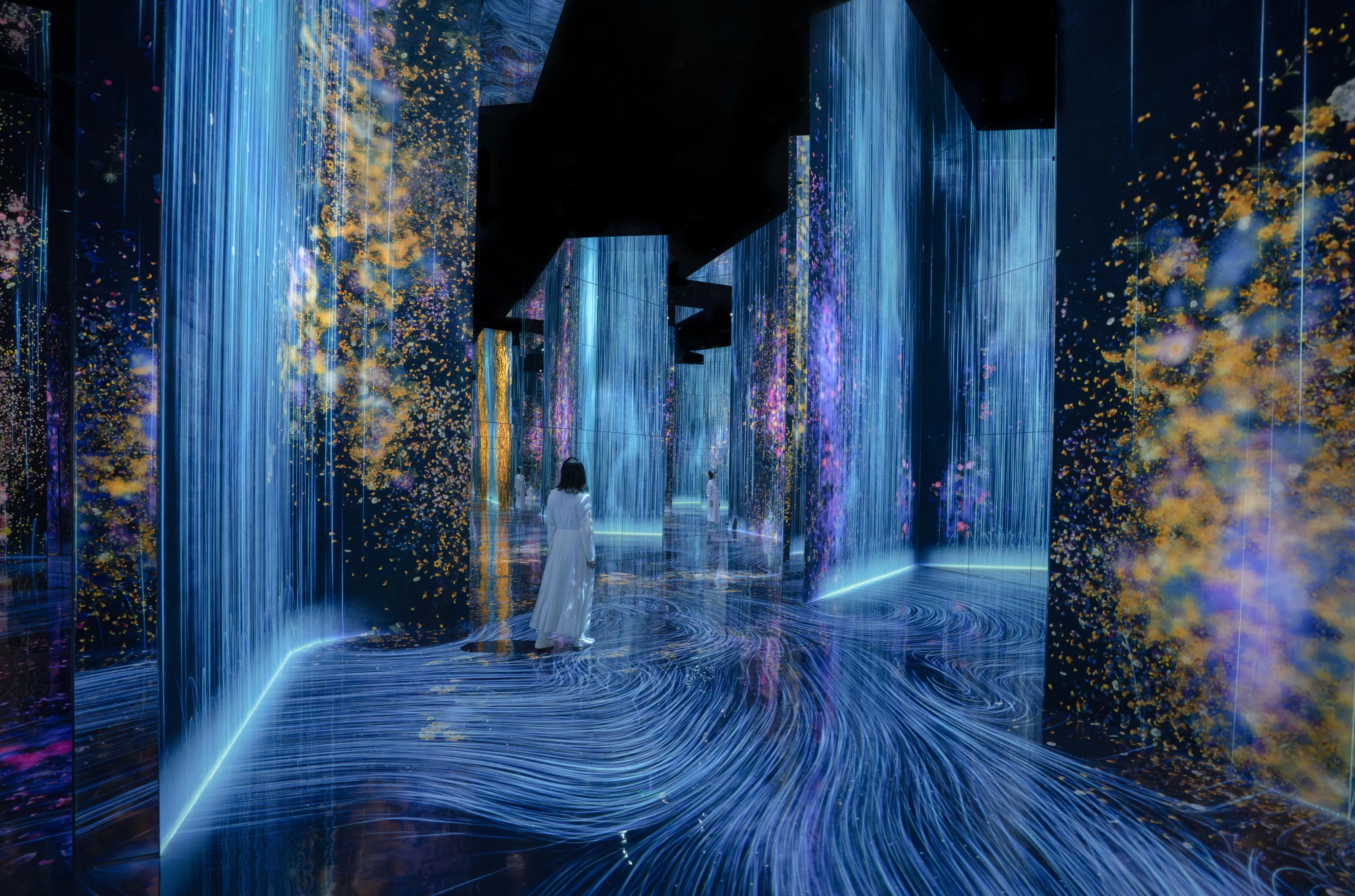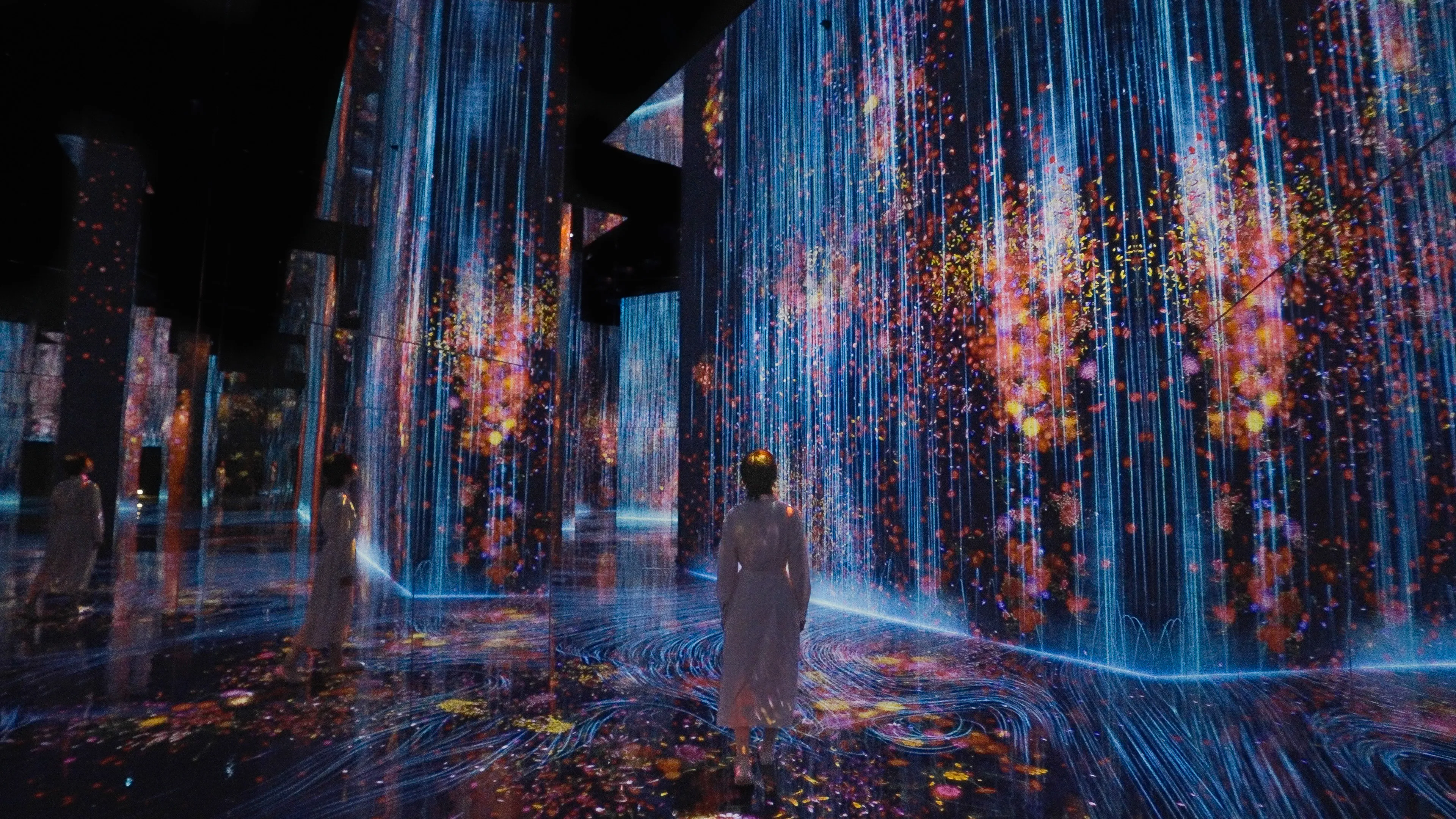 Universe of Water Particles is a virtual waterfall created in a virtual 3-D space using teamLab’s concept of ultrasubjective space, a term that refers to the depiction of space found in premodern Japanese painting.