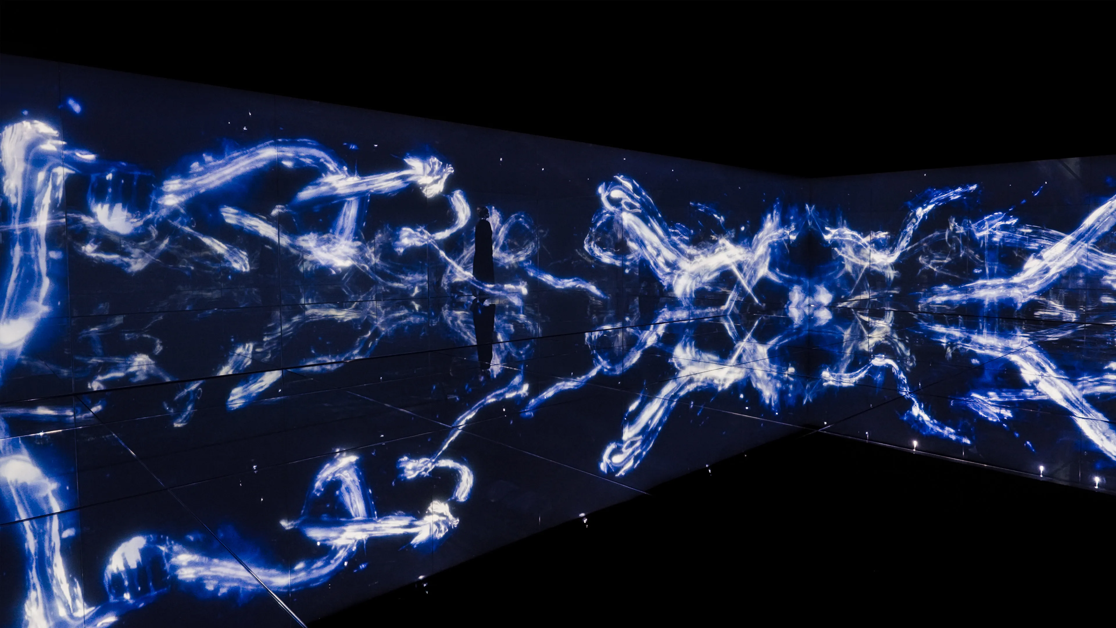Spatial Calligraphy is a form of calligraphy drawn in space that teamLab has been exploring since it was founded. The artwork reconstructs calligraphy in three-dimensional space to express the depth, speed, and power of the brush stroke, and that calligraphy is then flattened using the logical structure of space that teamLab calls Ultrasubjective Space. The calligraphy shifts between two and three dimensions.