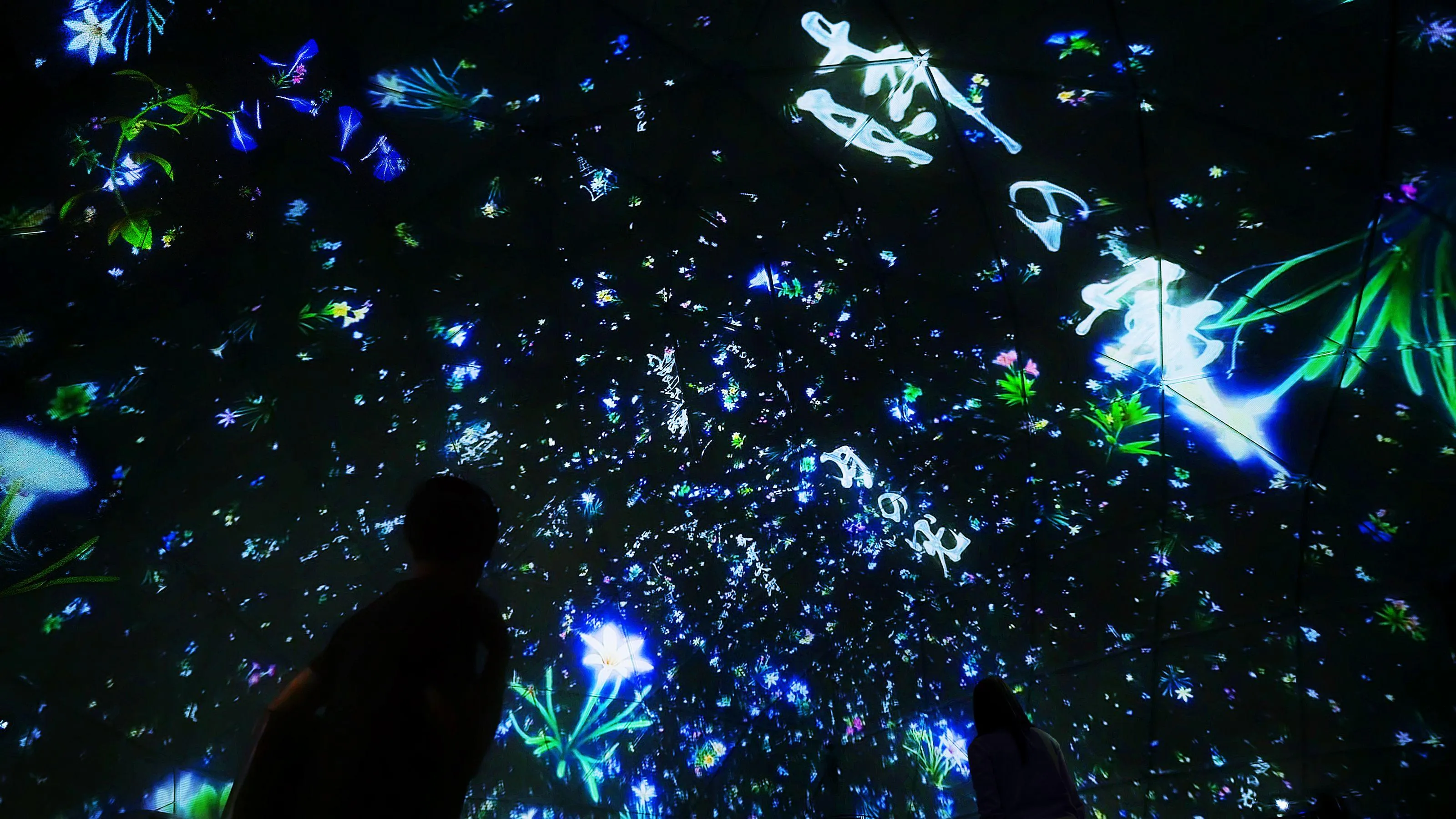 夏の“夜空”を見上げていたら、たくさん草花とともにメッセージが降ってきた―。さまざまな分野のスペシャリストで構成されるウルトラテクノロジスト集団「チームラボ」と書道家、紫舟さんによるコラボレーション作品「降りそそぐ言葉、舞いおりる花-夏」が東京都渋谷区の恵比寿ガーデンプレイス センター広場で公開されている。