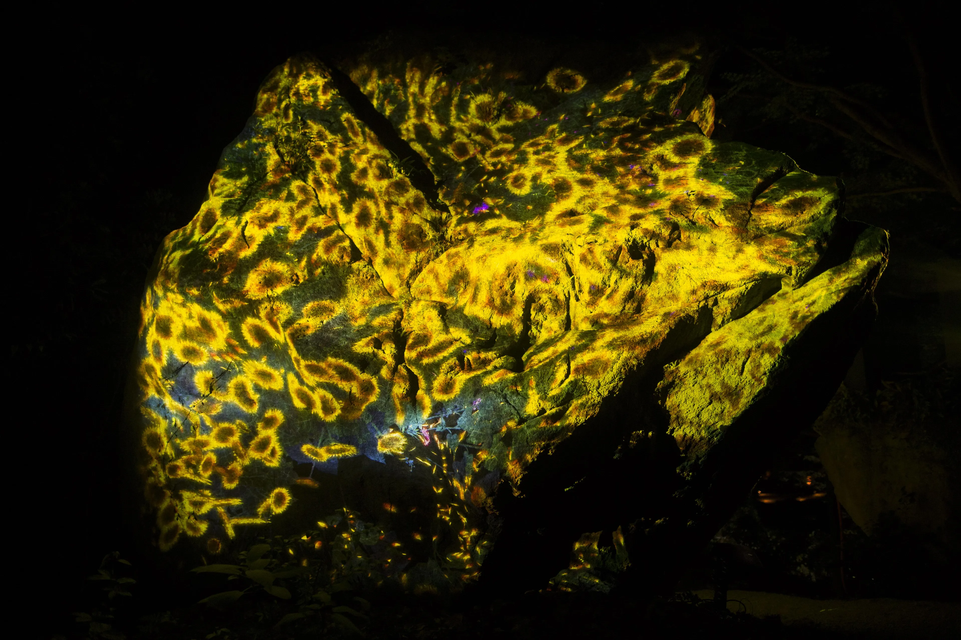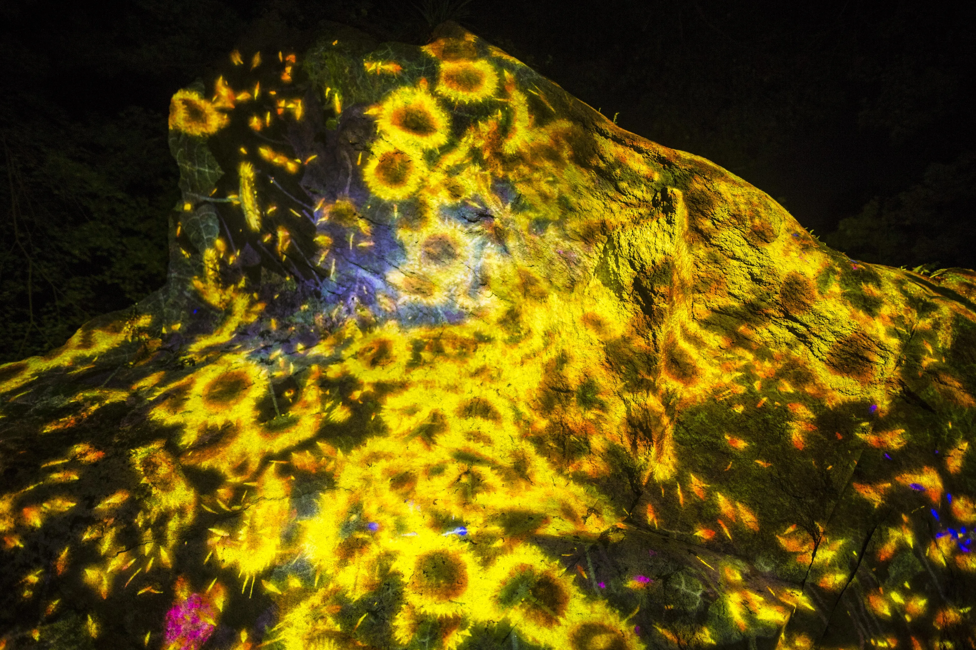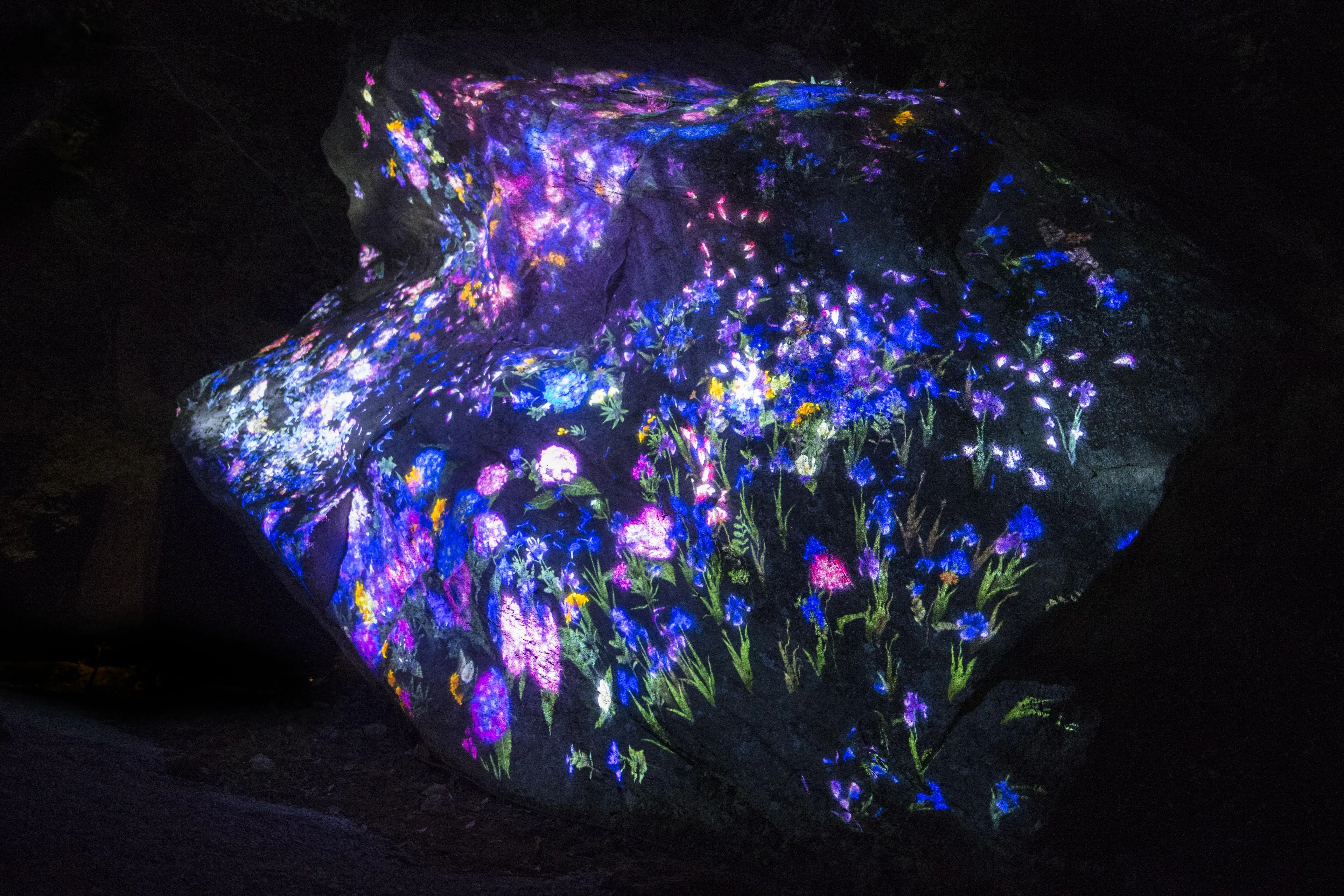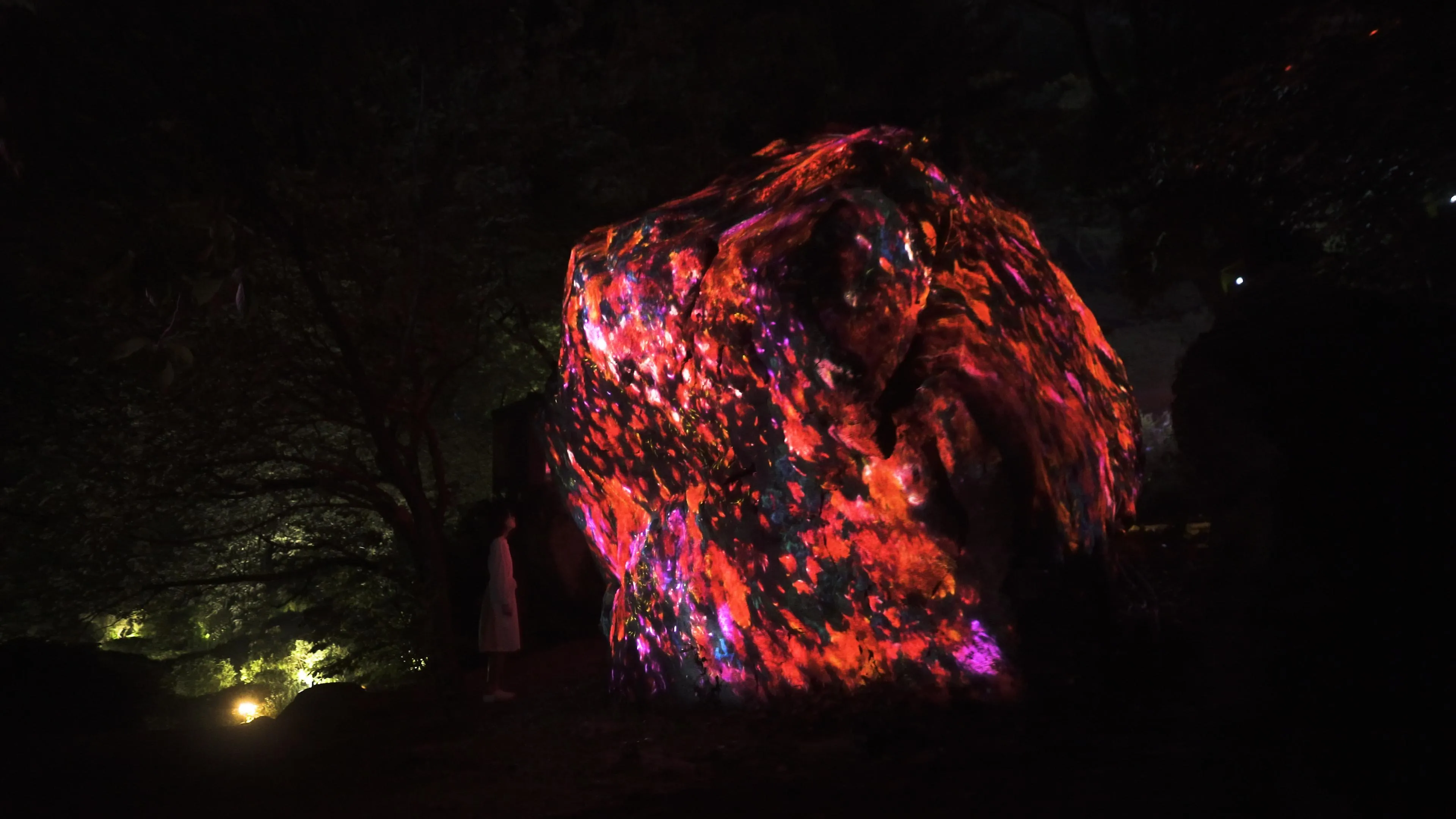 在生长了苔藓的巨石(高5.5m宽4.6m深6.5m)上,花朵们会永远重复着盛开然後散落的过程。本作品会在一个小时的时间中,让在这个地域,一年内生长的花朵们盛开然後散落,不断地产生变化。