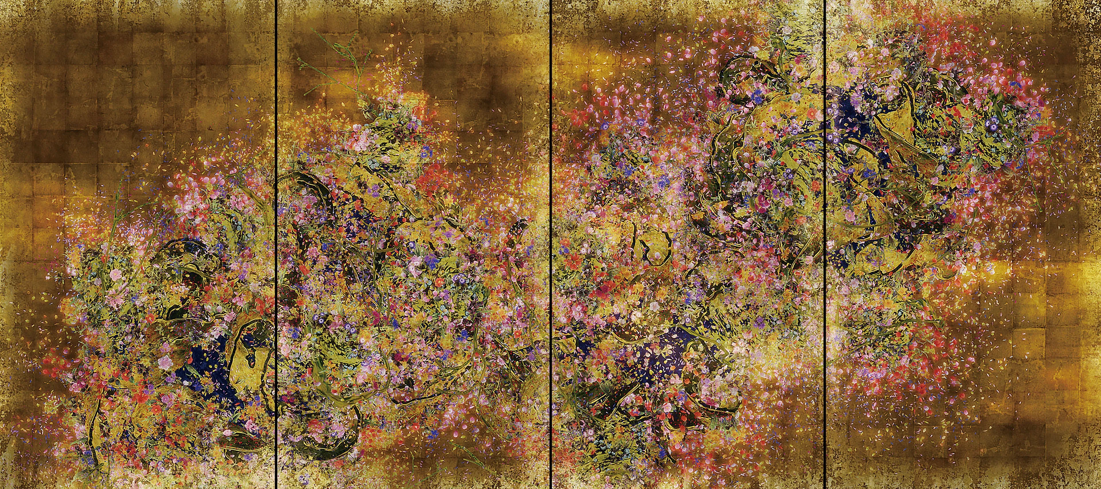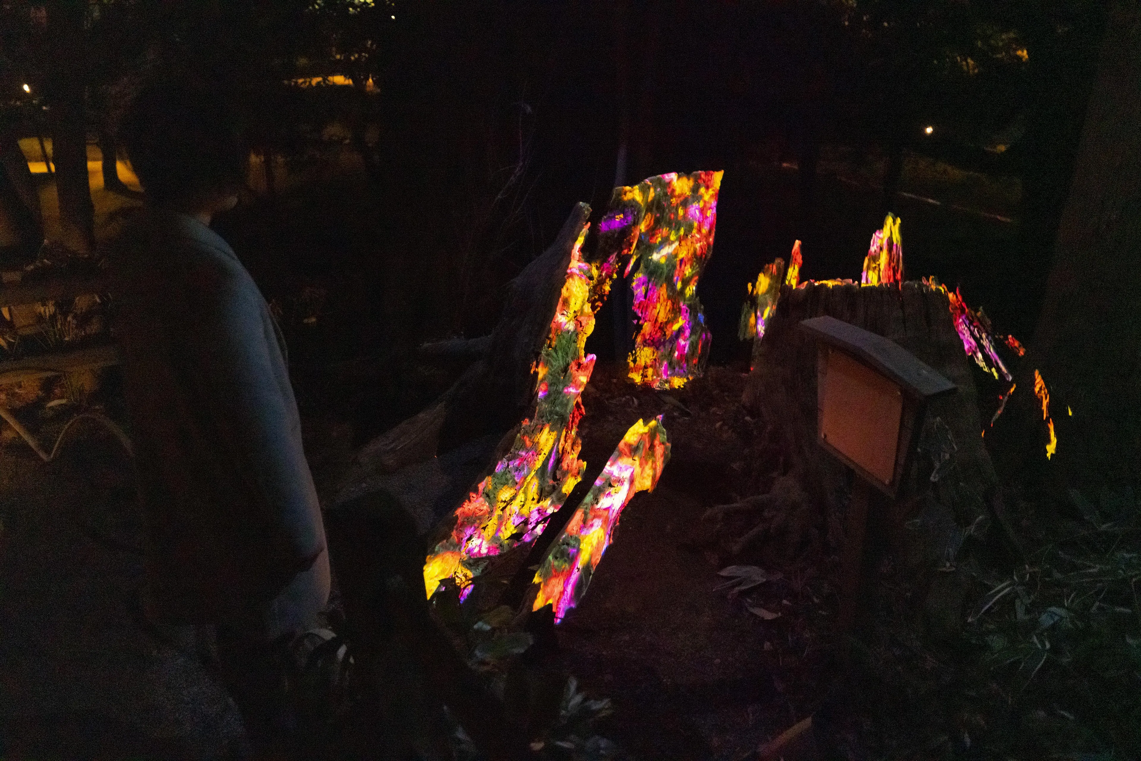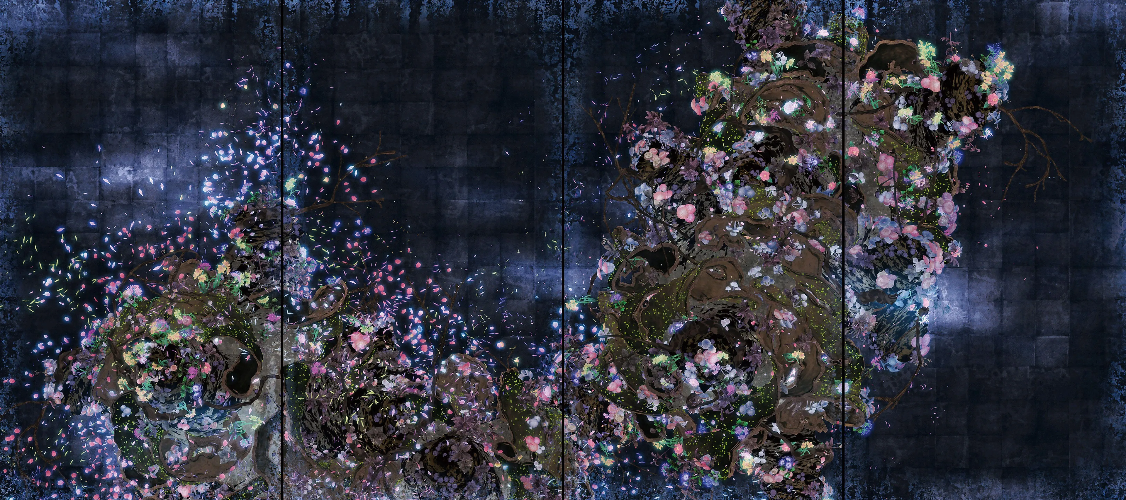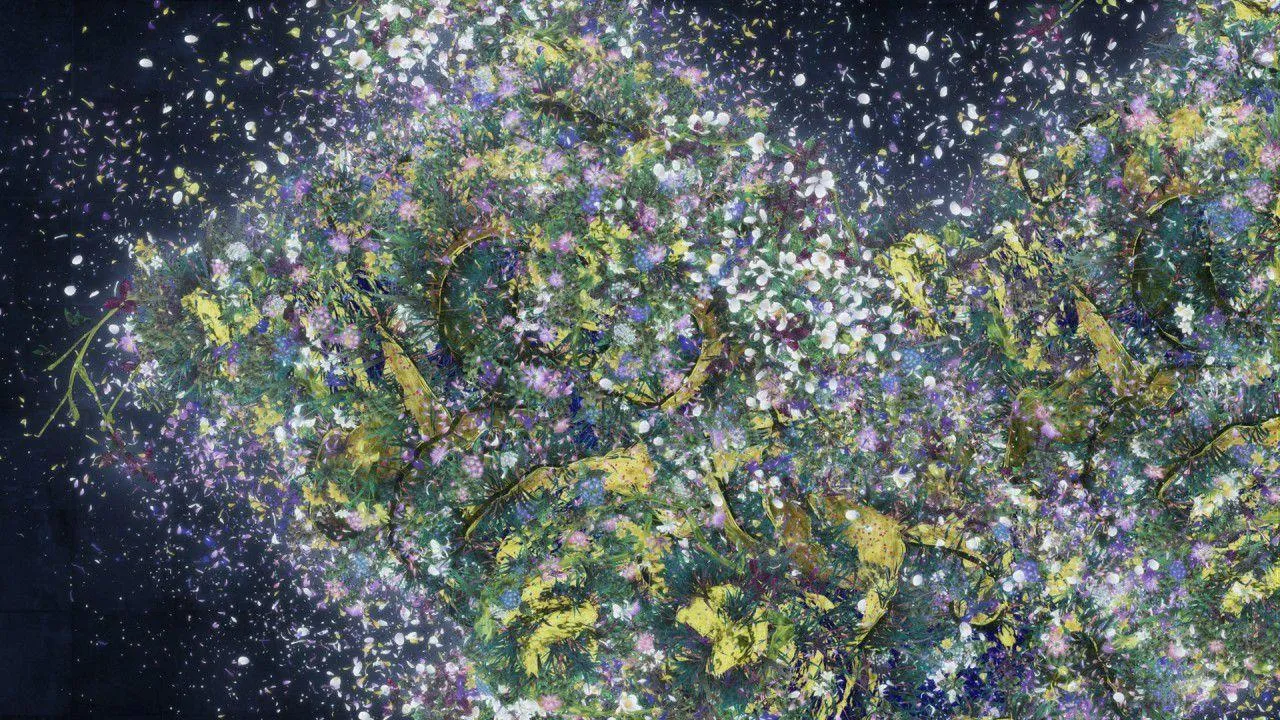 在生长了苔藓的巨石(高5.5m宽4.6m深6.5m)上,花朵们会永远重复着盛开然後散落的过程。本作品会在一个小时的时间中,让在这个地域,一年内生长的花朵们盛开然後散落,不断地产生变化。