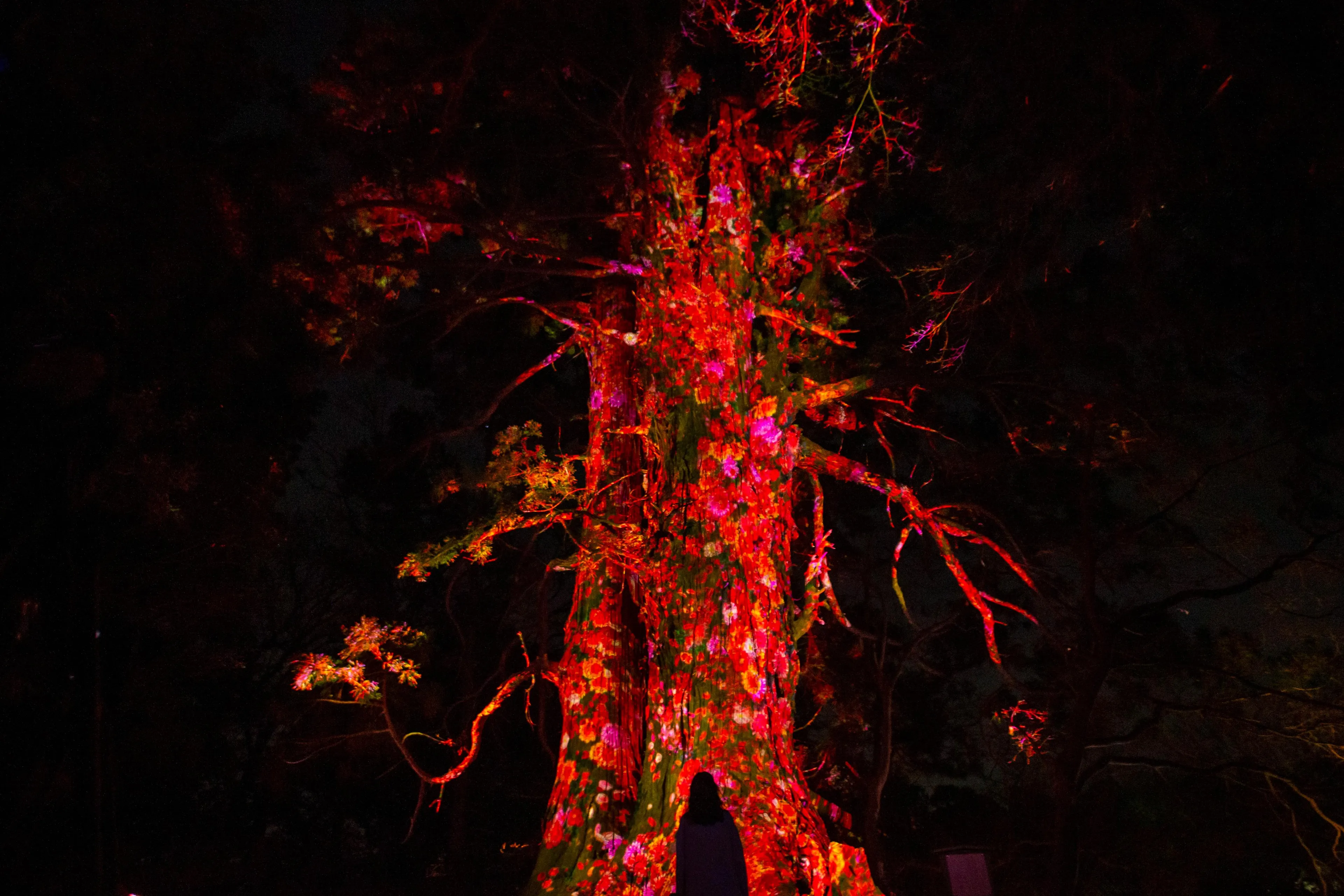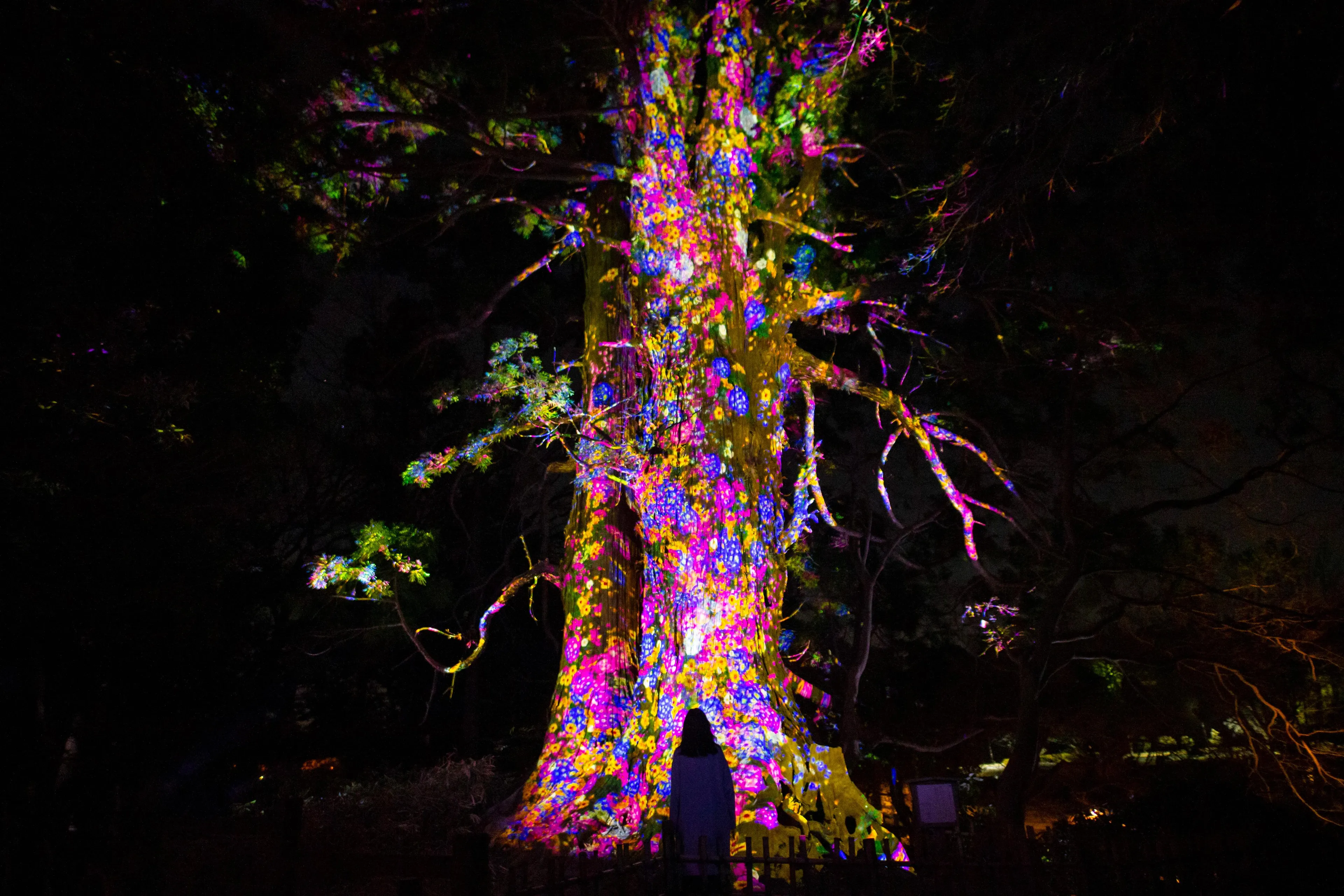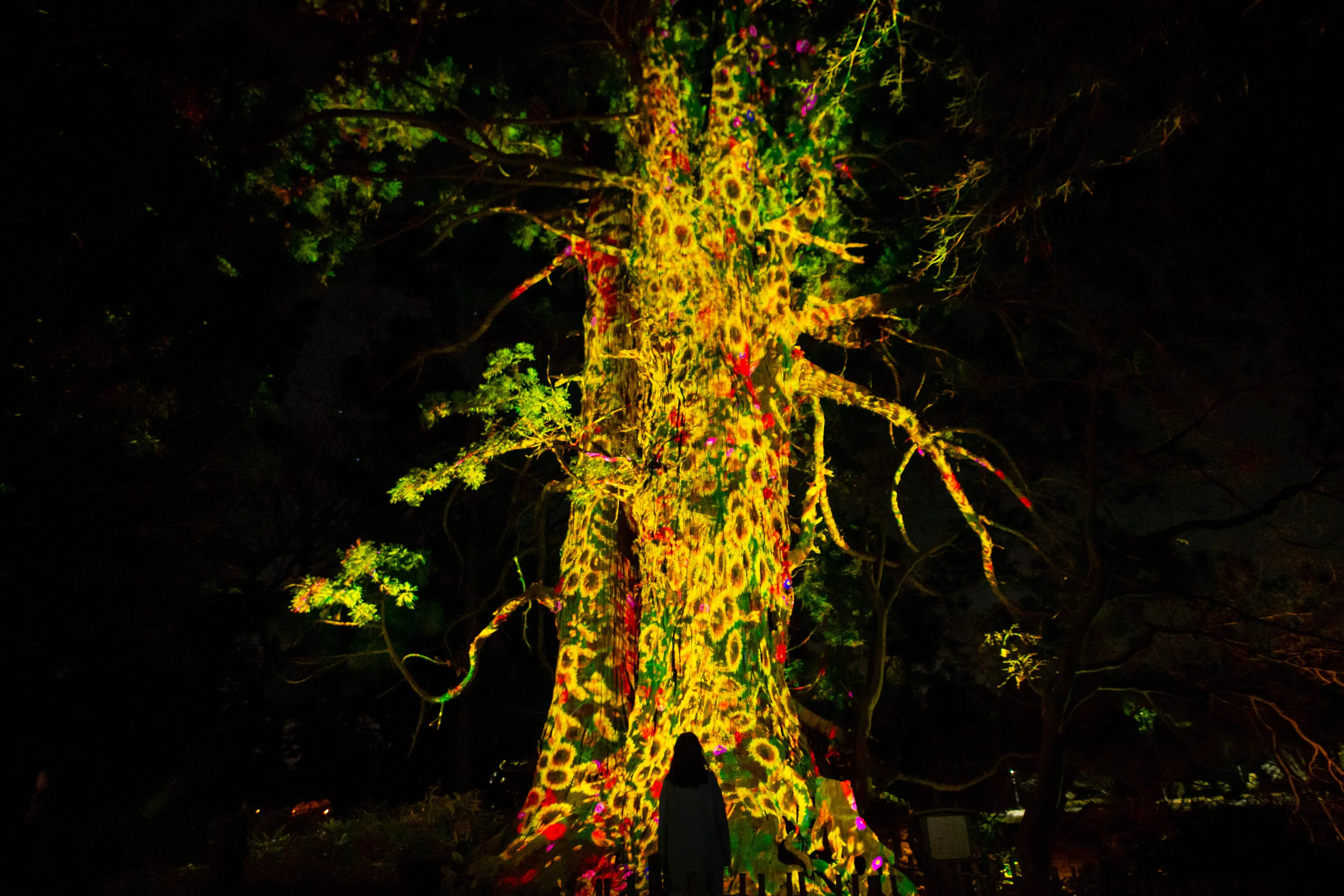 江户时代后期(1842年)建成的偕乐园里的大杉林,在近乎无法察觉到的缓慢的时间流逝中日夜发生着变化,并年复一年累积了久远的时间形成了现在的空间。巨木在偕乐园建造时就已经在此地存在很久了。这些重复着生与死的花朵也拥有不同的时空。在这里各种各样的时空交错并重叠。