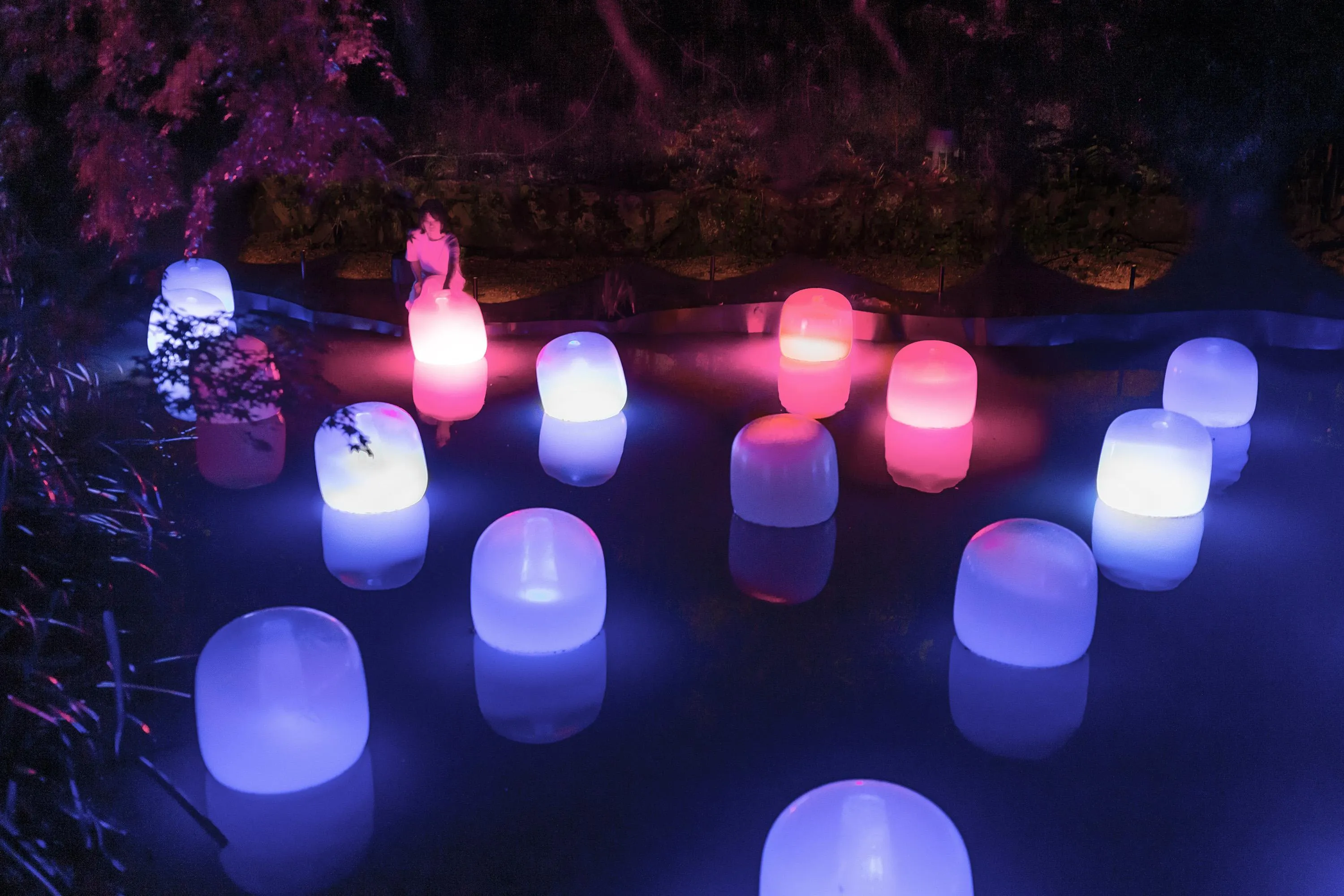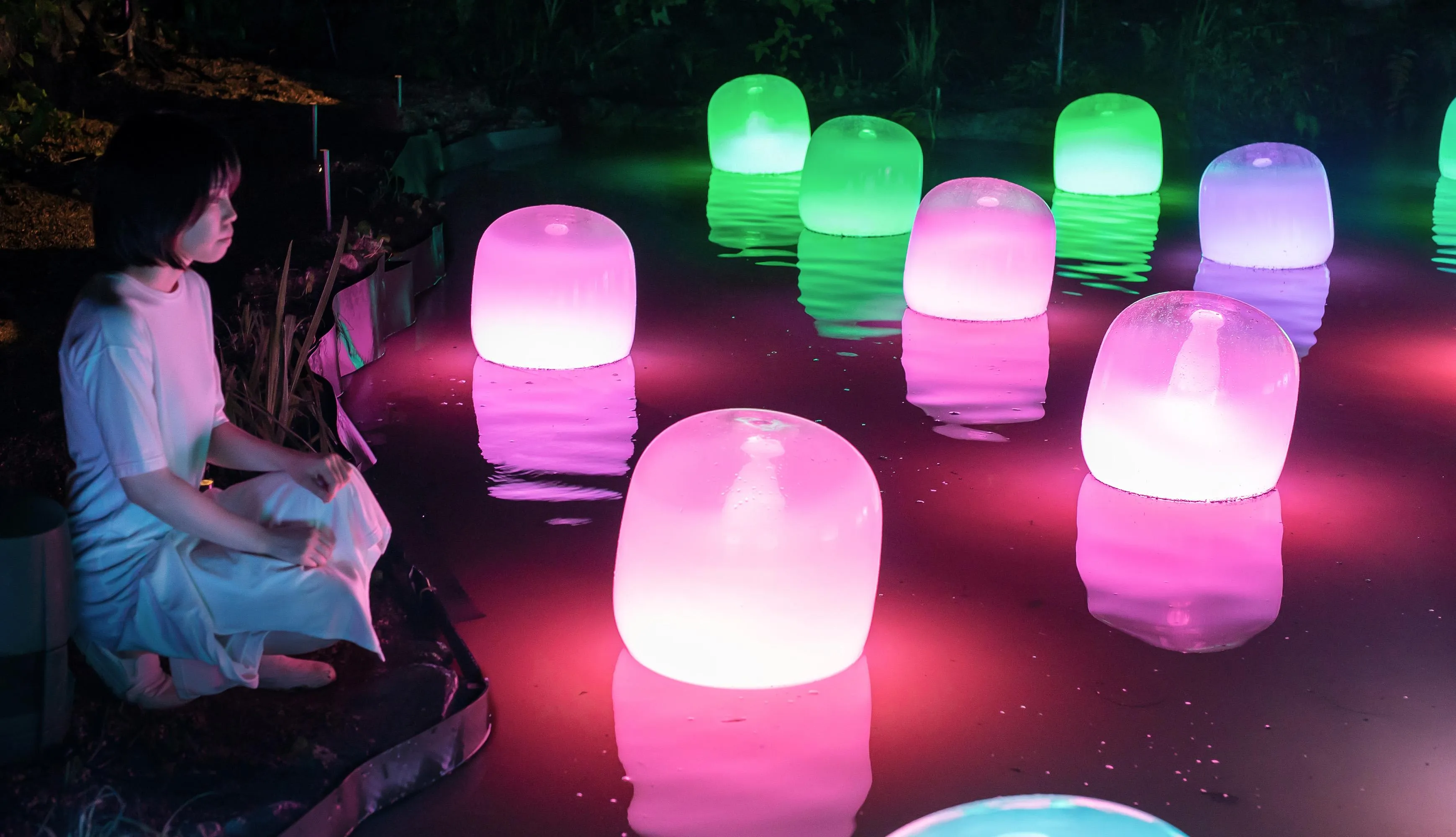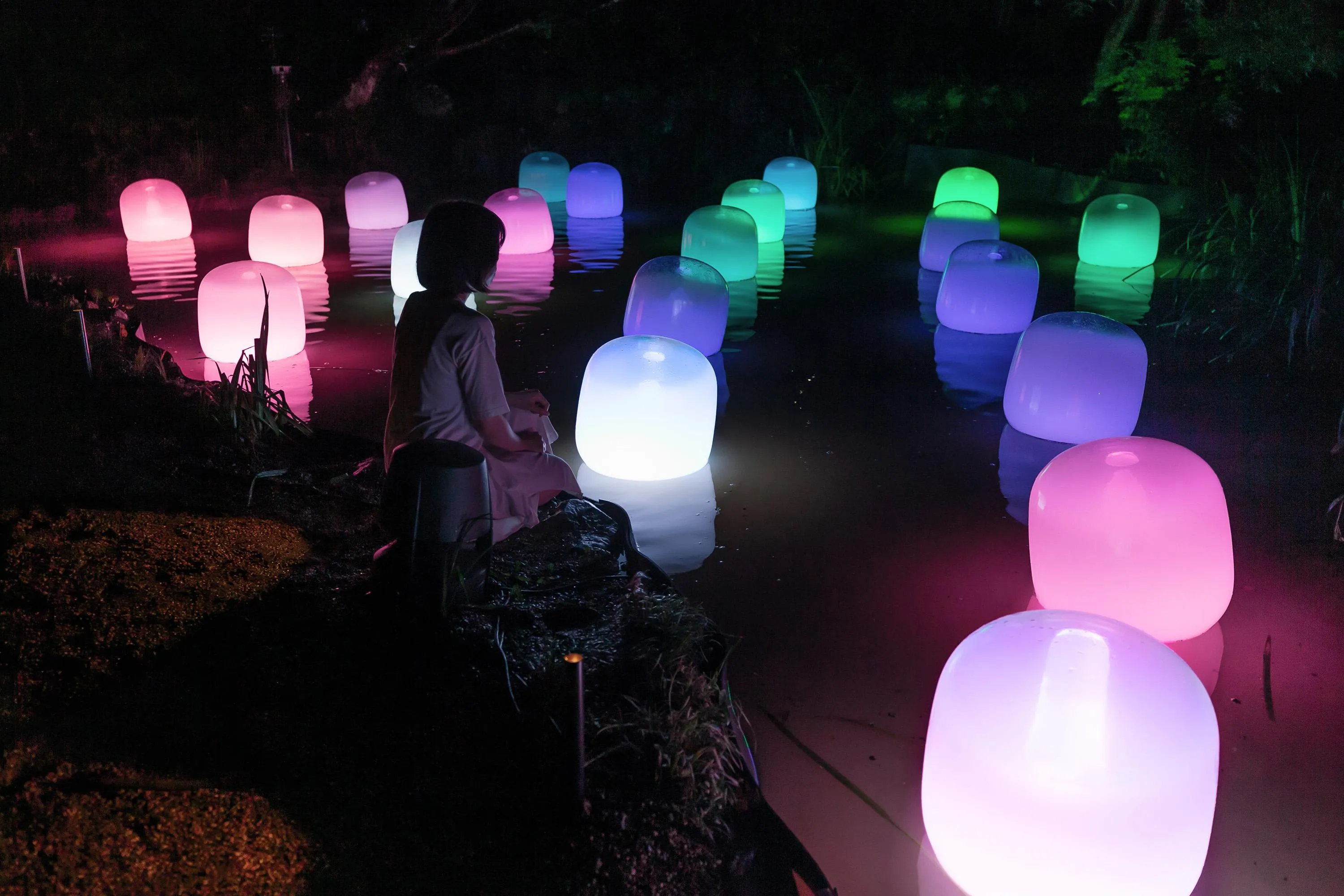 漂浮在水面上的灯,各自是自主的。当人们轻推灯,在灯的附近驻足,或者当风吹过,灯稍有倾斜时,会发出强烈的光和音色。灯的光芒,会接连传播到其他的灯上,音色也会连续下去。传播出去的光,必定使所有的灯只强烈地闪烁一次,传播到所有的灯。人们一定会感受到同一个空间内其他人的存在吧。