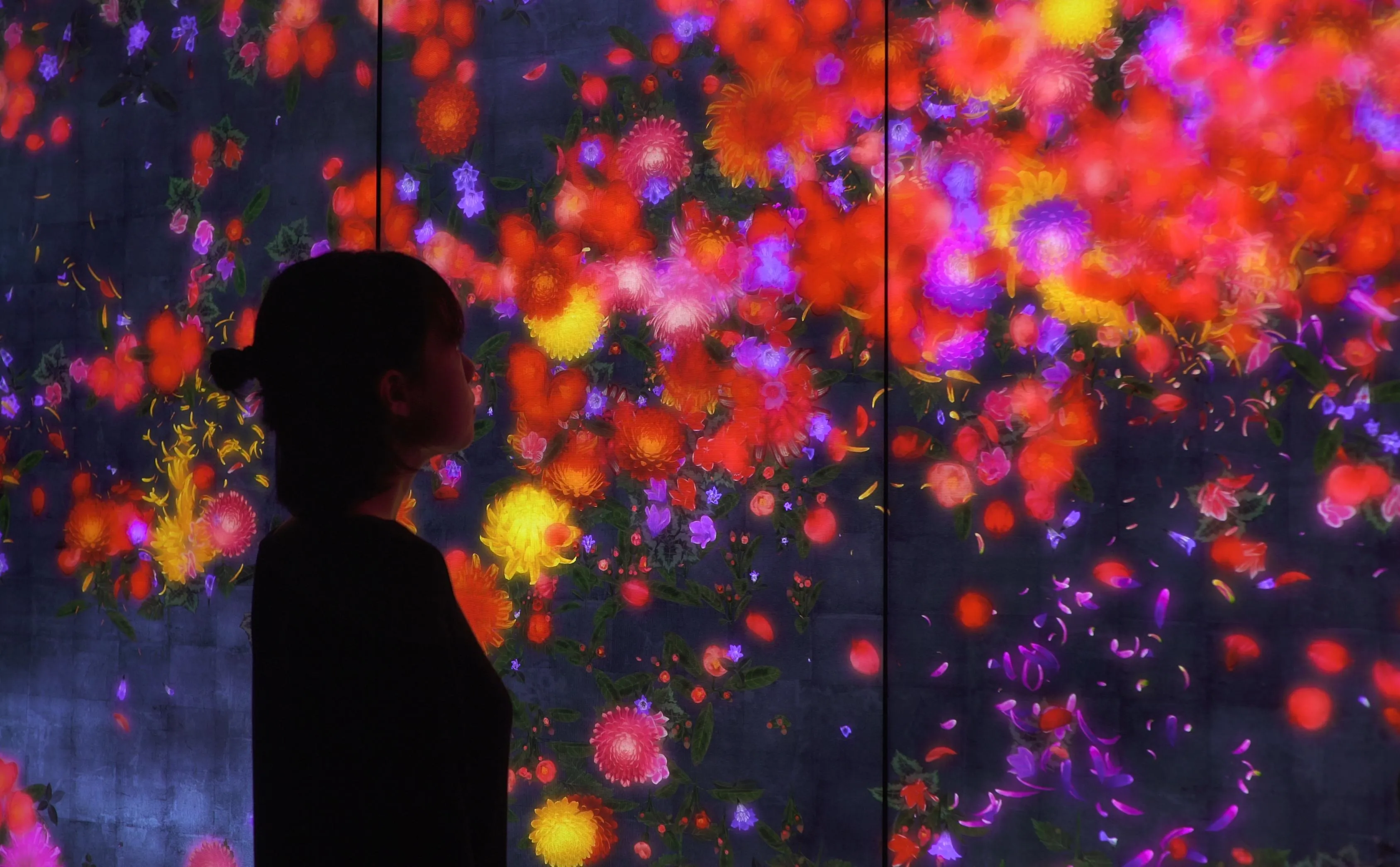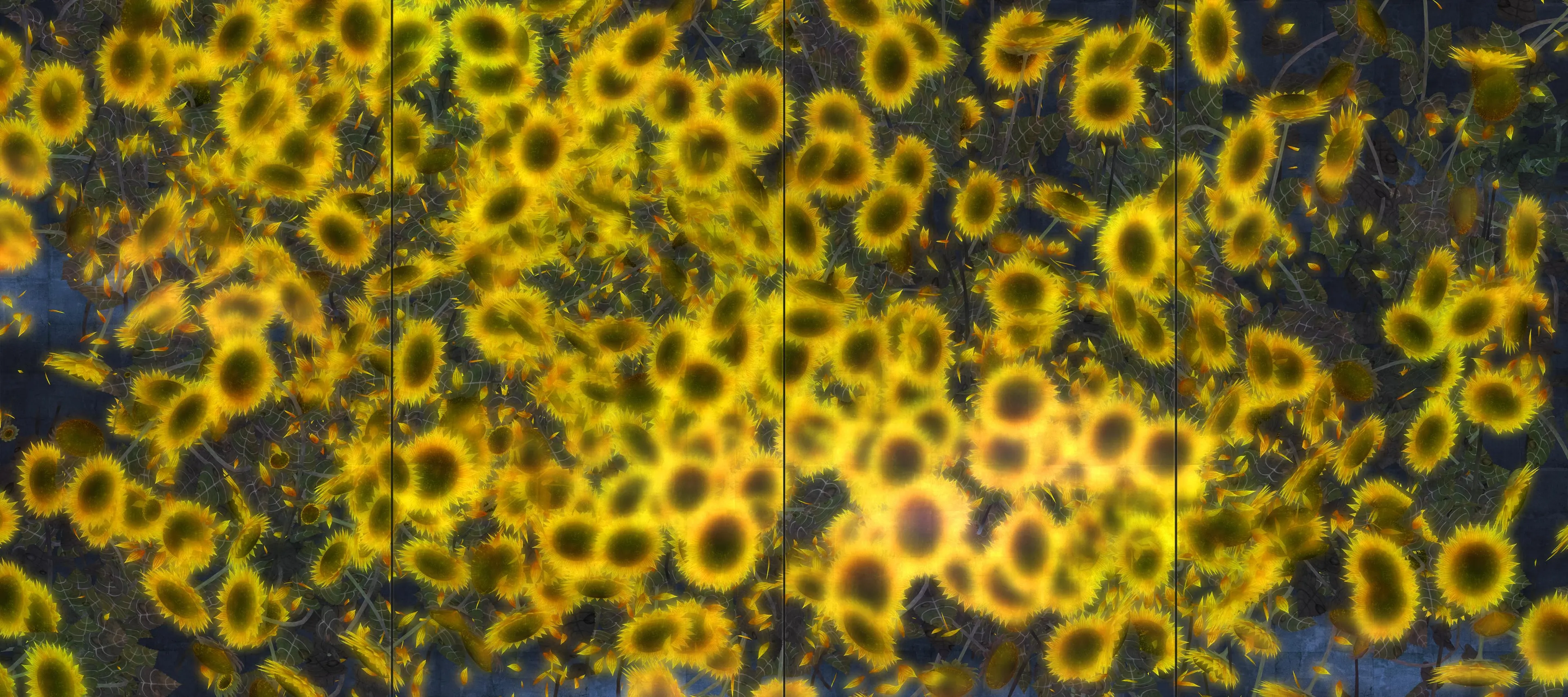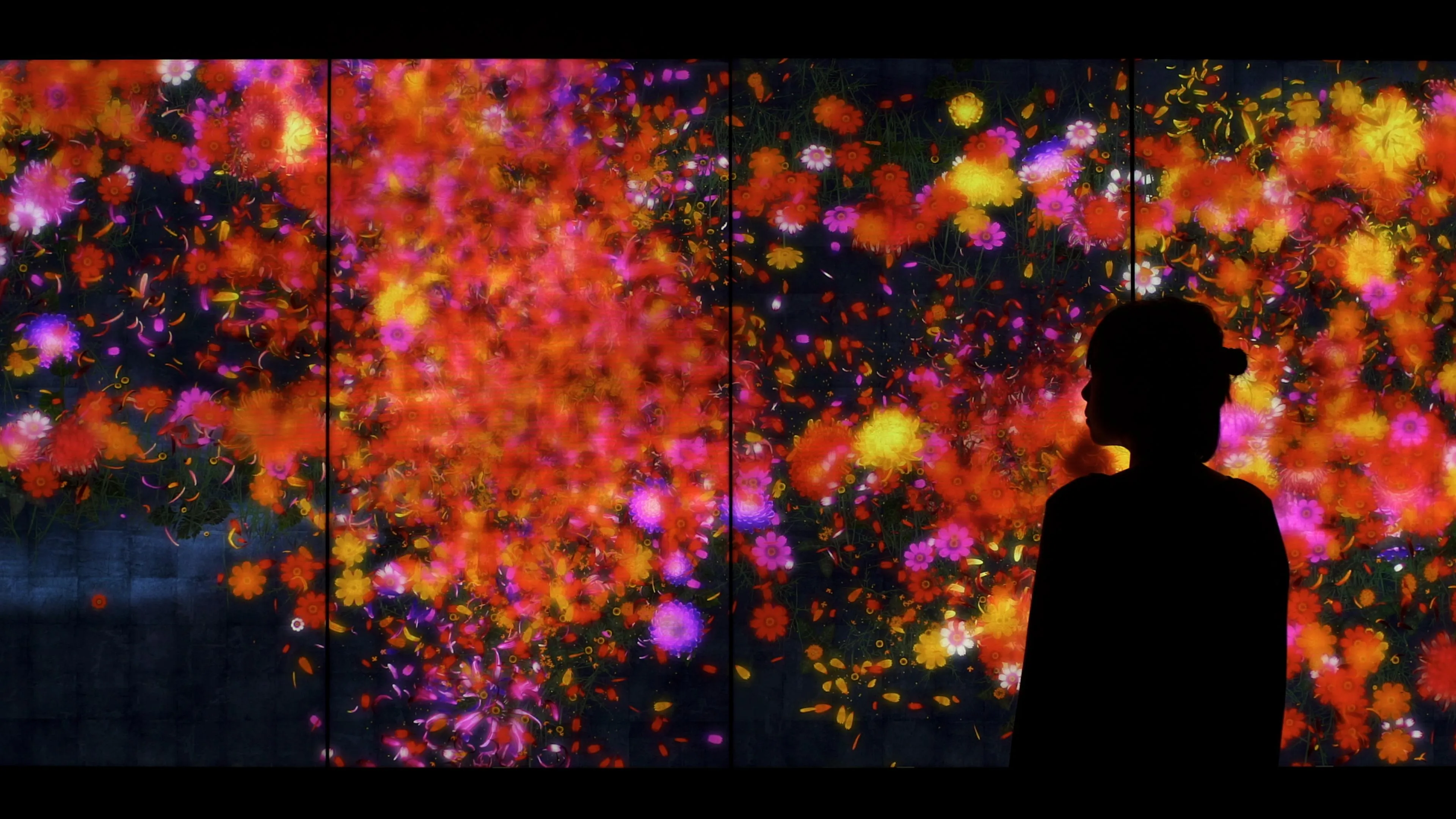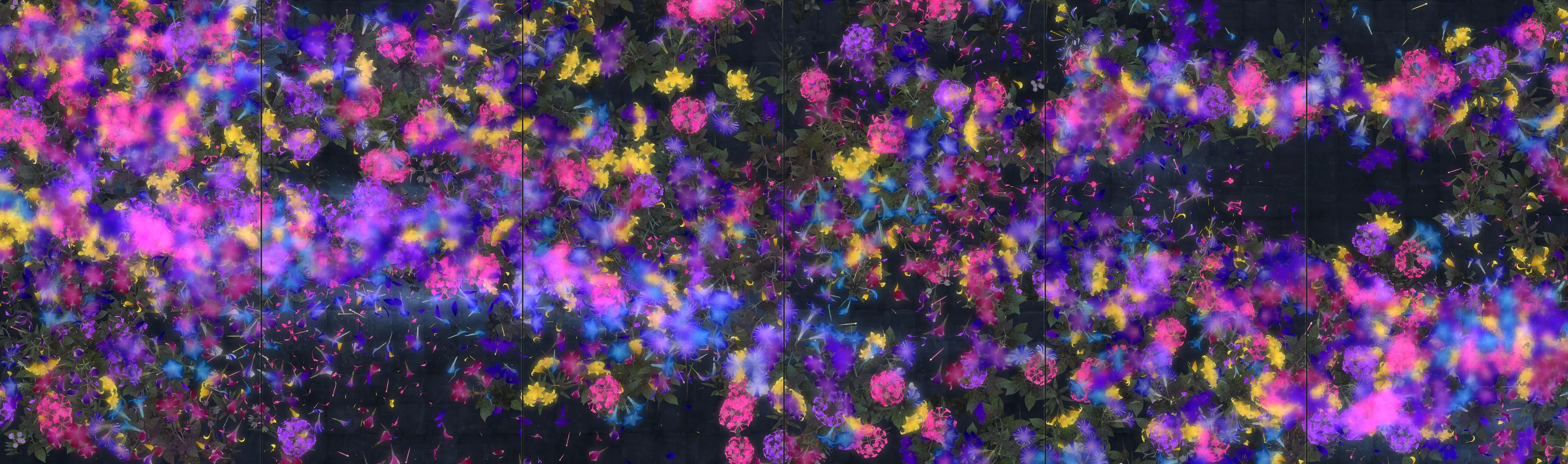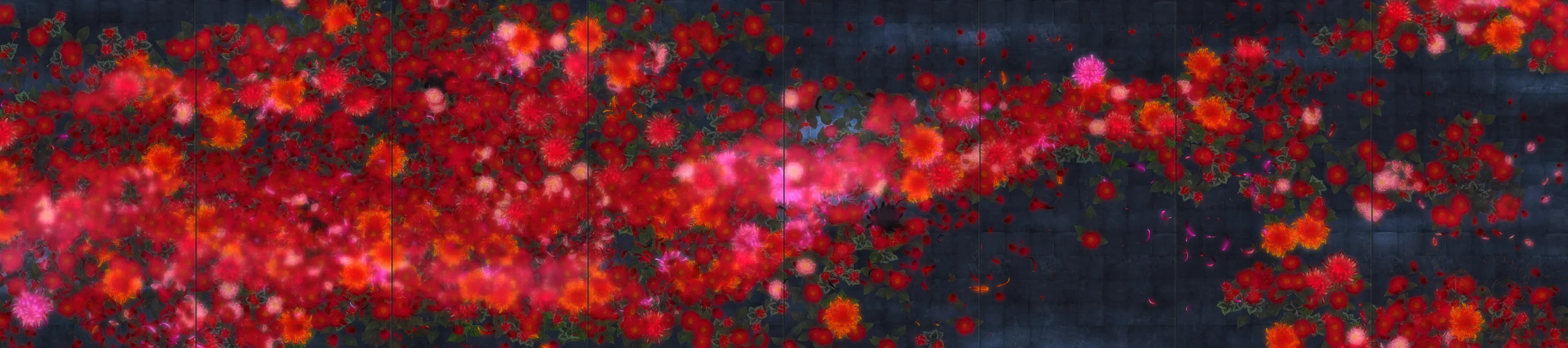 花儿会随着,诞生、盛开,随后散落、枯萎、死去。不断延续着诞生与死灭的循环。人们在作品前走动时,花朵会一起凋零,而停留不动时,花朵会持续绽放并蔓延开来。