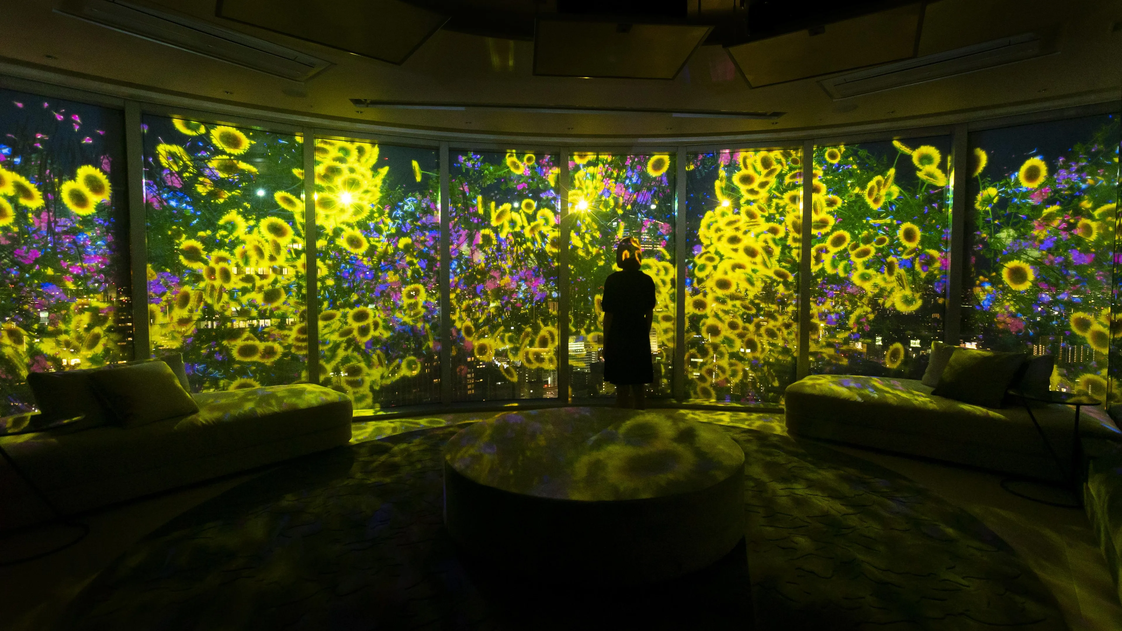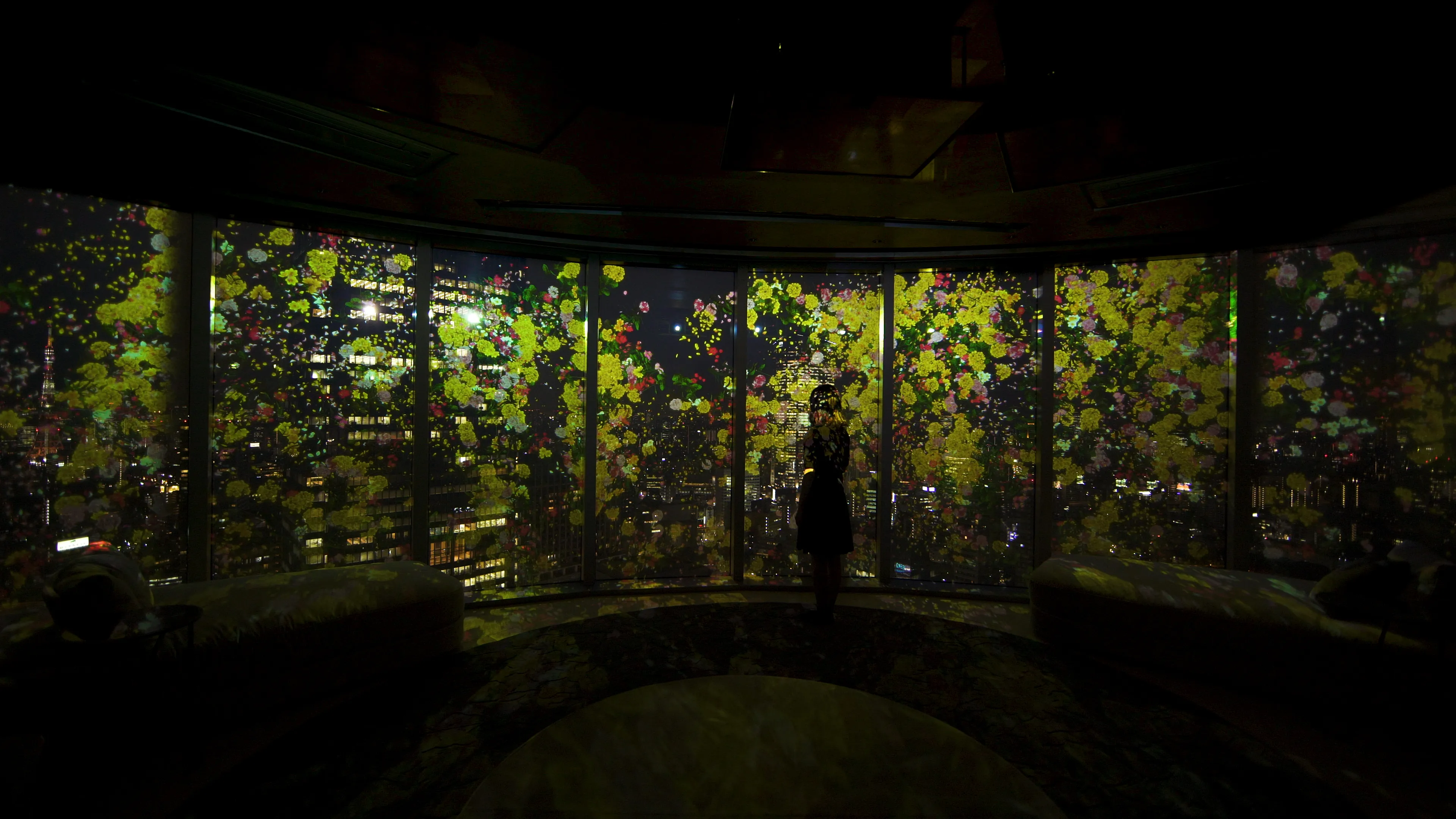 這件藝術作品,借景東京的夜空,花朵們像浮在空中一樣被描繪下來。通過一小時的時間,觀賞一整年的花朵們花開花落,持續變化著。
