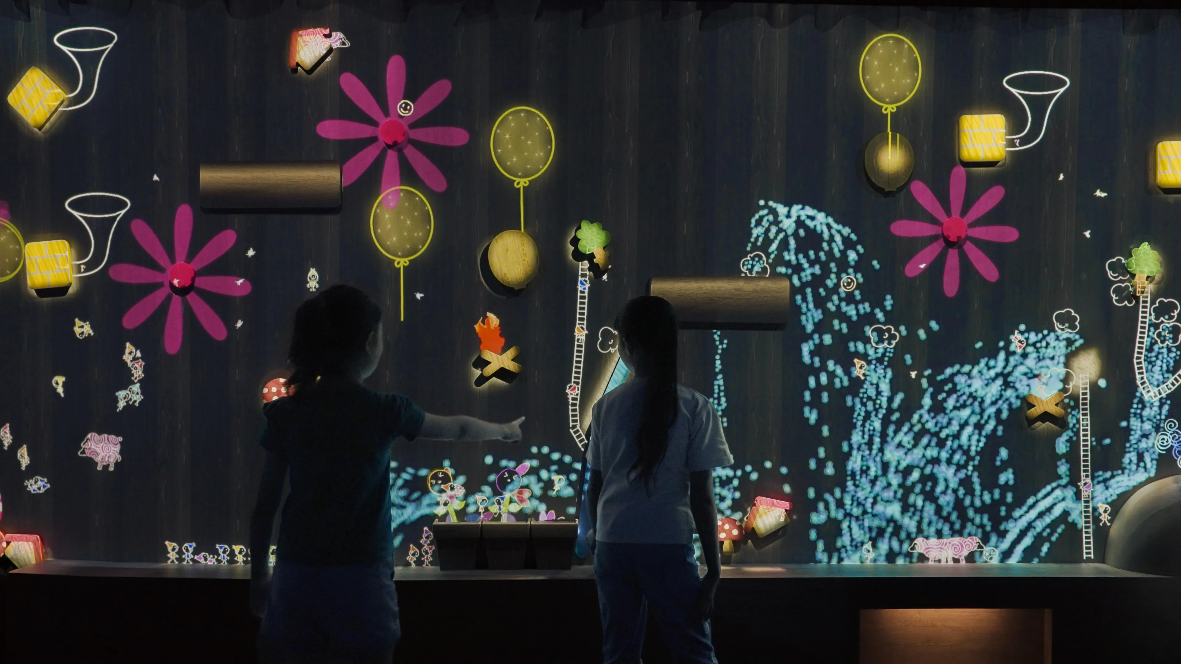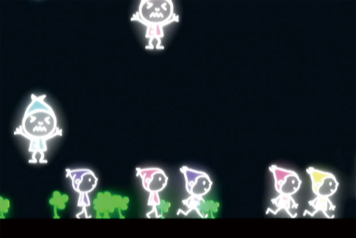 当参观者们在墙壁上面黏附蘑菇、羊小屋、冰柱等各式各样的图章时,图章会出现在小人儿的世界里。他们会注意到这些东西并且跳到上面去。