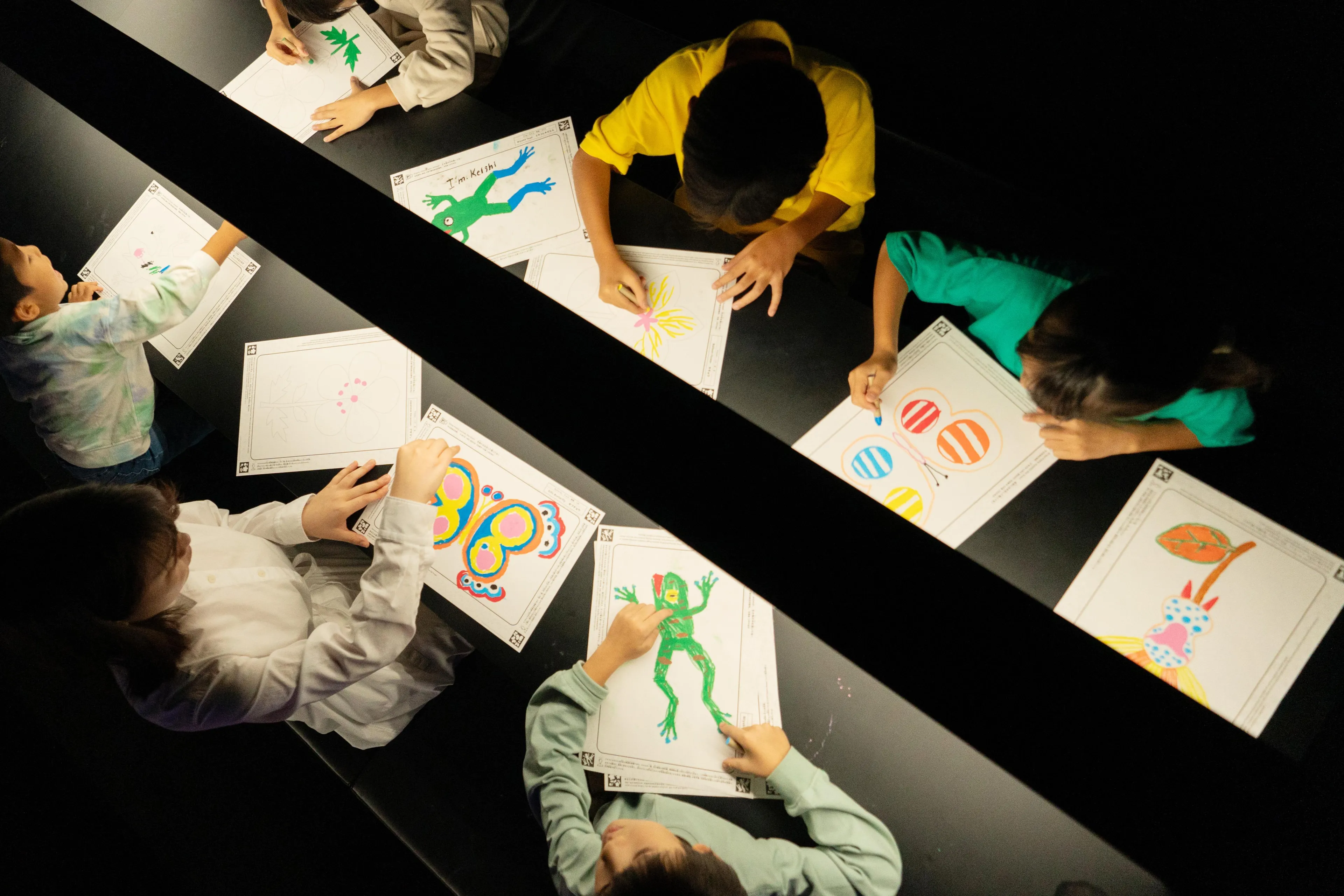 大家一起描绘出各种生物,栖息在由高低不平的斜坡打造出的的大型立体空间里。在纸上画出生物。然后,被描绘出来的生物就会像被注入了生命一般,出现在眼前。