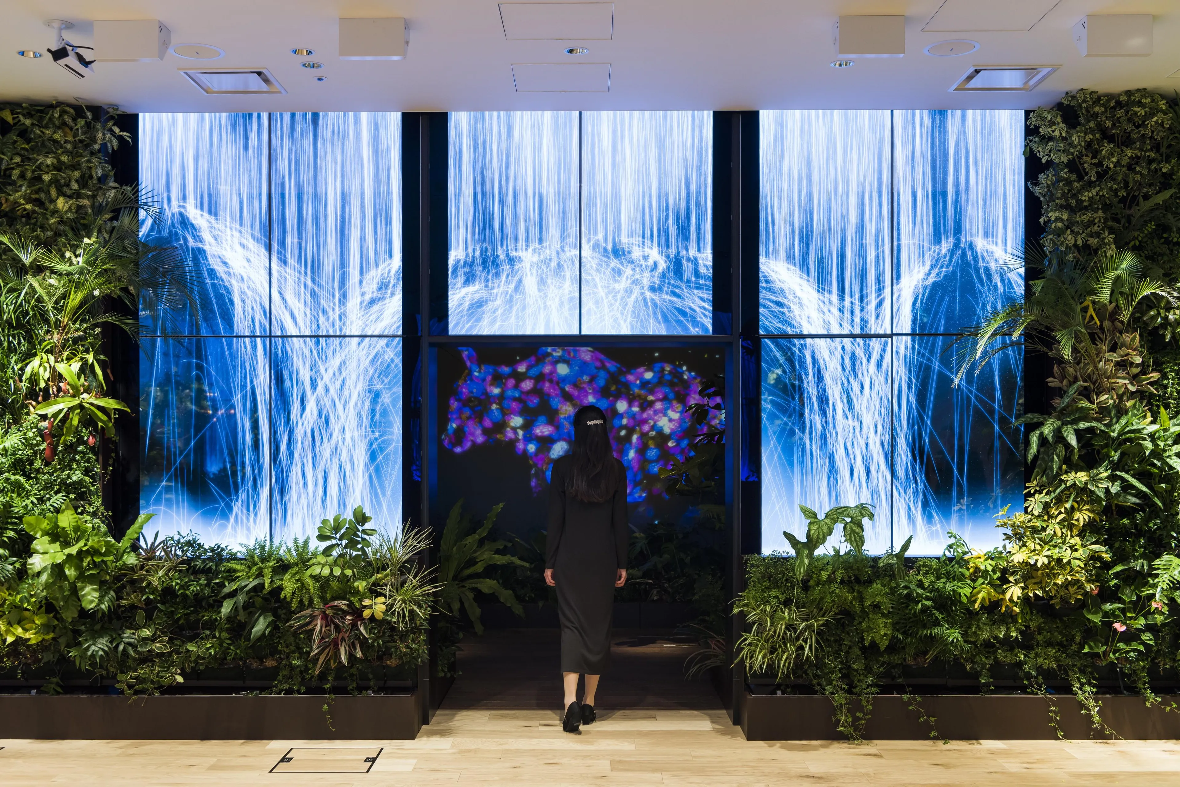 入口处的瀑布通过电脑程式实时地不断进行描绘,并不是将预先制作好的影像进行放映。从整体来说,并不是复制以前的状态。眼前这一瞬间的瀑布,错过就无法再看到第二次了。本作品中的瀑布通常作为入口和其他空间之间的蒙眼作用而存在。