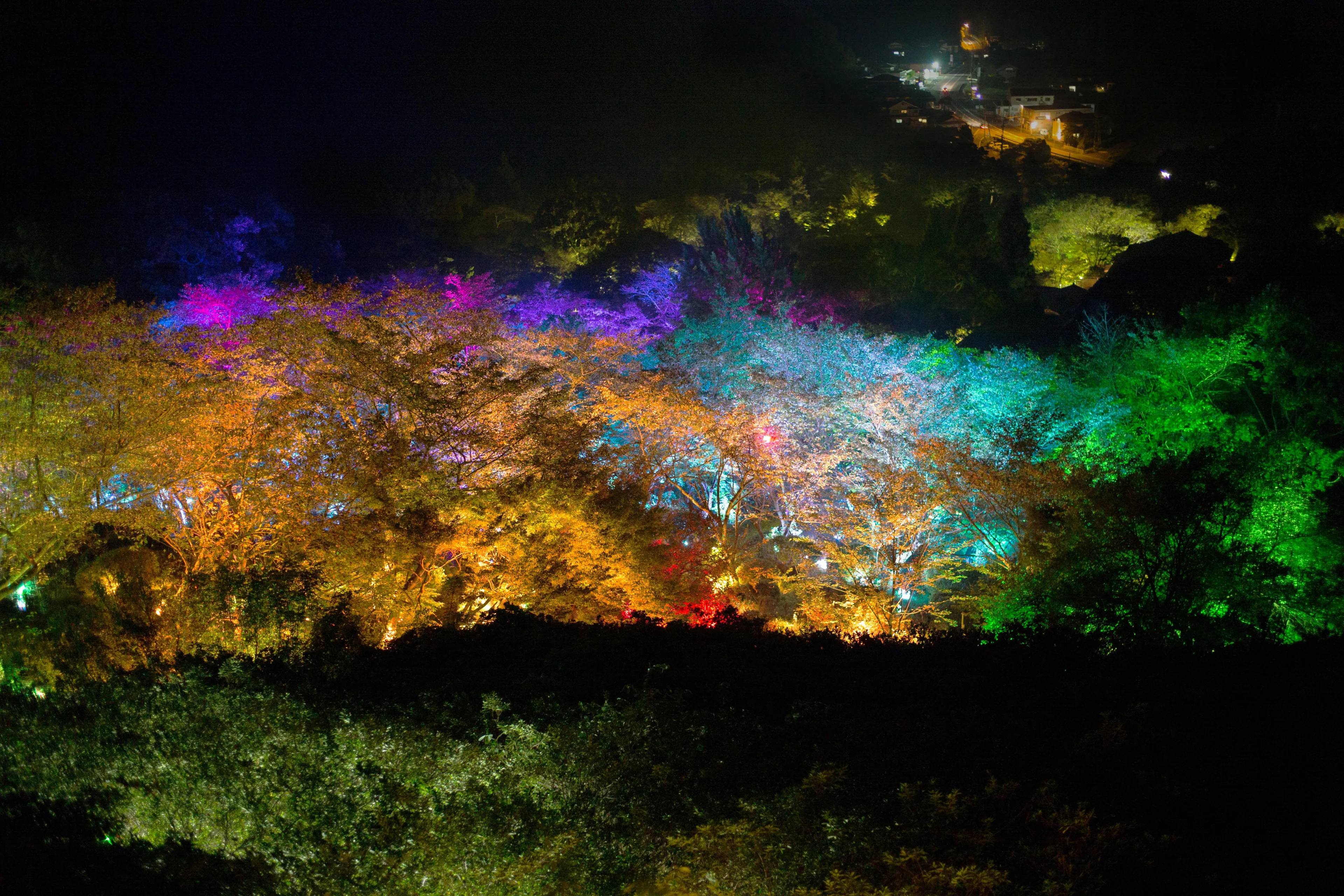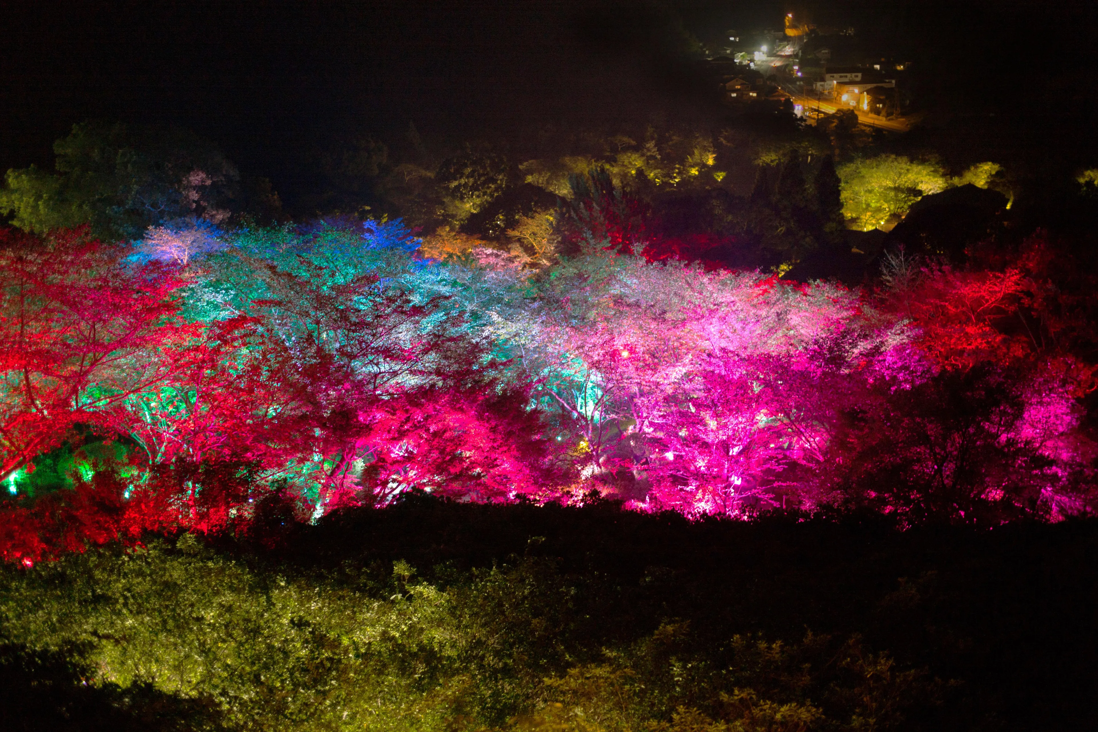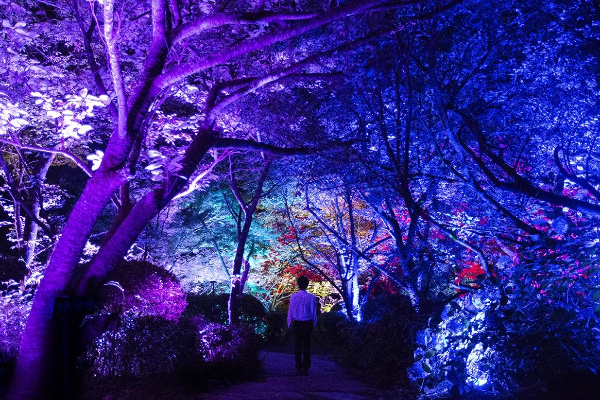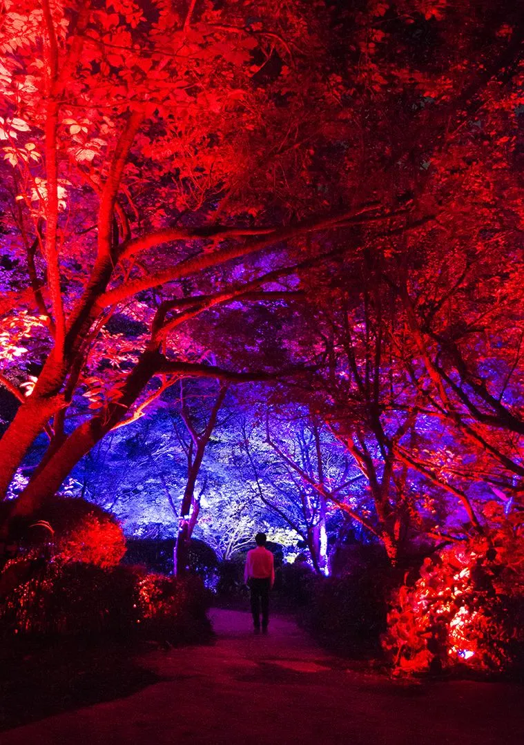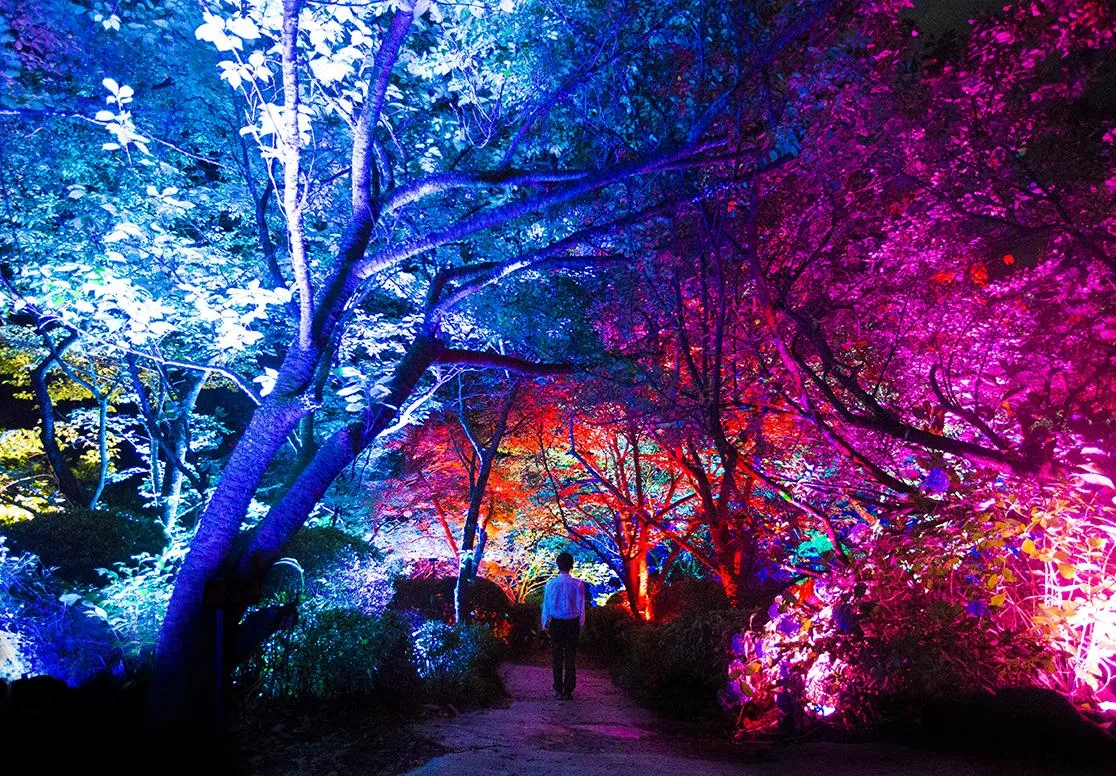 御船山乐园里的樱树透过灯光投射发出灿烂的光芒。