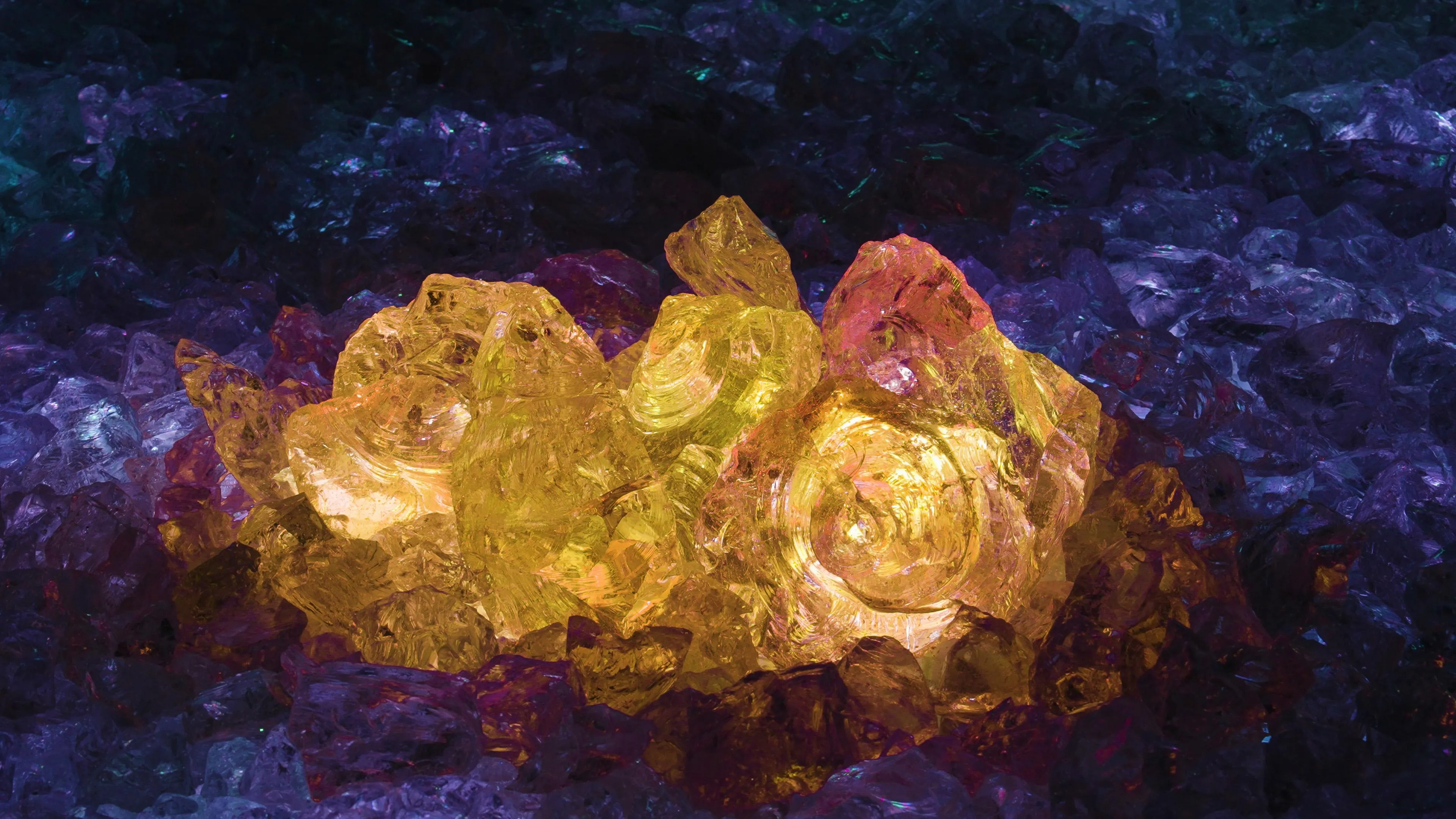The artwork is created using glass rocks collected from the crushed glass that remains in the melting furnaces of a glass factory.