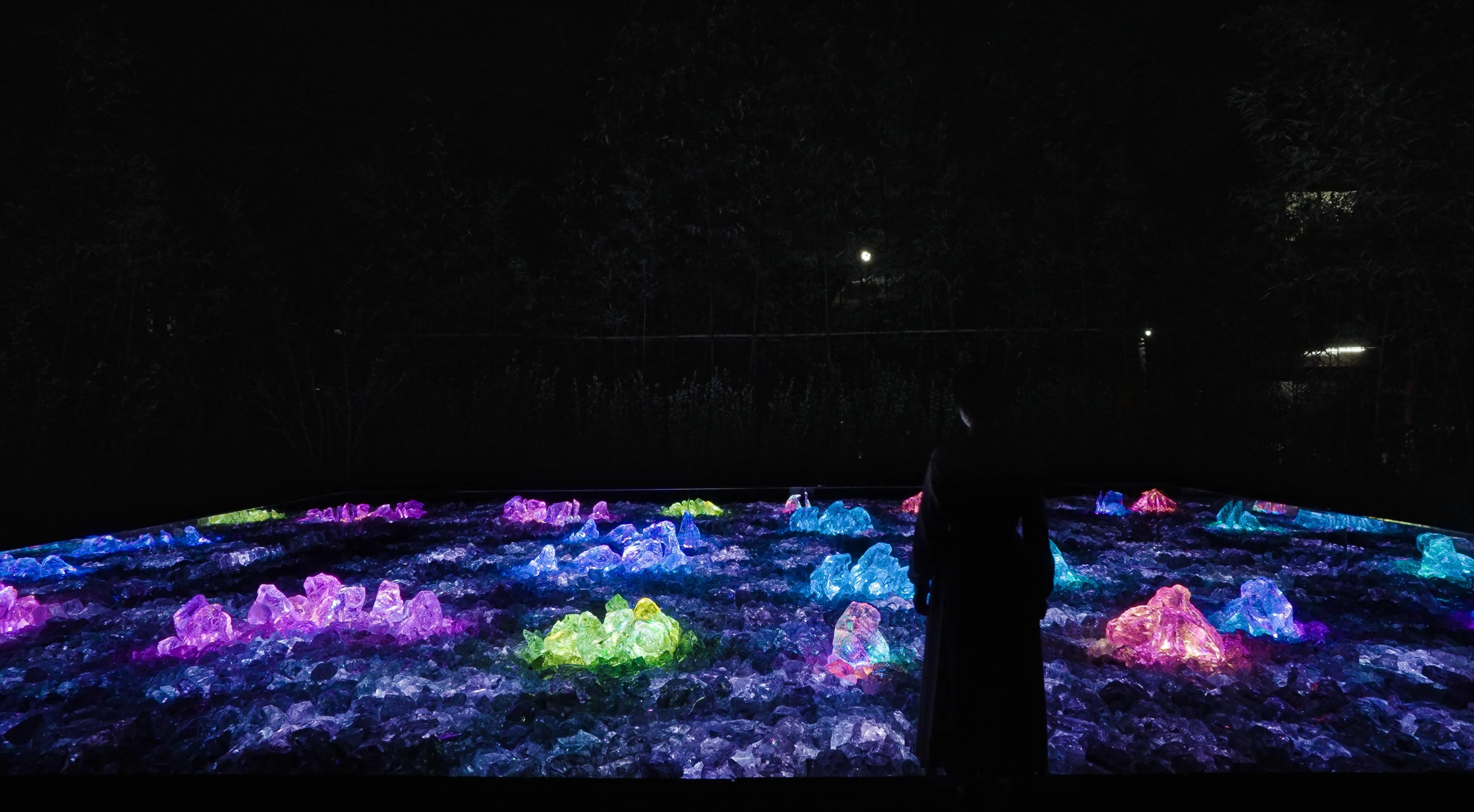 At night, the light inside the rocks solidifies and melts into each other. The garden changes depending on people's actions.