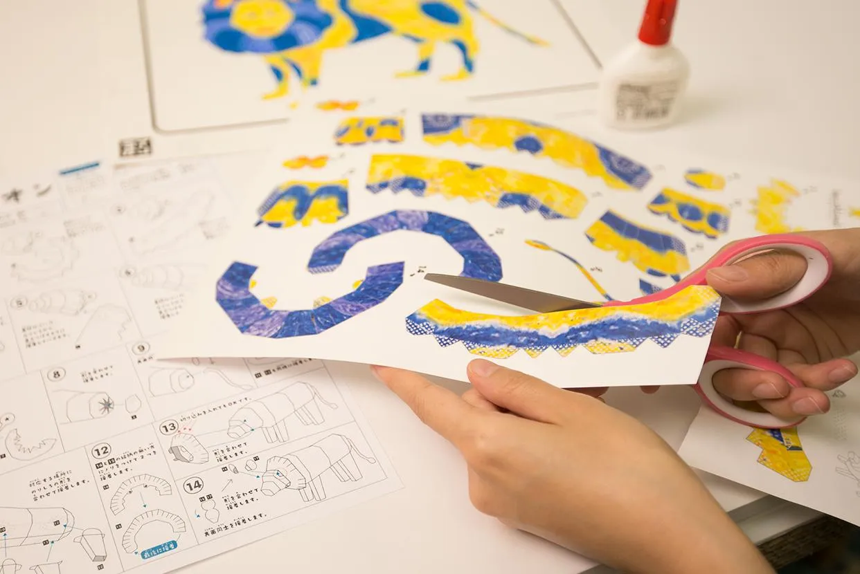 用蜡笔在纸上画好的动物可以做成立体纸模型的展开图,组装展开图,即可在立体纸模型世界中创造出属于自己的三维动物。