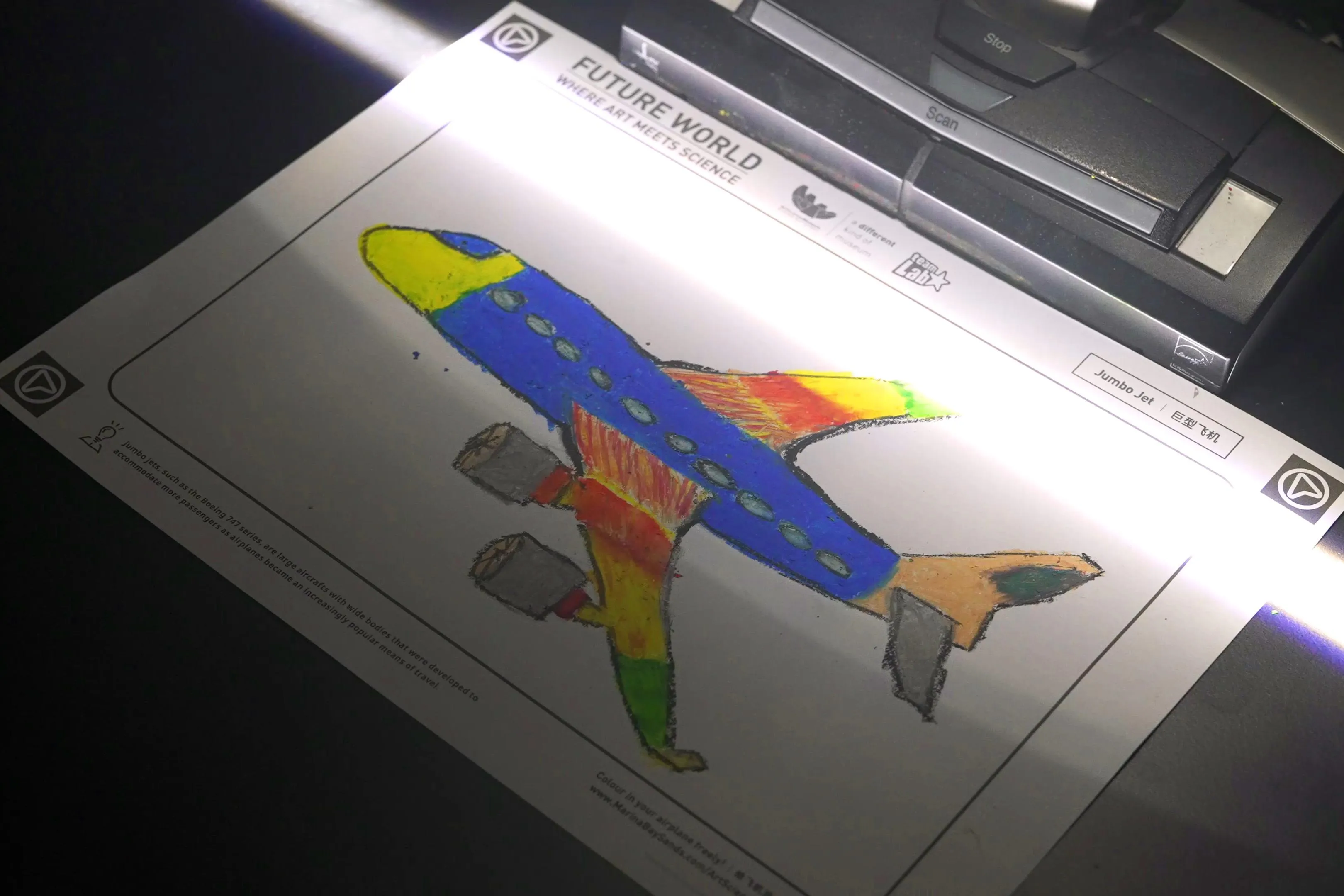 在画有飞机、蝴蝶和鹰轮廓的纸上涂色。2