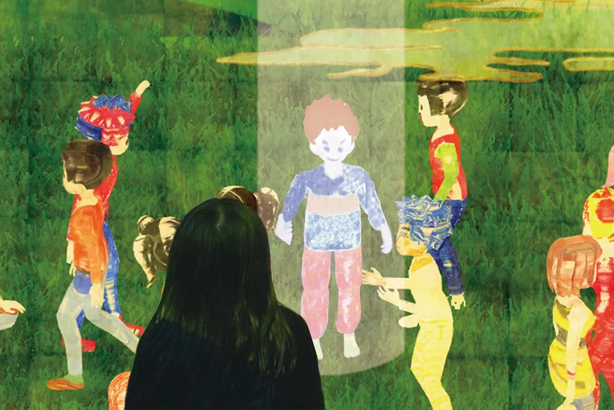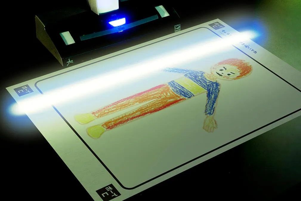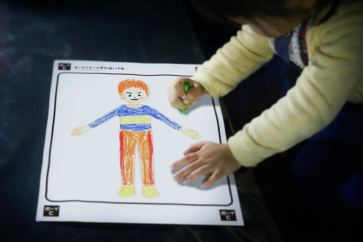 在纸上画出人,并看见其投影在面前的大屏幕上。渐渐地,屏幕中的人们开始互动。触摸屏幕上的人时,他们会因受到惊吓,而作出各种反应。