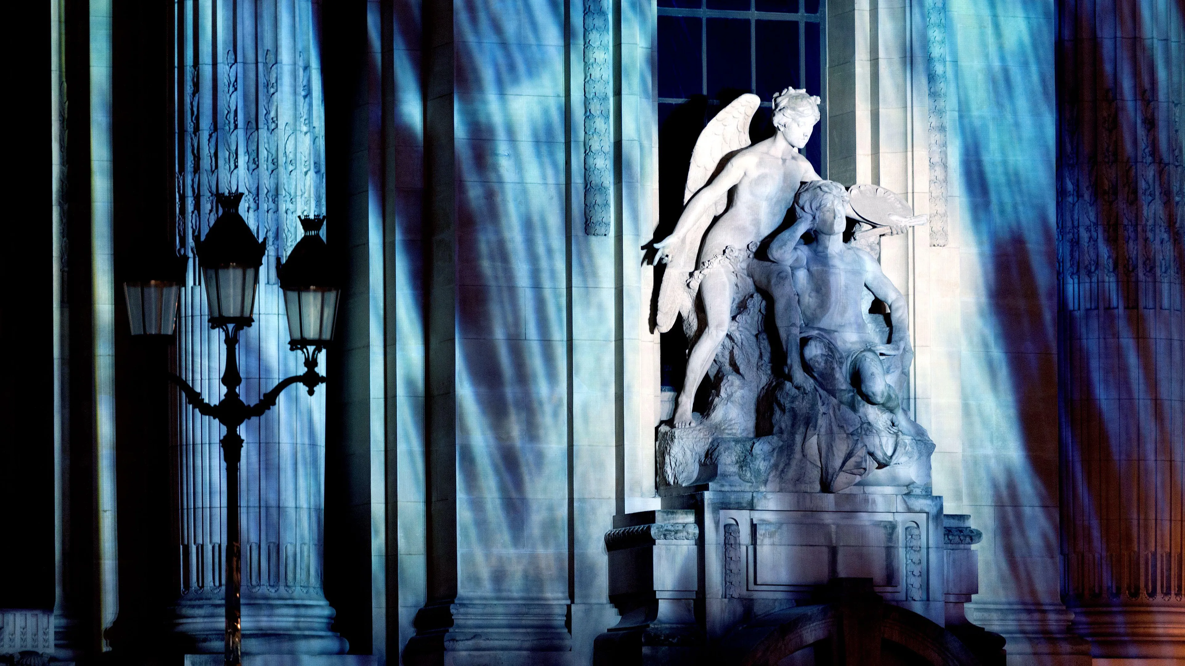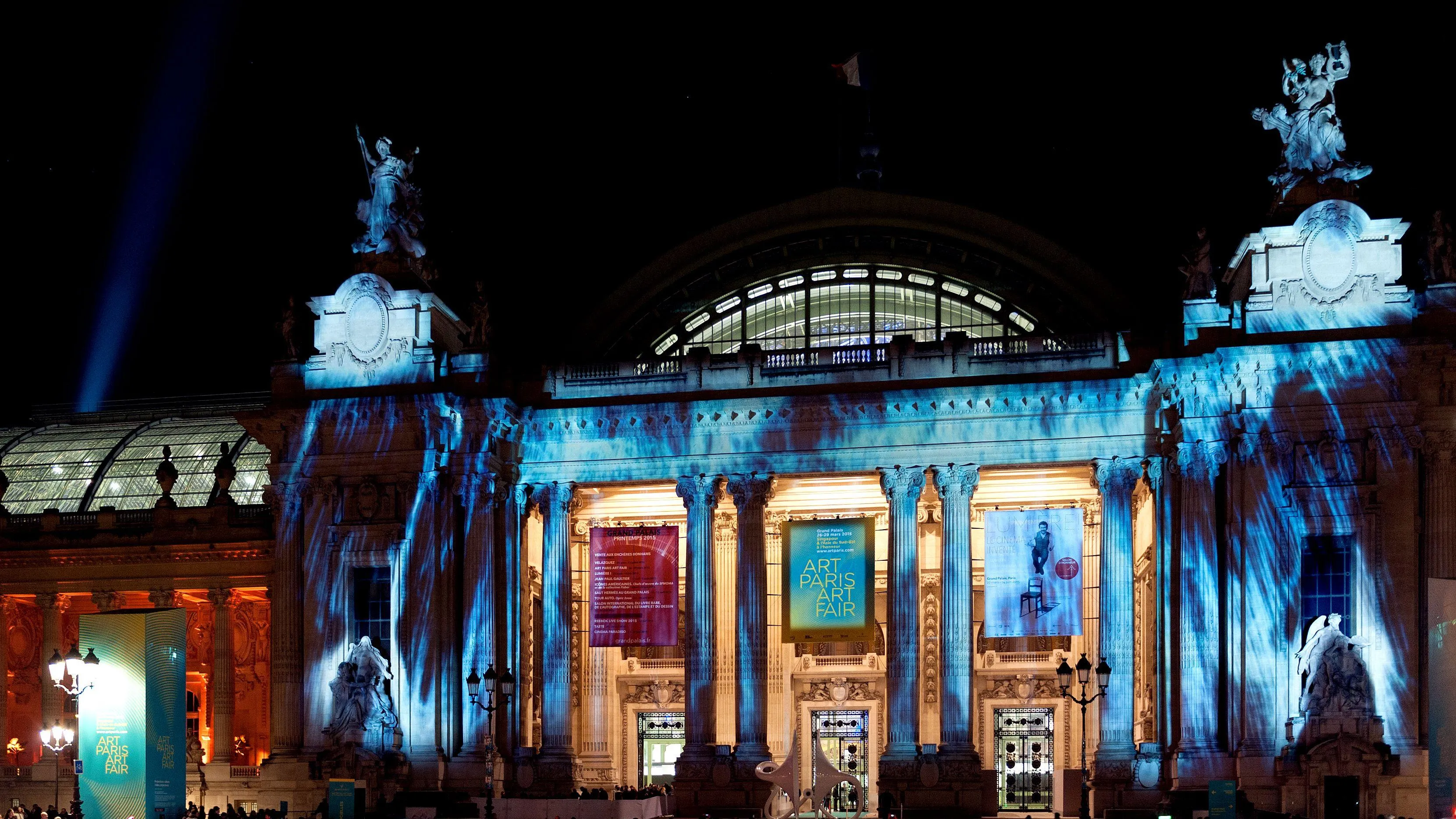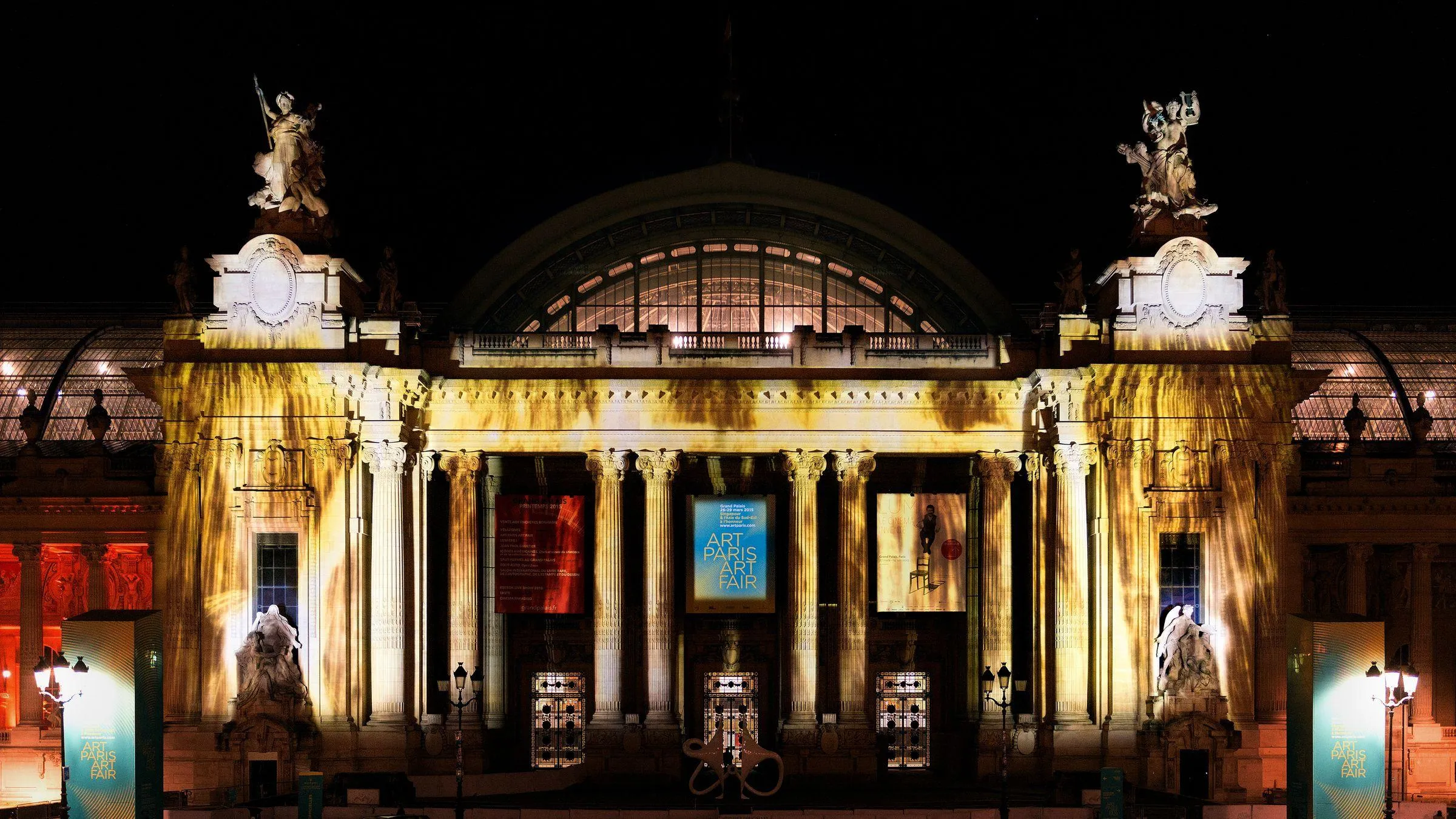 for the art paris art fair 2015, teamlab have transformed paris’ historic grand palais into an immersive, ever-evolving waterfall. the projection-mapped simulation has been calculated by tracking the movement of water falling on a 3D model of the structure in a virtual computer environment. ‘universe of water particles on the grand palais’ is expressed as continuum of hundreds of thousand of droplets that flow in accordance with how the computer calculates the interaction of the particles.(Excerpt from text)