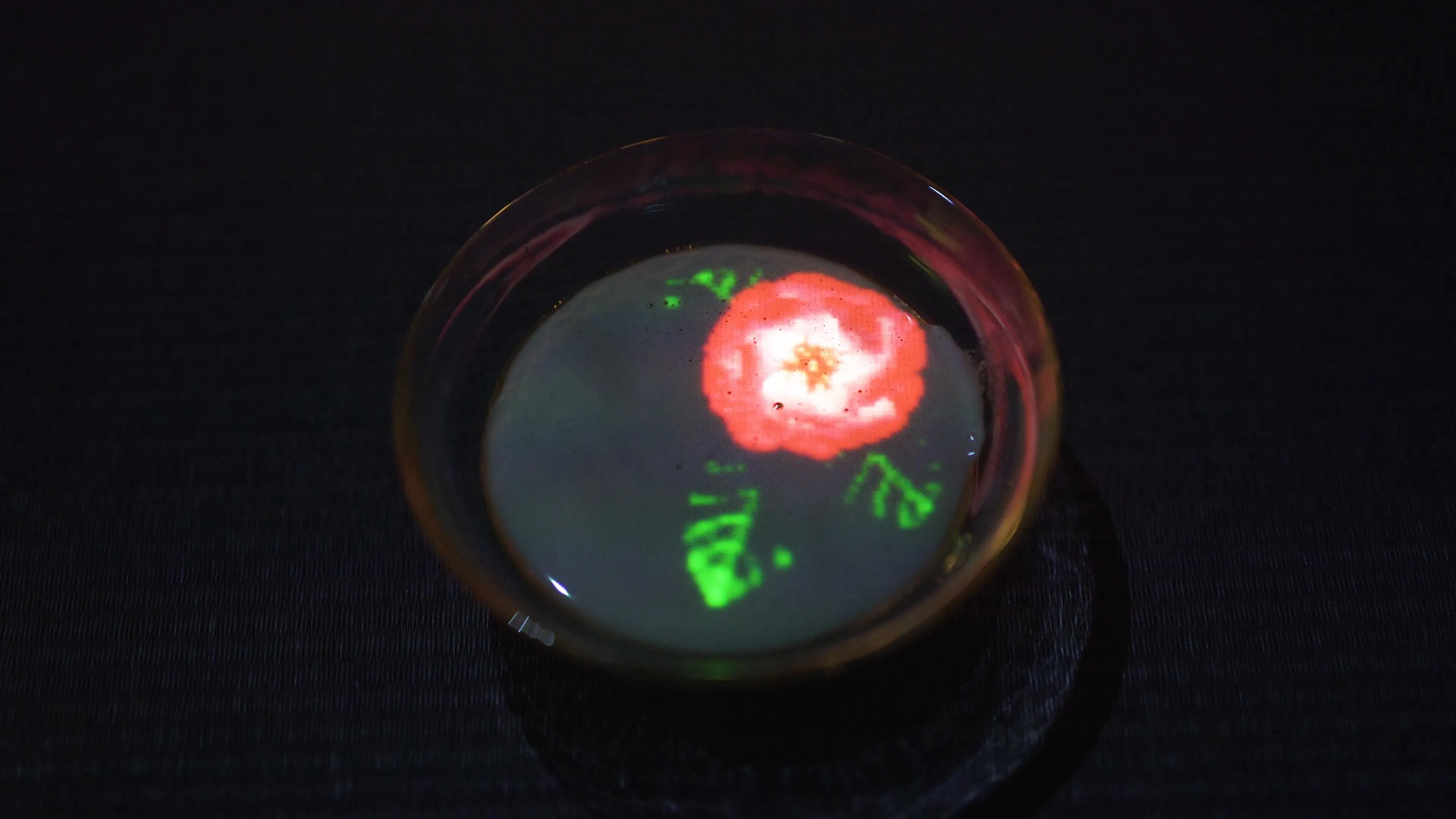 茶是一種容易變化的存在,根據茶碗中茶水量的不同,茶水面積大小也會不斷改變。配合著這個變化,所誕生花朵的大小也會跟著改變。當茶水從茶碗之中濺灑而出時,該處也同樣會綻開花朵。