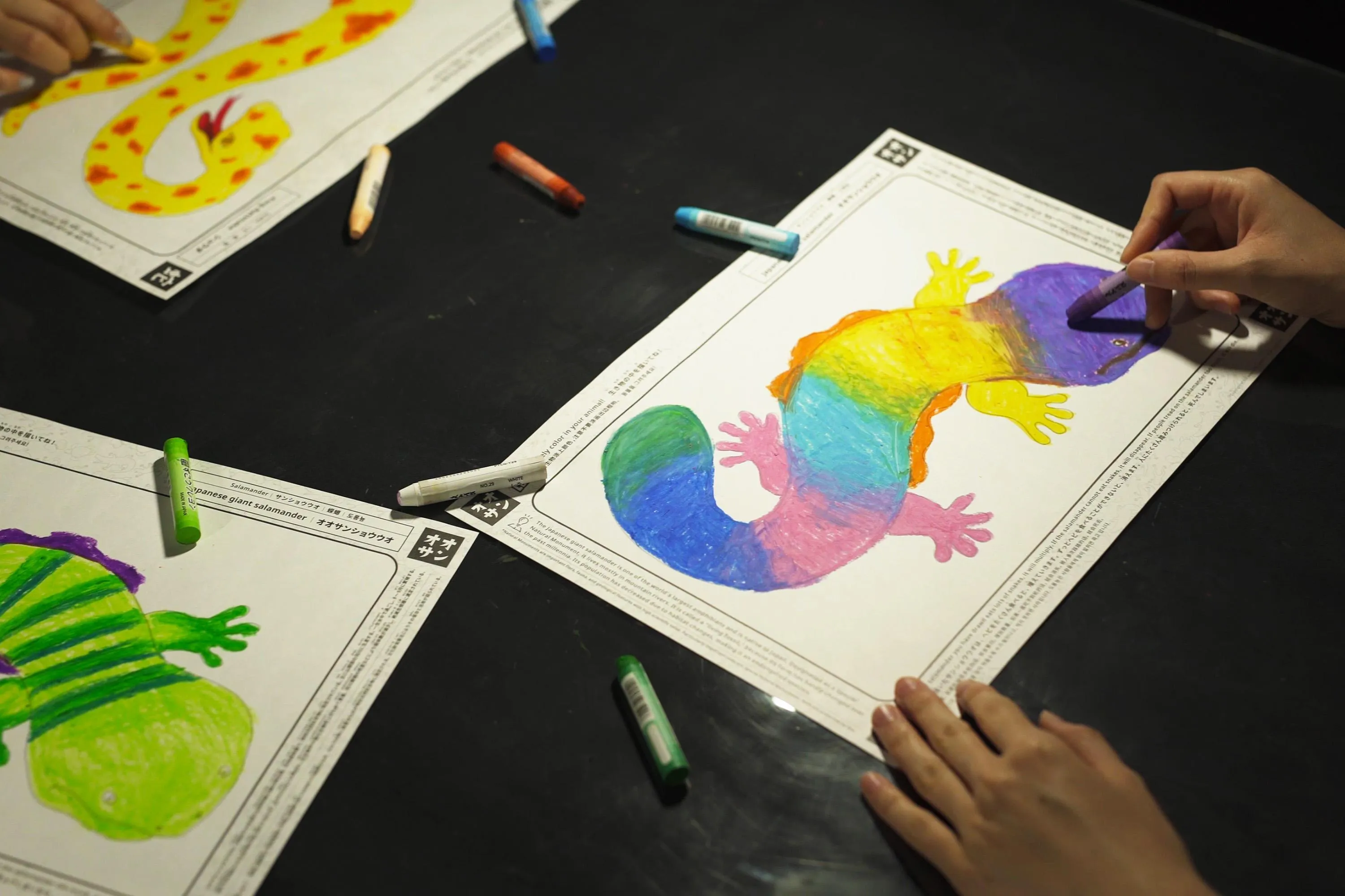 大家一起描繪出的各種生物,棲息在鼓動的洞穴里。在紙上繪畫出生物,描繪下的生物彷彿被注入生命,出現在眼前。