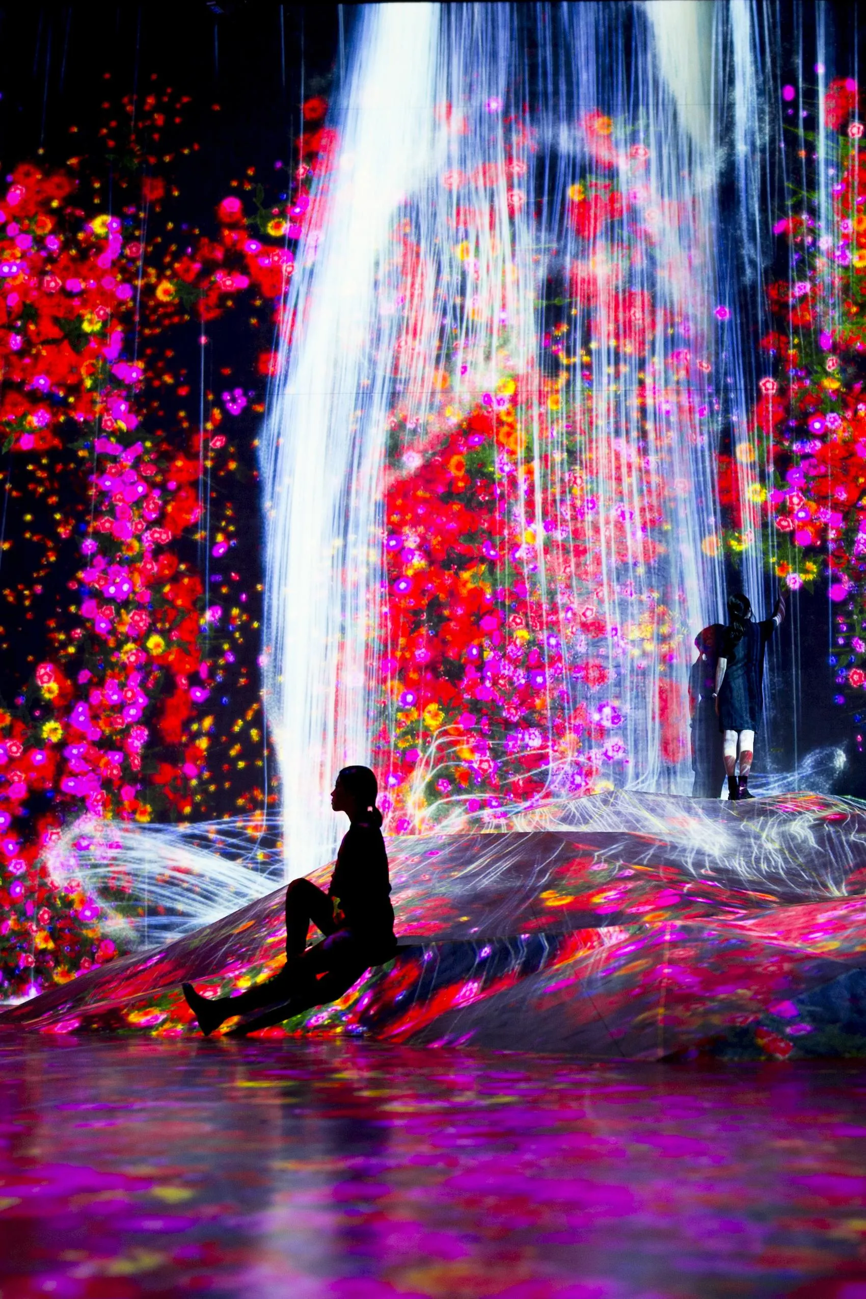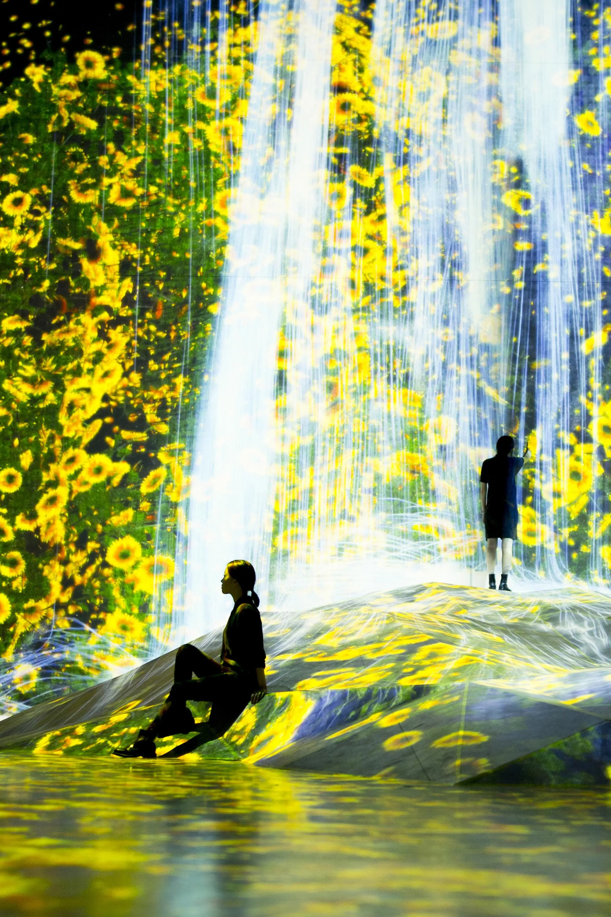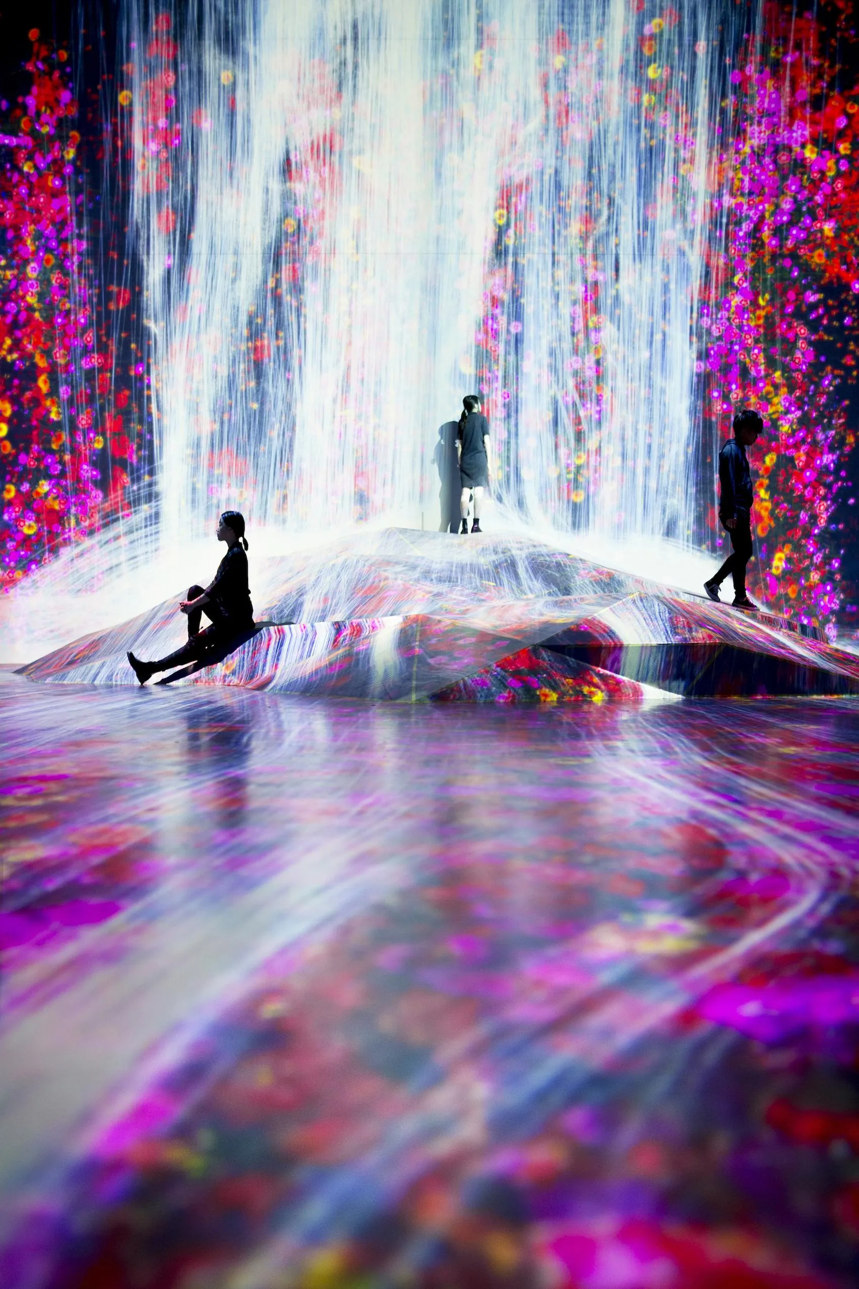 “因人存在的岩石”在虛擬的三維空間中立體再現,水落從那裡流下,根據岩石的形狀模擬水的運動,並描繪出瀑布。水用無數水粒子的連續體來表現,計算粒子之間相互影響的關係,接著根據這些水粒子的移動在空間中描繪出線。而這些“線的集合”就在teamLab所構想的超主觀空間中,被平面化,且形成了瀑布。