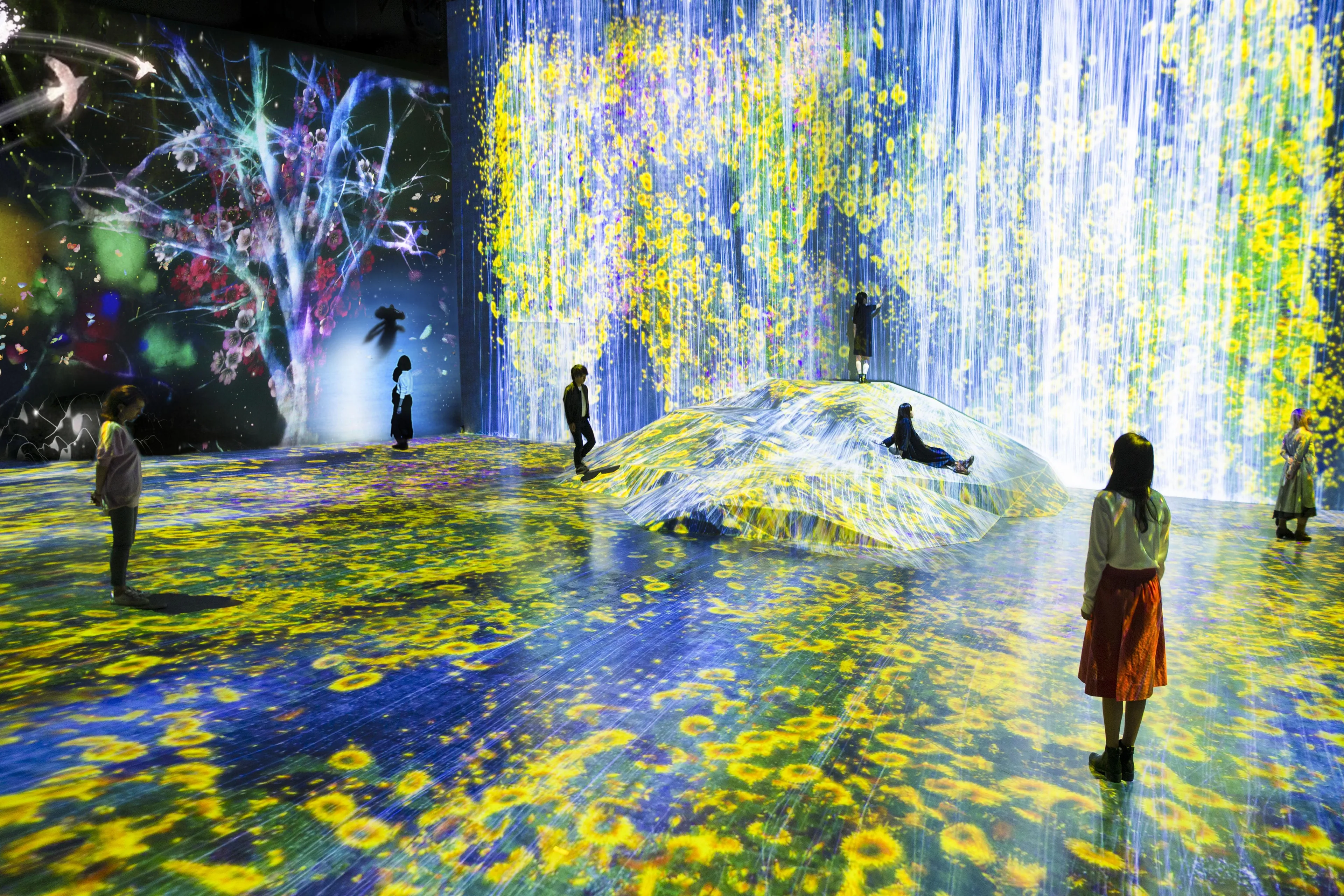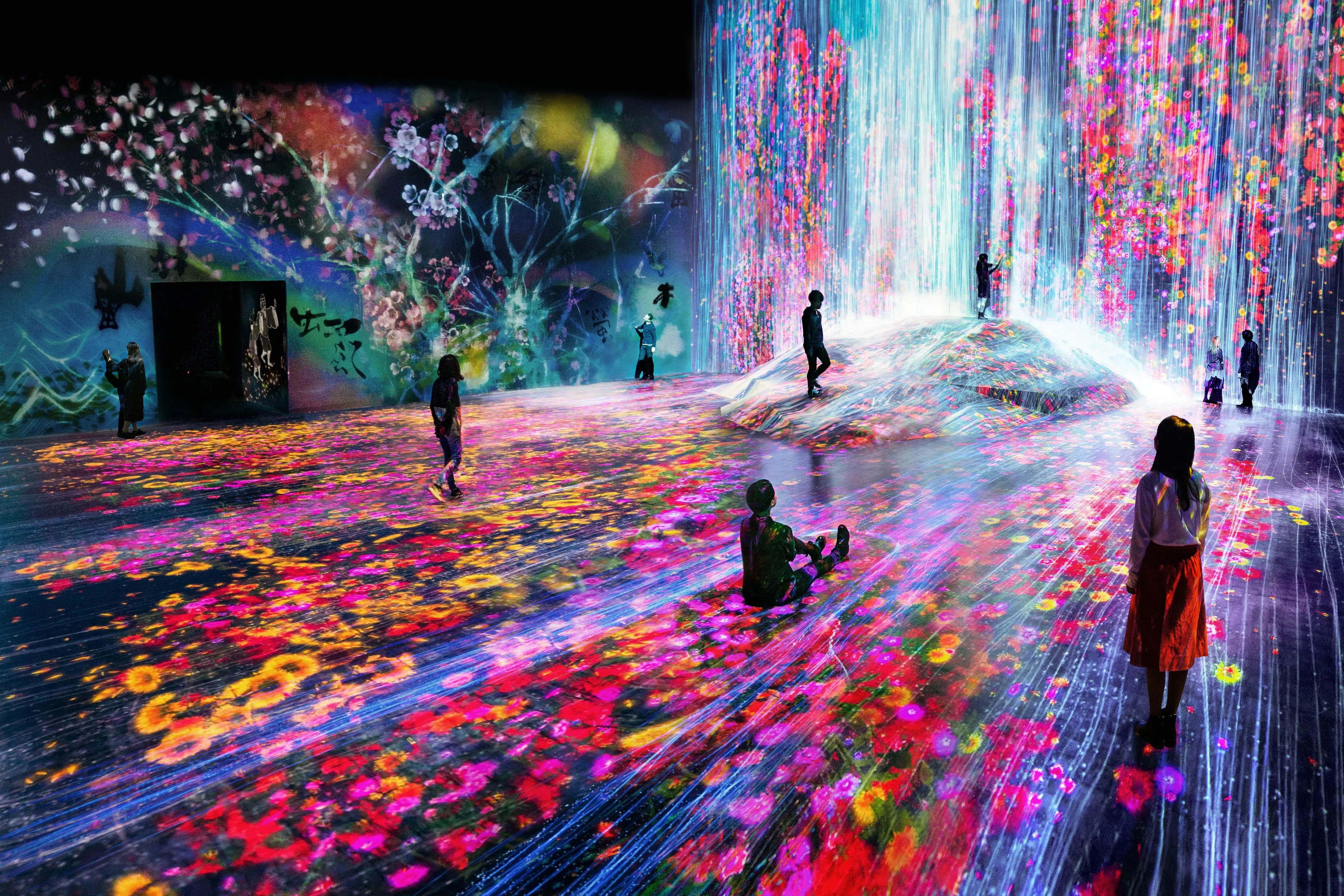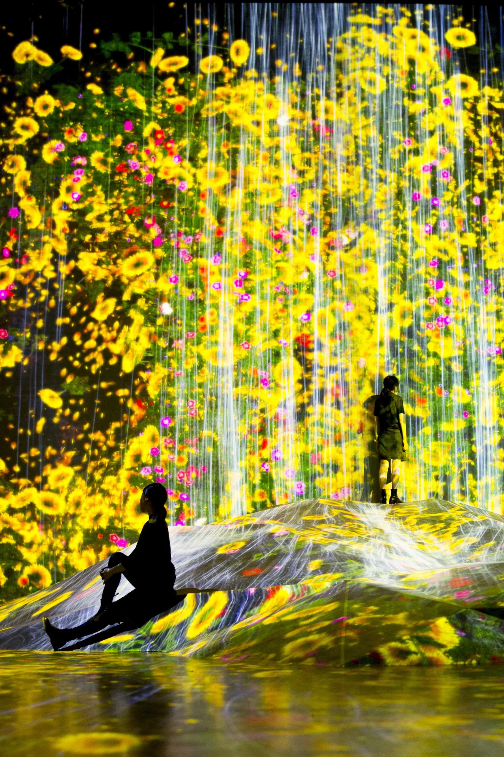 “因人存在的岩石”在虛擬的三維空間中立體再現,水落從那裡流下,根據岩石的形狀模擬水的運動,並描繪出瀑布。水用無數水粒子的連續體來表現,計算粒子之間相互影響的關係,接著根據這些水粒子的移動在空間中描繪出線。而這些“線的集合”就在teamLab所構想的超主觀空間中,被平面化,且形成了瀑布。
