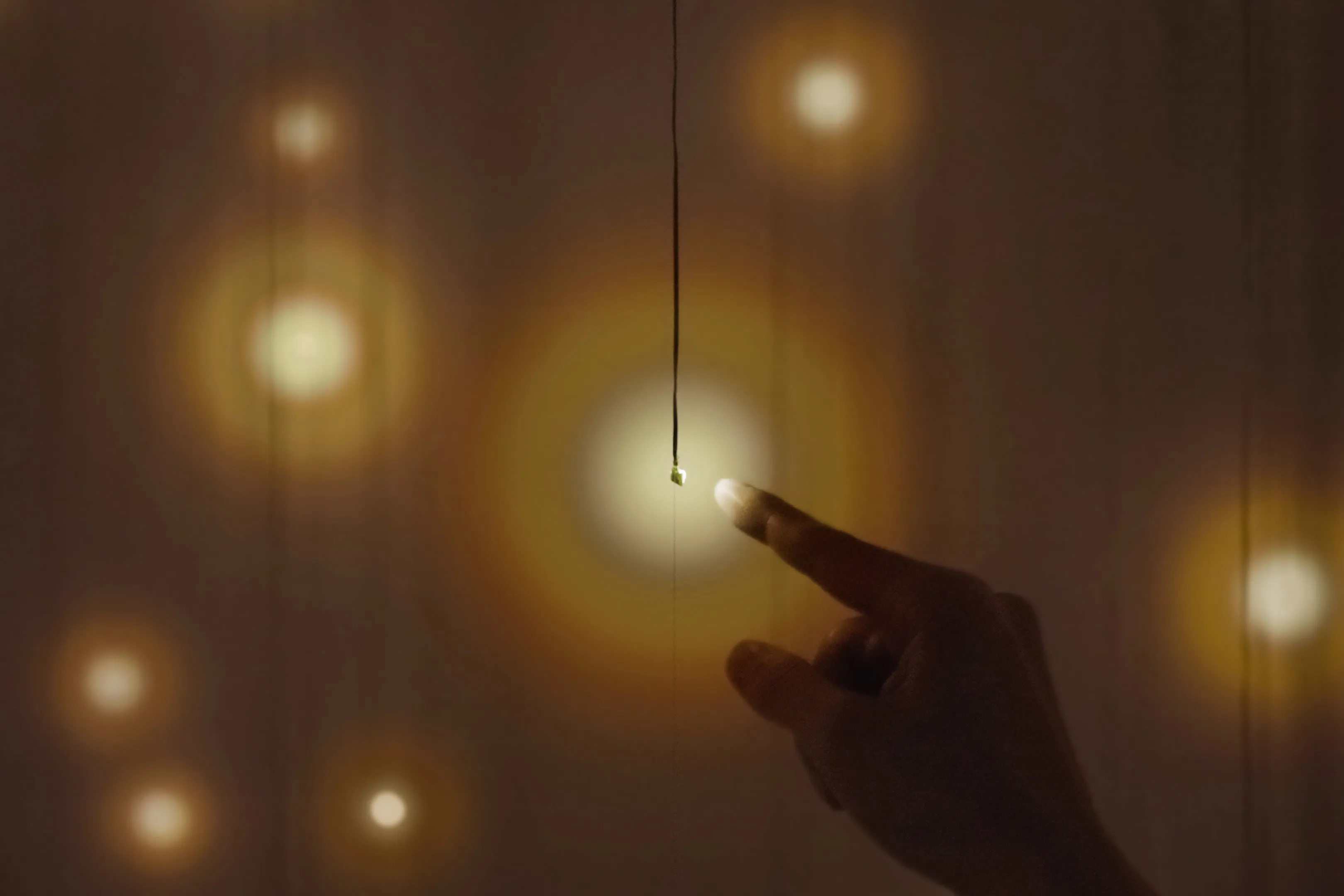 If you approach a sphere of light, the sphere shines brightly and the surrounding spheres respond one after the other.