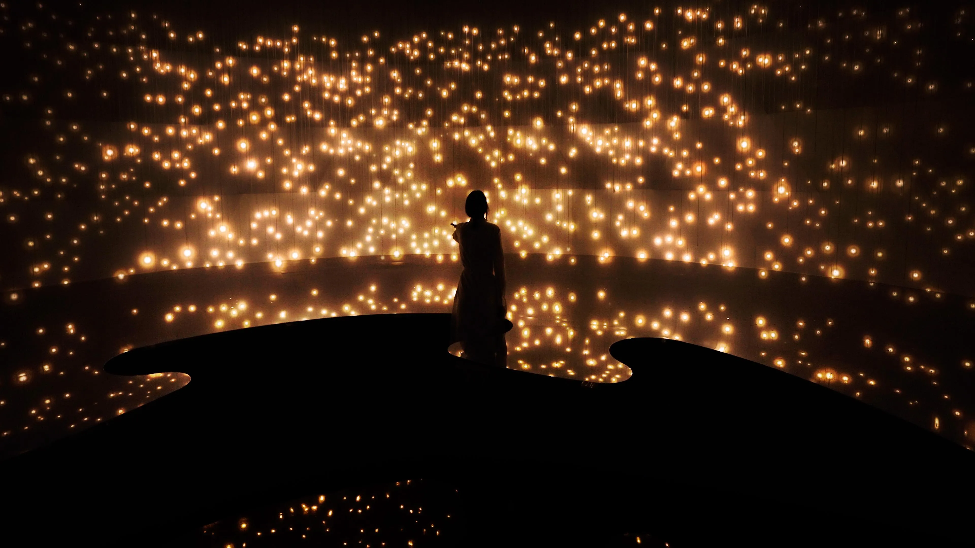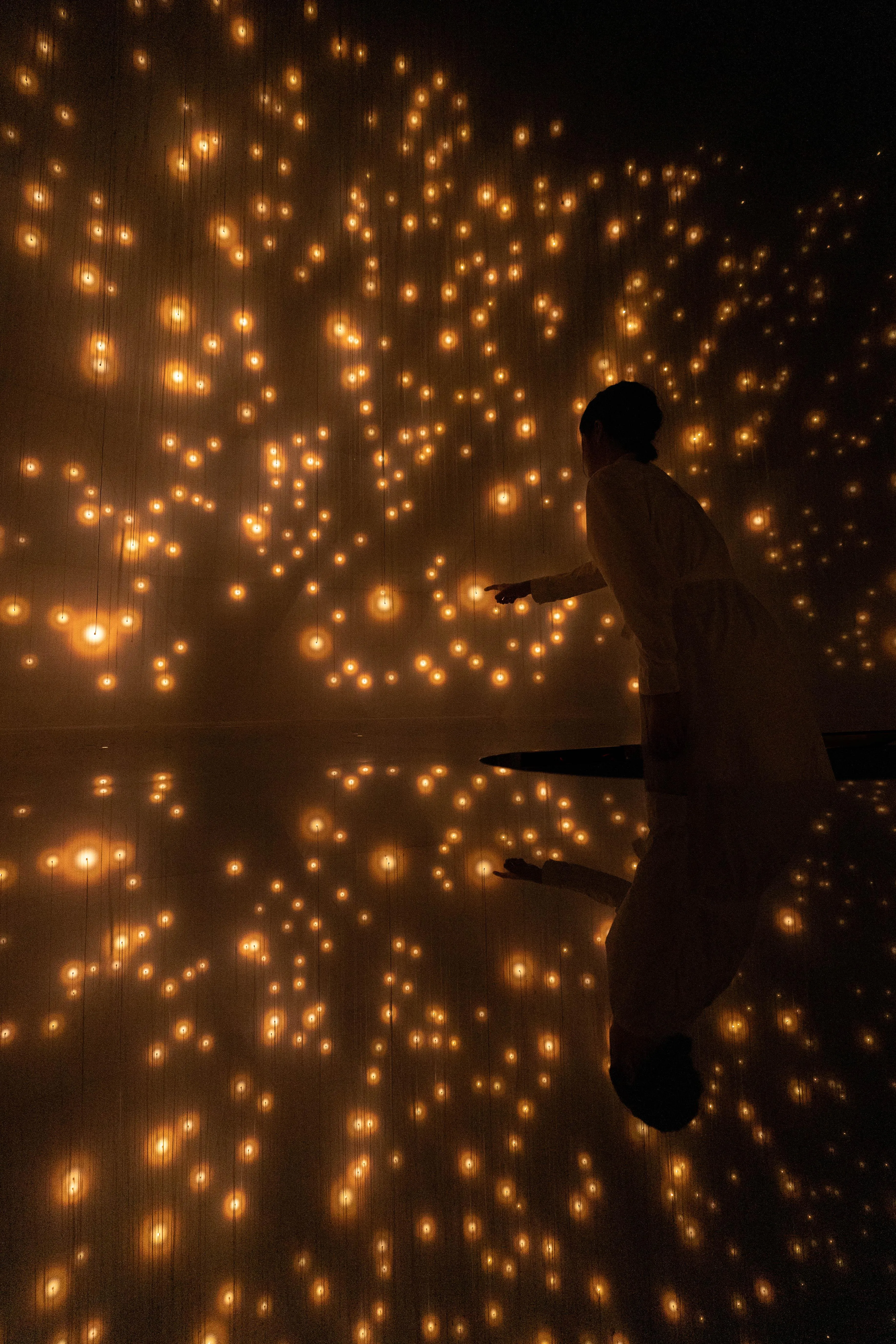 每一個光球,都仿佛是凝固的光凝固了之後形成的僅由光構成的團塊一般,在空間中能夠被清晰地感知,但卻沒有物質層面上的表面。人們對於作品與身體之間邊界的認知也是模糊的。