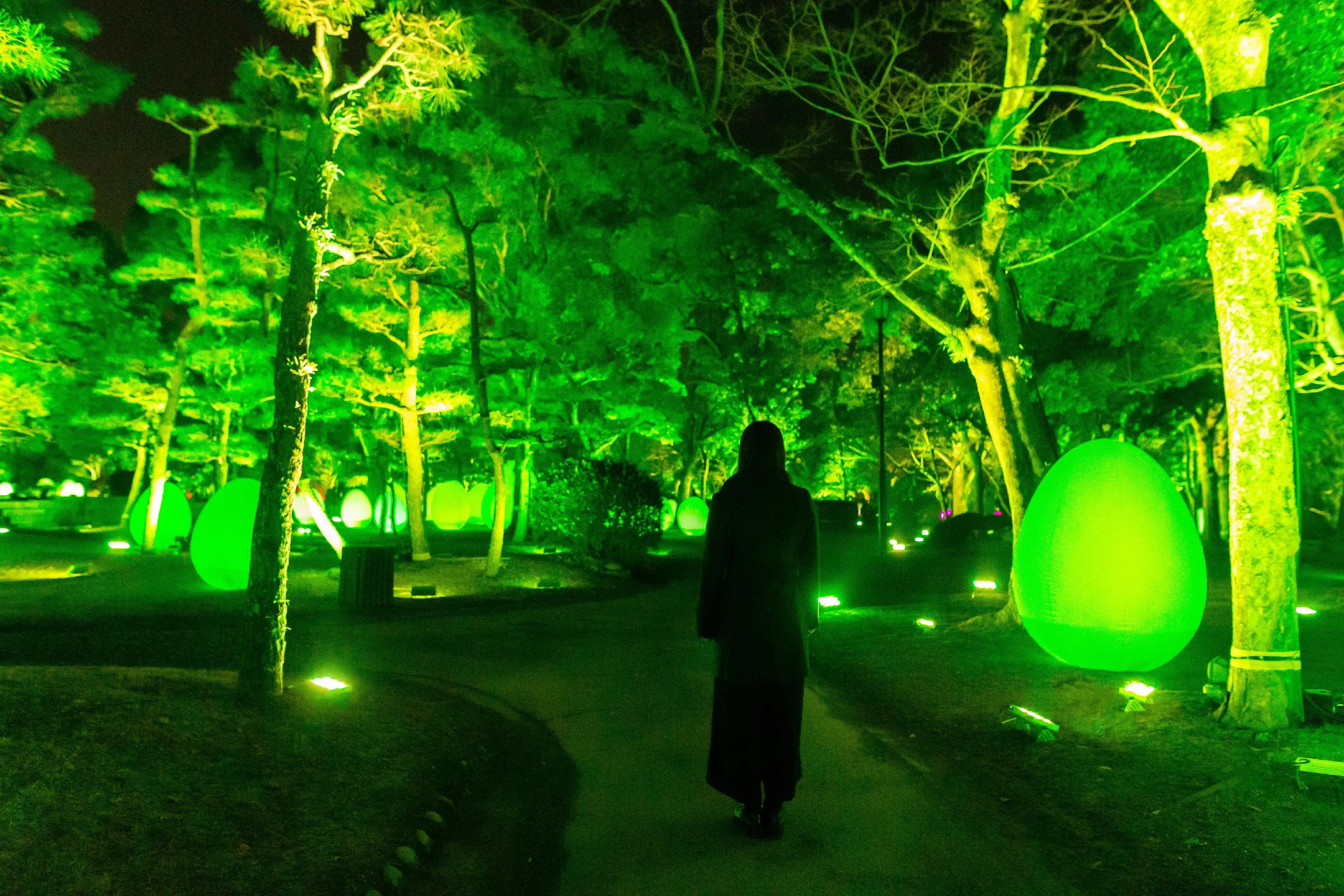 The resisting and resonating ovoids placed in the castle ruins, together with the trees of the castle, shine brightly. The light of the ovoids and the light of the trees are autonomous, they shine brightly and then fade slowly, as if breathing.